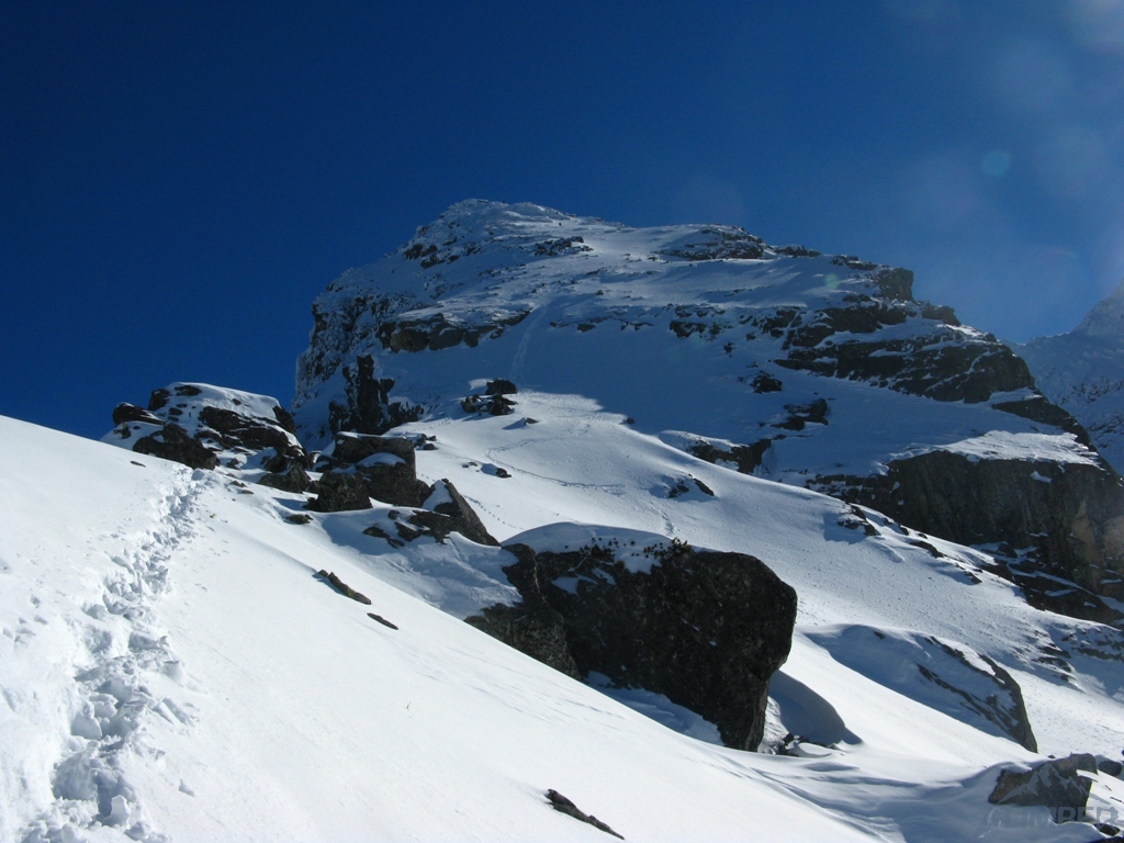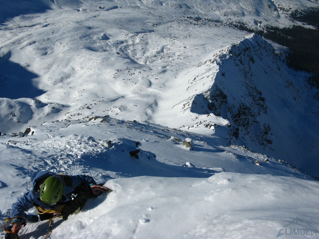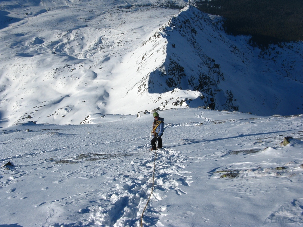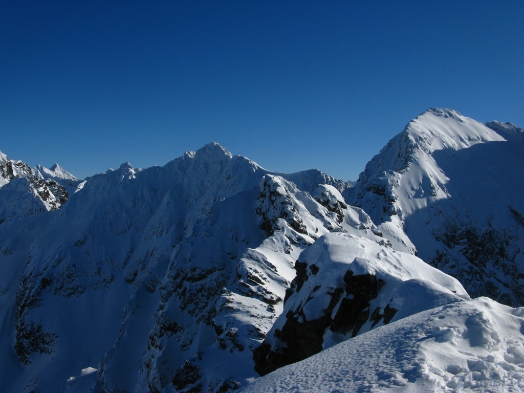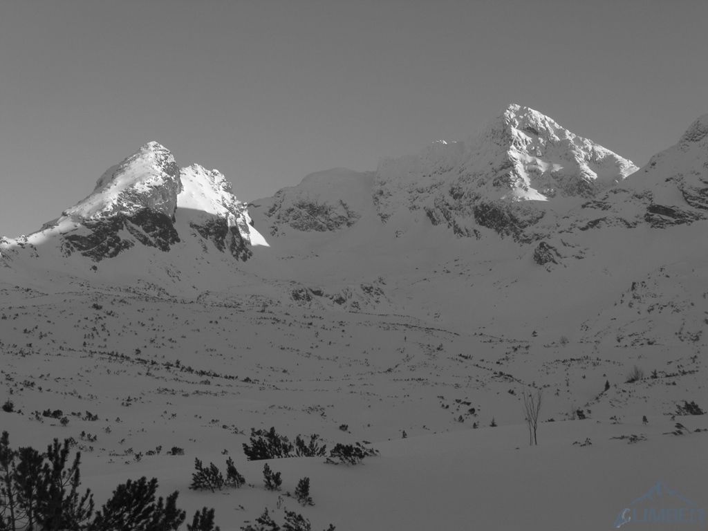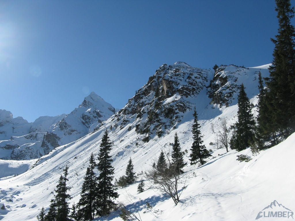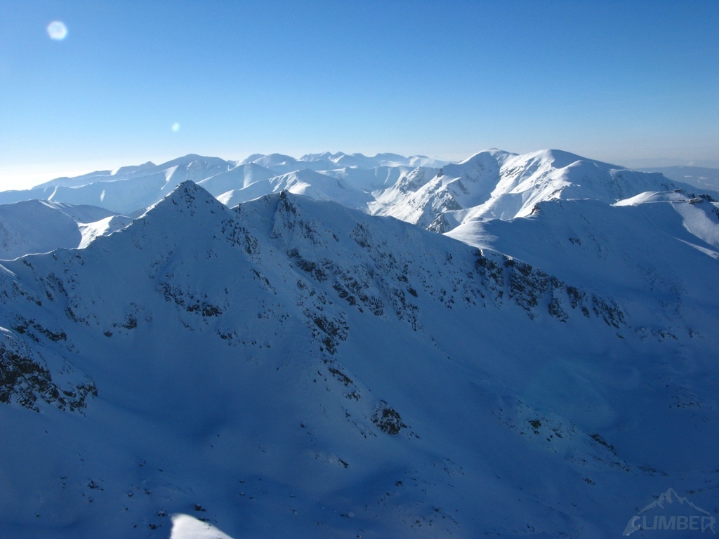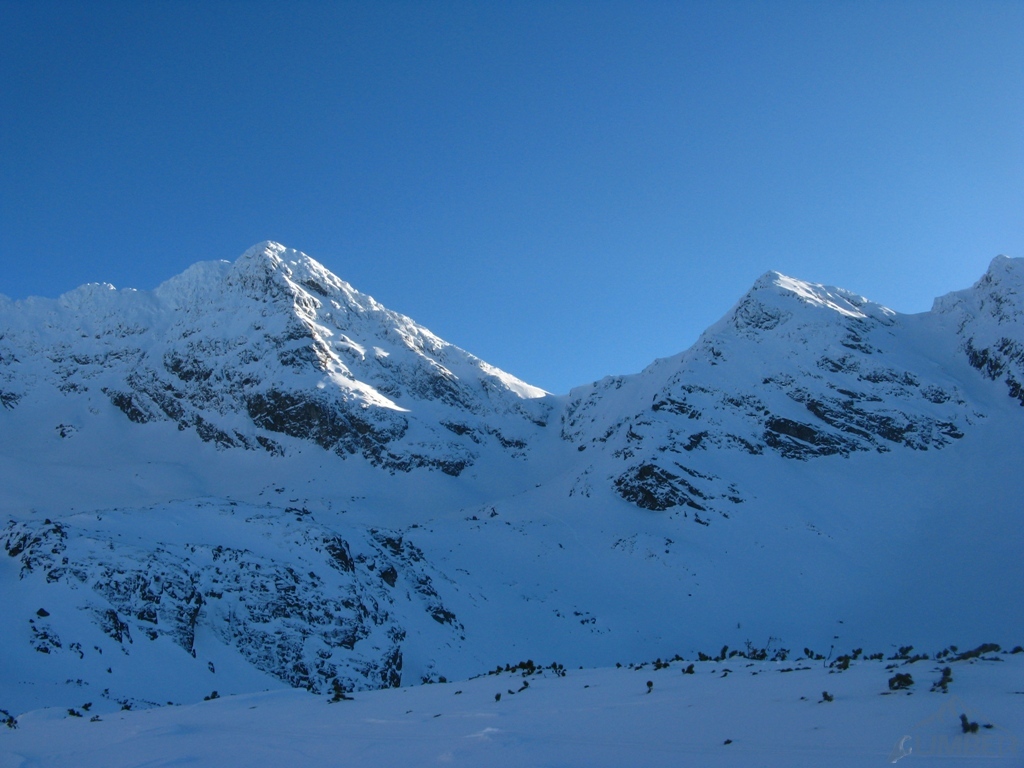 Weekend z Ulą na Hali. Pierwszego dnia wychodzimy na Kościelec, przy okazji trenujemy poruszanie się na lotnej, hamowanie czekanem i inne zagadnienia z kursu zimowej turystyki wysokogórskiej. Początkowo chcemy wyjść od strony Czarnego Stawu ale śniegu jest bardzo dużo, więc obchodzimy masyw i na przełęcz dostajemy się od drugiej strony.