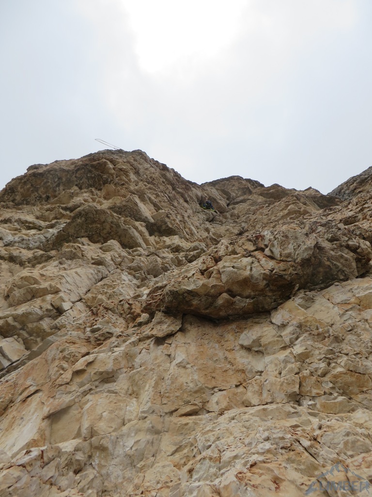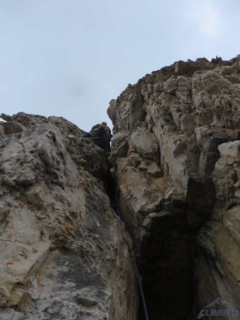 Pierwsze wyciągi prowadzi Grzesiek, wspinanie jest faktycznie wymagające, ale na szczęście wyceny są “ludzkie“ więc dajemy radę z wystarczającym zapasem. Po krótkim łatwiejszym odcinku przejmuję prowadzenie i nastawiam się na walkę. Ku naszemu pozytywnemu zdziwieniu okazuje się jednak, że zarówno spionowane piątkowe wyciągi, jak i nietypowe trawersy między okapami są dobrze uklamione i nie sprawiają nam żadnych problemów. Martwię się jeszcze tylko o kluczowy wyciąg prowadzący przewieszającym się zacięciem, ale okazuje się, że niepotrzebnie - nie dość, że jest wyposażony w więcej haków niż potrzeba, to na dodatek jest bardzo przejrzysty i dobrze urzeźbiony. Z rozpędu ciągnę jeszcze jeden, bardzo ładny odcinek i puszczam przodem partnera. Chwilę później zaczyna kropić i skała błyskawicznie robi się mokra – włączamy wyższy bieg i jak maszyny „przebiegamy” ostatnie wyciągi, gdzie nadal jest pięknie, aczkolwiek nietrudno. Szczęśliwi, po pokonaniu 13 wyciągów w 5 i pół godziny, kończymy drogę i nie zabawiając długo na wierzchołku zbieramy się do opuszczenia turni.