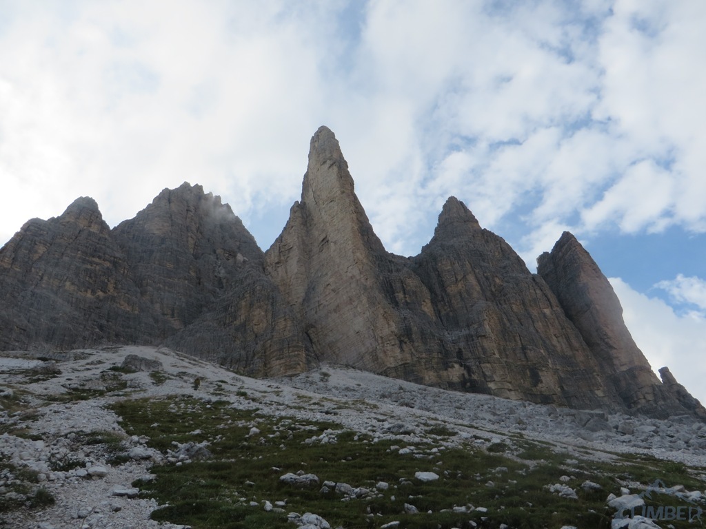 Czas na "danie główne" wyjazdu – słynną i obleganą drogę Spigolo Giallo (Żółty Filar) na Cima Piccola, wycenioną na VI+. Ruszamy już o 5 rano bo pod słynne Tre Cime di Lavaredo czeka nas 1,5 godziny jazdy – niewyspanie próbuję zamaskować jak zawsze pysznym podwójnym espresso w schronisku Auronzo, spod którego czeka nas kilkuminutowy spacer pod schronisko Lavaredo i krótkie podejście pod ścianę. Ponieważ droga jest mega-klasykiem nie dziwi nas, że przed nami w drogę wchodzą już dwa zespoły, a za nami idą dwa kolejne (pozostali już rezygnują). Mamy obawy czy z naszymi umiejętnościami podołamy bo to w końcu jedna z Cim, wielki filar, no i dość ciągowe trudności – większość wyciągów jest przedziale V-VI a mając w pamięci niektóre wyciągi o tej wycenie w Dolomitach to „strach się bać” 😉. Ale spróbować trzeba!