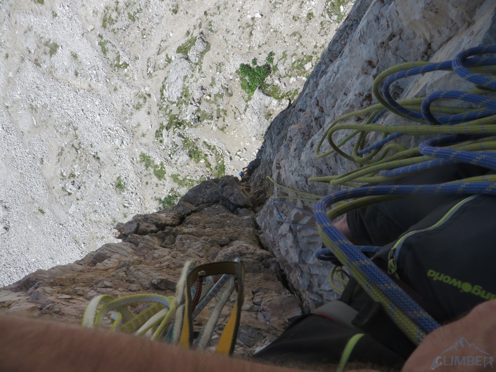 No i tutaj już tak pięknie jak podczas wspinania nie jest – wpadam bowiem na pomysł by zamiast tradycyjną i żmudną drogą zjazdów/zejścia, zjechać linią słynnej drogi Gelbe Mauer idącą bardzo blisko naszego filara. Problem w tym, że źle lokalizujemy pierwszy zjazd i by trafić na właściwą linię, po drugim wykonuję kolejny – niefortunny – zjazd przez okap. A że ściana przewiesza się praktycznie cały czas, gdy dojeżdżam do końca liny, zawisam 300 metrów nad ziemią i jakieś 10 metrów od ściany 😊. Początkowo zachowuję spokój ale po kilku minutach bezskutecznej walki o przybliżenie się do ściany zaczynam wydzierać się do góry (radio jak na złość padło chwilę wcześniej) sugerując Grześkowi by opuścił się na blokerze niżej, uwolnił linę znad przewieszki i rozbujał mnie tak bym mógł wpiąć się do jednego ze spitów lśniących kilka metrów ode mnie. Ponieważ jestem doskonale widoczny ze schroniska kilka osób na dole musi mieć niezły ubaw, niedaleko przelatuje też śmigłowiec, z którego zerkają na mnie z zainteresowaniem, podczas gdy ja udaję, że wszystko mam pod kontrolą 😉. Po trwających dla mnie wieczność kilkunastu minutach rozwiązujemy problem, wyrównujemy linię zjazdów i już bez przygód docieramy na ziemię.