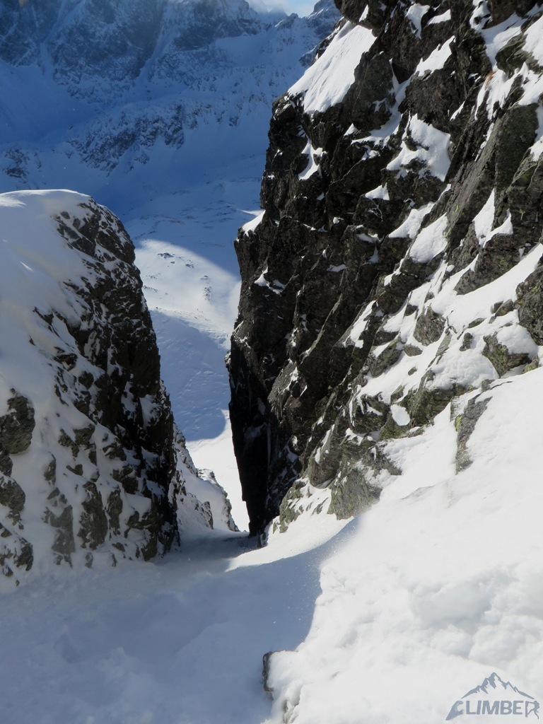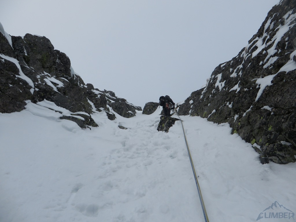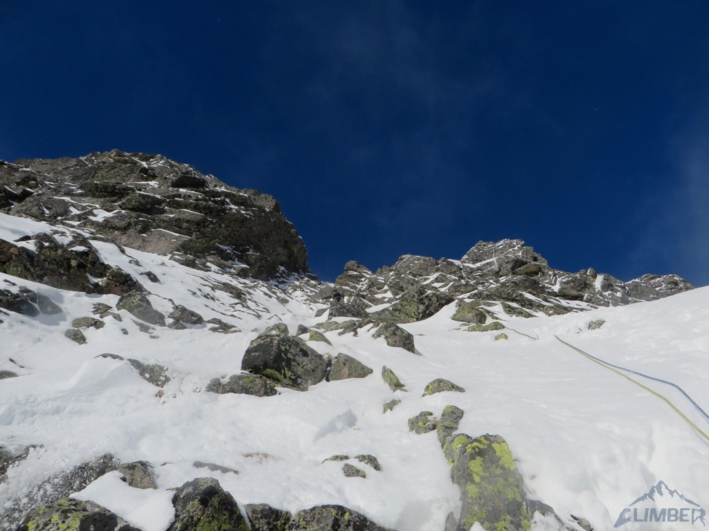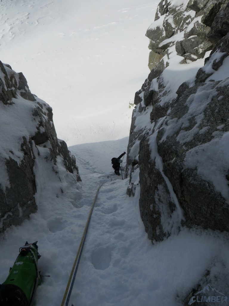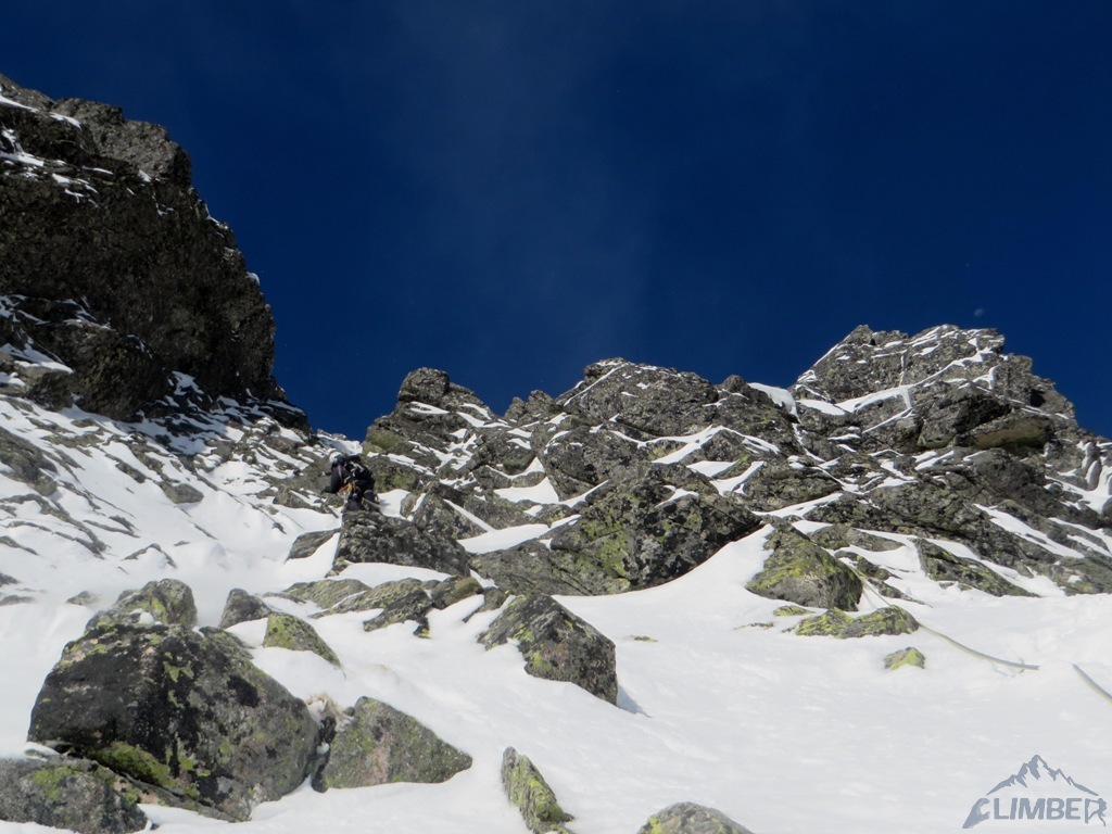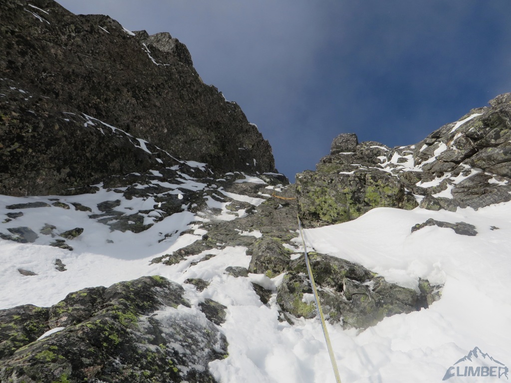 Po ściągnięciu do siebie Jacka debatujemy czy droga teraz skręca w lewo czy idzie kominem do końca i dopiero wtedy skręca w „ławkę” wspomnianą w opisie, którym dysponujemy - na temat drogi nie znaleźliśmy w Internecie nic poza linią wrysowaną w zdjęcie całego masywu i krótkim słowackim tekstem. Decydujemy się zgodnie z opisem iść do końca – ostatnie 30 metrów jest łatwe, komin zmienia się w żleb, musimy tylko przekopać się przez tony śniegu.