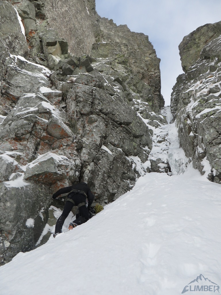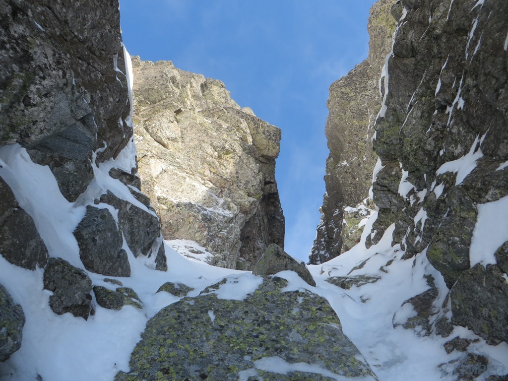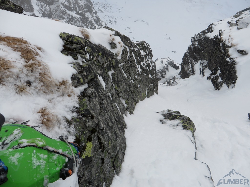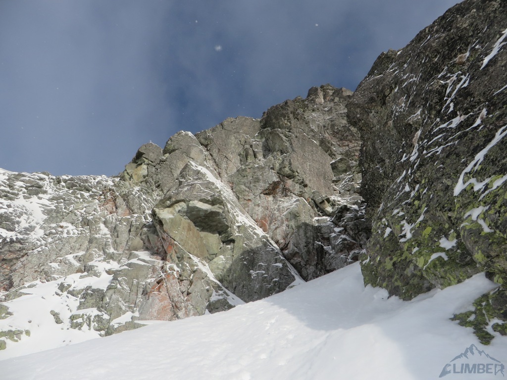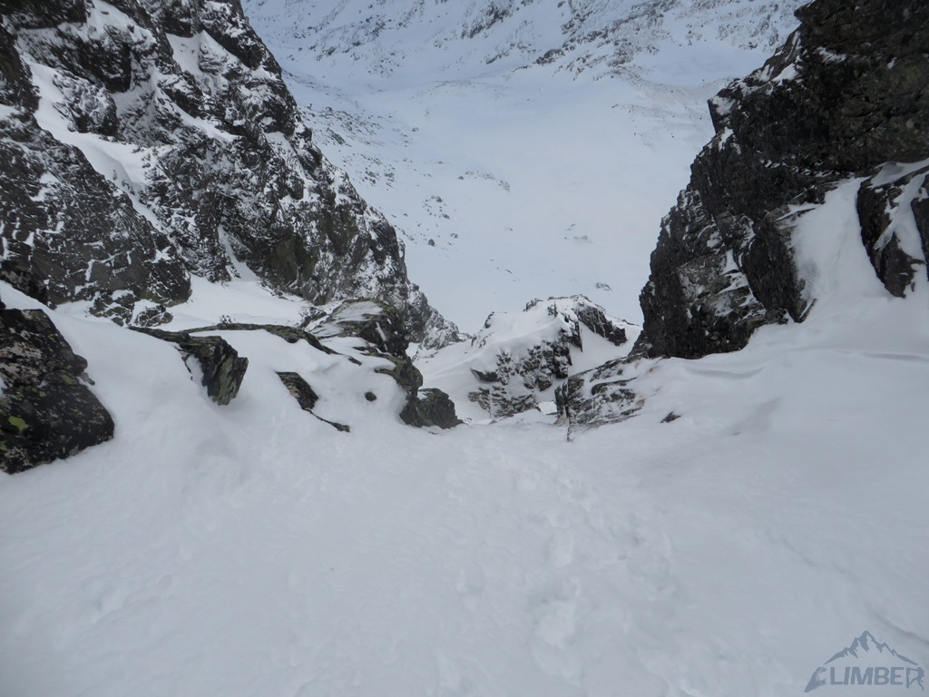 Po ściągnięciu do siebie Jacka debatujemy czy droga teraz skręca w lewo czy idzie kominem do końca i dopiero wtedy skręca w „ławkę” wspomnianą w opisie, którym dysponujemy - na temat drogi nie znaleźliśmy w Internecie nic poza linią wrysowaną w zdjęcie całego masywu i krótkim słowackim tekstem. Decydujemy się zgodnie z opisem iść do końca – ostatnie 30 metrów jest łatwe, komin zmienia się w żleb, musimy tylko przekopać się przez tony śniegu.