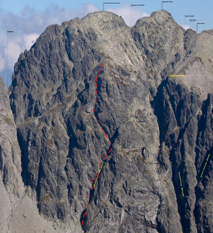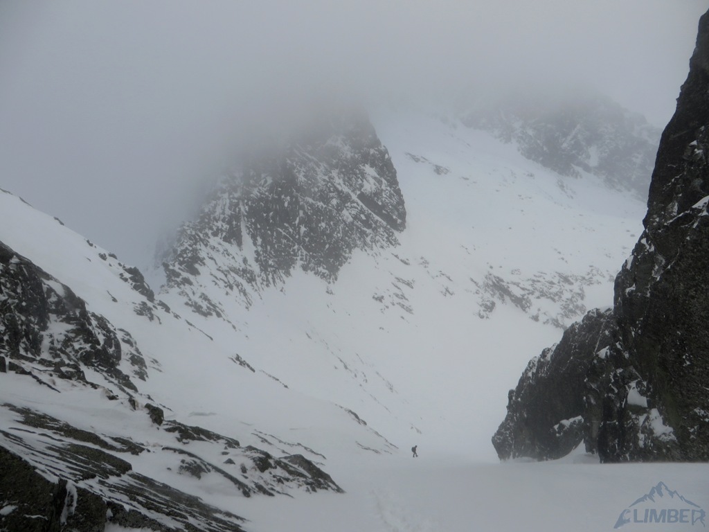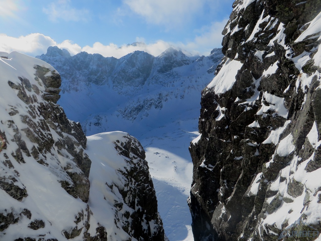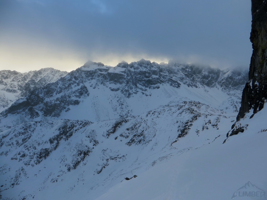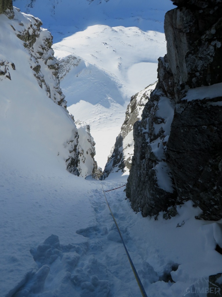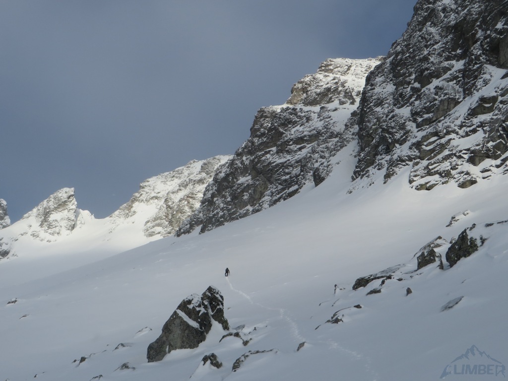 Po ściągnięciu do siebie Jacka debatujemy czy droga teraz skręca w lewo czy idzie kominem do końca i dopiero wtedy skręca w „ławkę” wspomnianą w opisie, którym dysponujemy - na temat drogi nie znaleźliśmy w Internecie nic poza linią wrysowaną w zdjęcie całego masywu i krótkim słowackim tekstem. Decydujemy się zgodnie z opisem iść do końca – ostatnie 30 metrów jest łatwe, komin zmienia się w żleb, musimy tylko przekopać się przez tony śniegu.