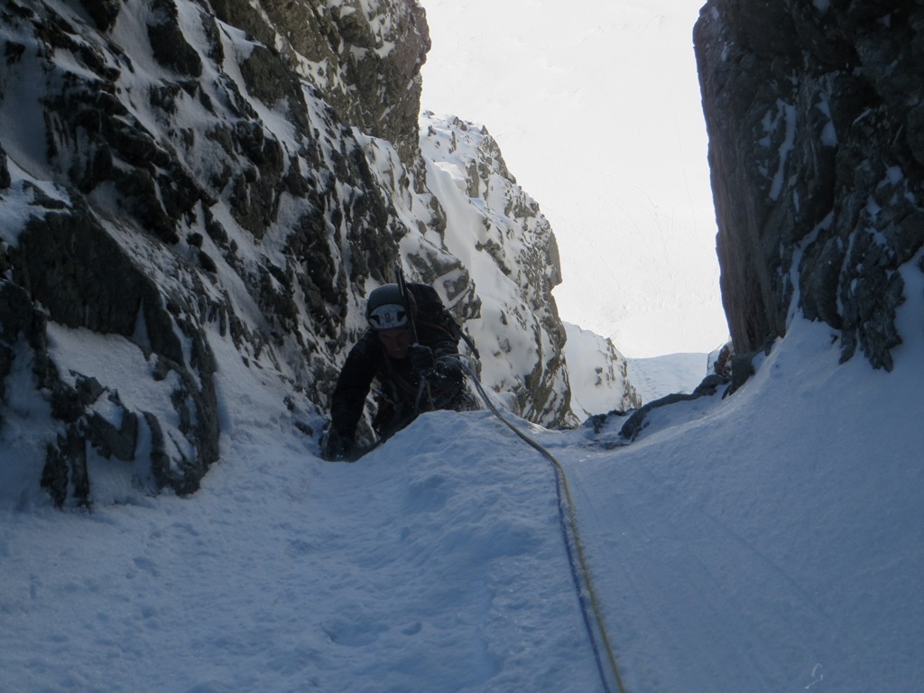W komin startuję pierwszy i niestety po chwili jestem rozczarowany warunkami w nim panującymi – lodu jest mało, jest słaby, a miejscami zamiast po nim, trzeba się wspinać po śnieżnych skorupach – urywającymi się już na pierwszym progu. W związku z tym asekuracje też jest kiepska, więc trzeba się mocno trzymać :) - nie jest trudno (mikst do 4, lód WI3/3+) ale trzeba uważać na każdy kolejny ruch oraz wspomagać się skałami po bokach. Zarówno na prowadzeniu pierwszego jak i drugiego wyciągu (oba idę po 60 metrów) spędzam więc dość dużo czasu, dodatkowo pomiędzy progami muszę się przedzierać przez kopny śnieg, który miał być betonem... Po drodze znajduję tylko jeden hak stanowiskowy, dodatkowo mam problem z założeniem czegokolwiek na trzecim stanie.