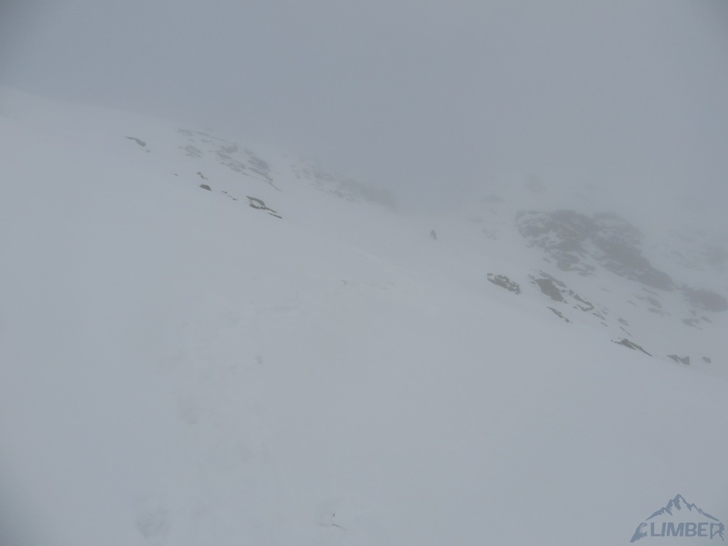 Chmury gęstnieją i zaczyna sypać – w takim klimacie już rozwiązani trawersujemy oba wierzchołki Jaworowego i schodzimy do żlebu zejściowego, po czym wracamy pod ścianę. Jesteśmy przemarznięci i zmęczeni, więc cieszę się, że tym razem powrót do samochodu będzie szybki i przyjemny – zapinam narty i 30 minut później wcinam Cesnakovą :).