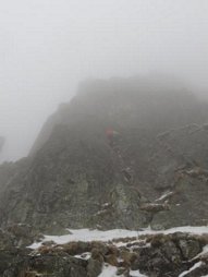 Niedosyt wspinaczkowy po obozie dał się we znaki, więc mimo słabych prognoz pogody namawiam Jacka i Ryśka na wyjazd w Tatry. Po krótkiej dyskusji decydujemy się na podejście Doliną Staroleśną pod Sławkowską Kopę, by w zależności od warunków wybrać coś na miejscu. Nasz wybór pada na drogę Havraní vlasy, wyprowadzającą na przełęcz pomiędzy Warzęchowymi Strażnicami. Decyzja by nie wchodzić w nic dłuższego i trudniejszego (na Vlasach mamy dwa krótkie wyciągi z trudnościami, reszta to teren do żywcowania) okazuje się bardzo dobra bo pogoda zamiast się polepszać, ulega załamaniu. To powoduje, że mimo iż wspinanie nie zajmuje nam długo (2 godziny), z drogi zjeżdżamy - zejść z powodu warunków na drugą stronę się nie dało. Kluczowy wyciąg (wariant M5-) jest bardzo fajny, wspominać go jednak będziemy również ze względu na sypiące się z góry pyłówki 😊.