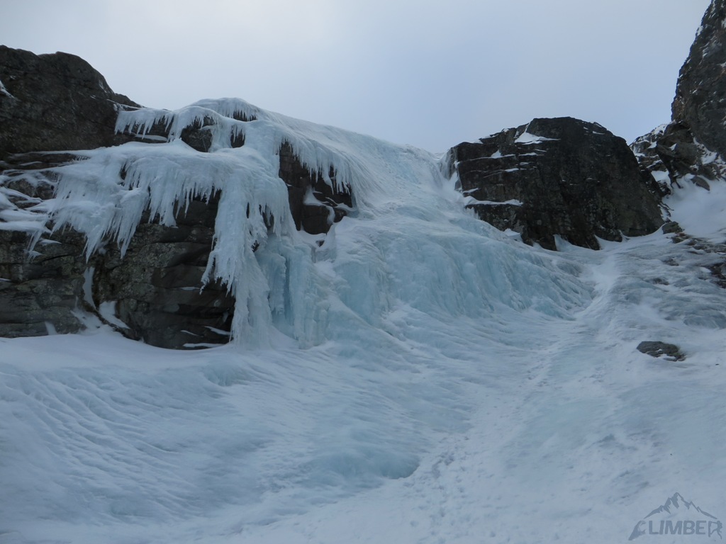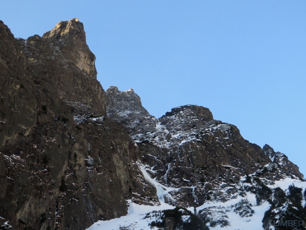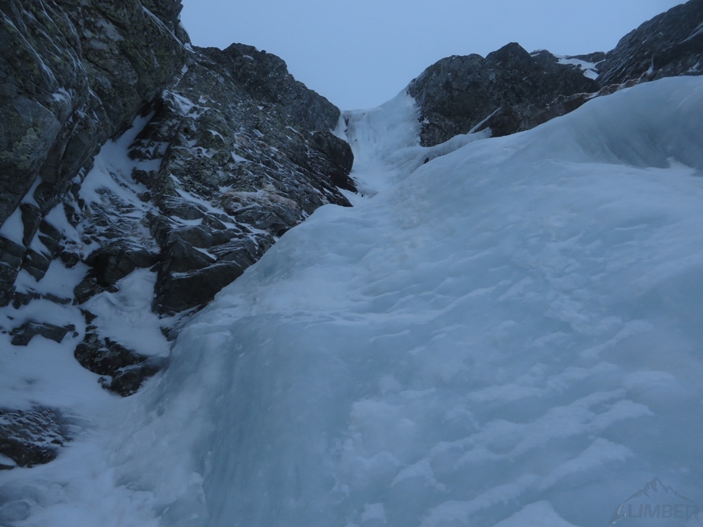 W końcu dochodzimy do miejsca, gdzie żleb odcina próg zalany lodem – można go obejść łatwym terenem ale nie po to tutaj przyszliśmy 😊. Wbijam śmiało w lodospad i wydaje mi się, że łatwo poradzę sobie z górnym odcinkiem za WI4+. Niestety gdy staję na półce pod ostatnimi metrami lodu, okazuje się, że część po której chcę wyjść to kruche kolumny, które po chwili zrzucam na dół i na dodatek nie ma możliwości asekuracji. Dobre dwadzieścia minut zajmuje mi wystartowanie w trudny fragment – próbuję się „poskładać”, raz za razem strącając kawałek lodu. W końcu sprężam się i wbijam jedną dziabę w słabo zalaną skałę, dynamicznie rwę do góry i szybko zabijam drugi czekan jak najwyżej, zanim pierwsza dziaba wyskakuje ze swojego miejsca – to już nieważne bo wiem, że utrzymam 😊. Kilka szybkich ruchów i wchodzę w łatwy teren. Dochodzę do skały w której odnajduję haka, dobijam dodatkowego i melduję Mariuszowi, że może ruszać. Po chwili cieszę się, że zrobiłem dobry stan bo kolega mocno walczy na problematycznym odcinku, który wyciąga z niego wszystkie siły i zmusza do podjęcia kilku prób.