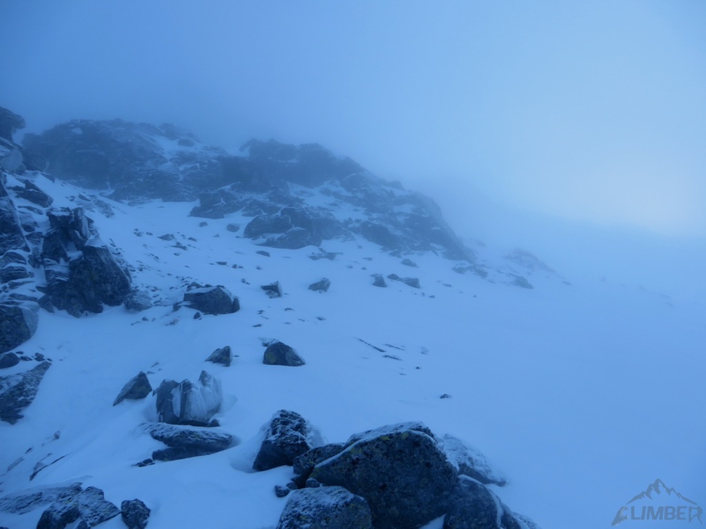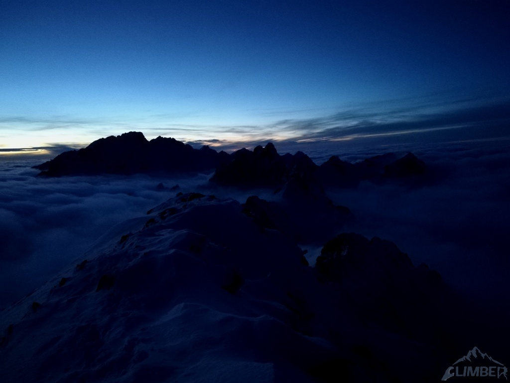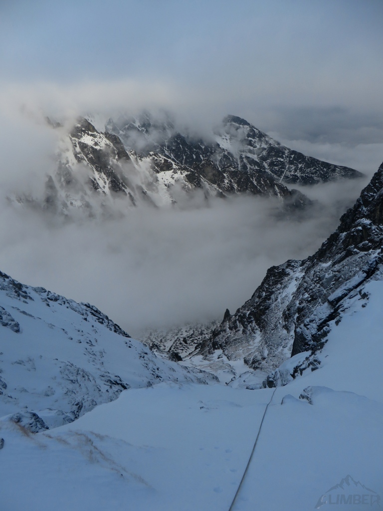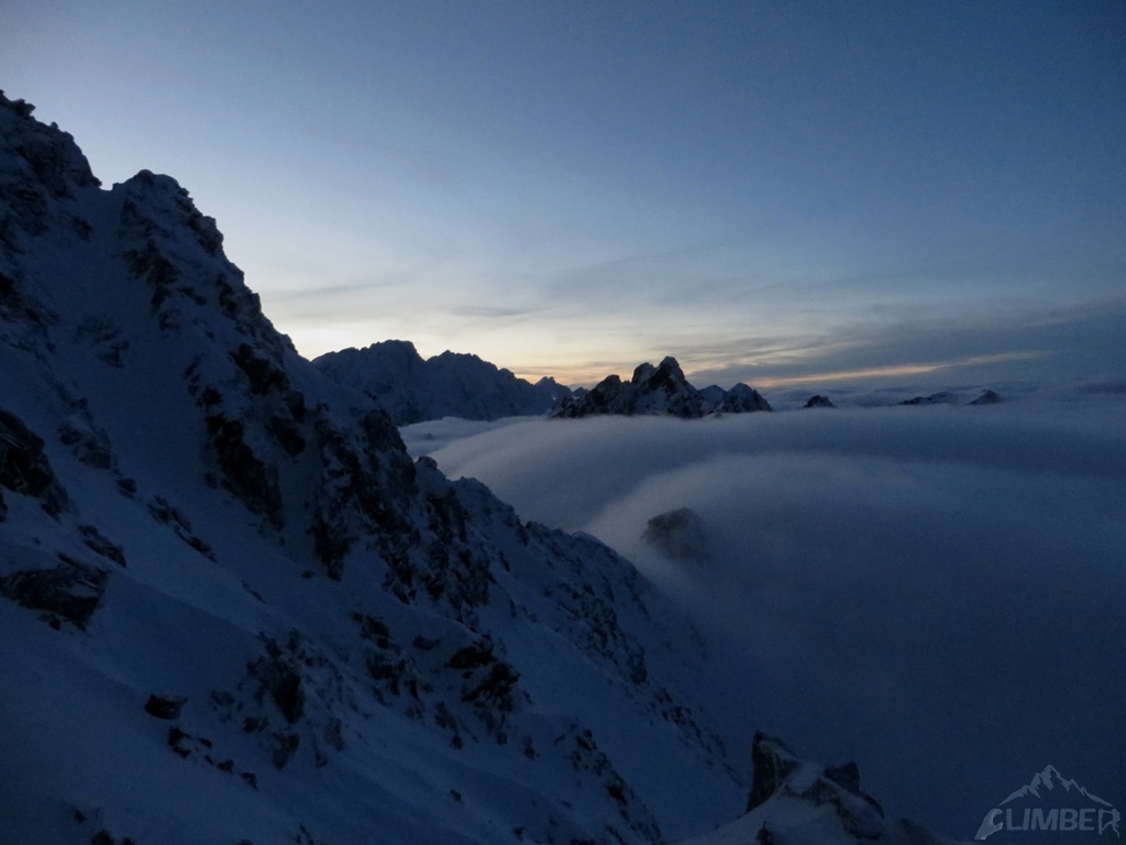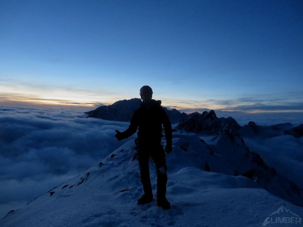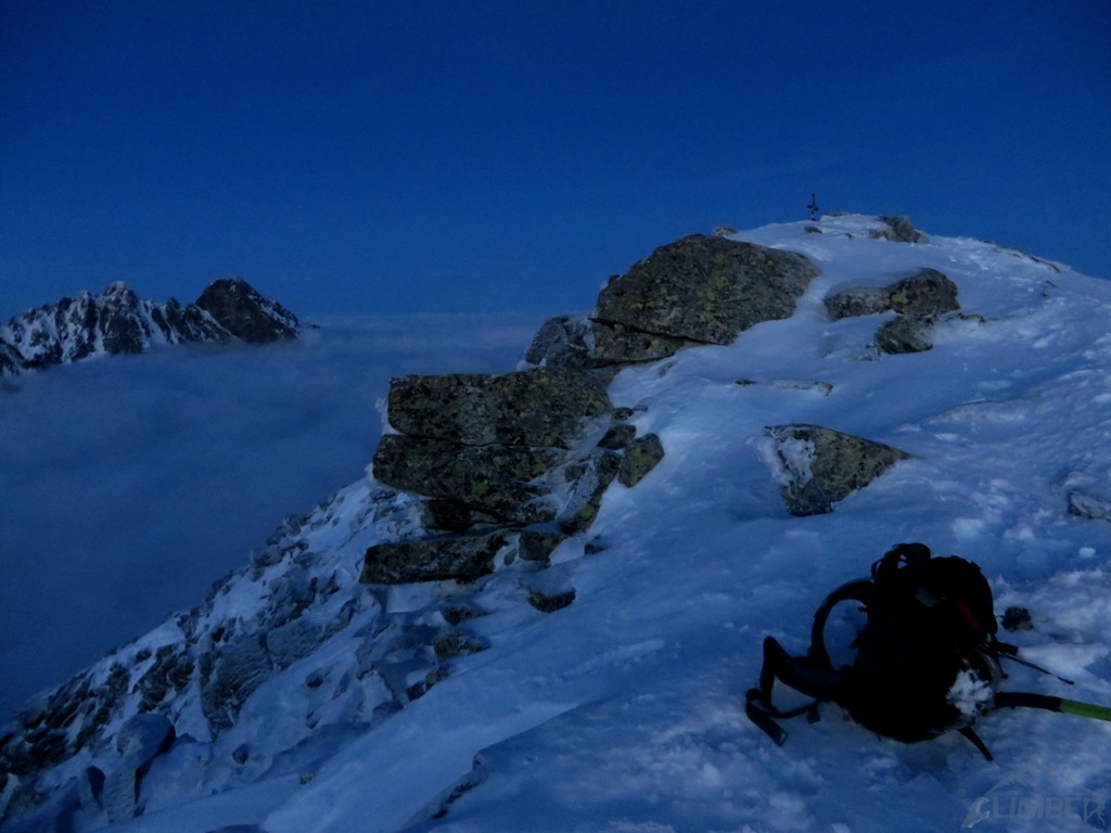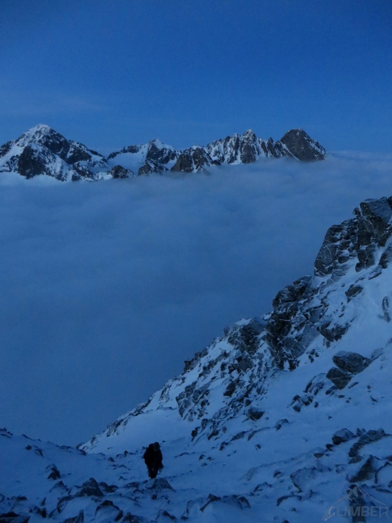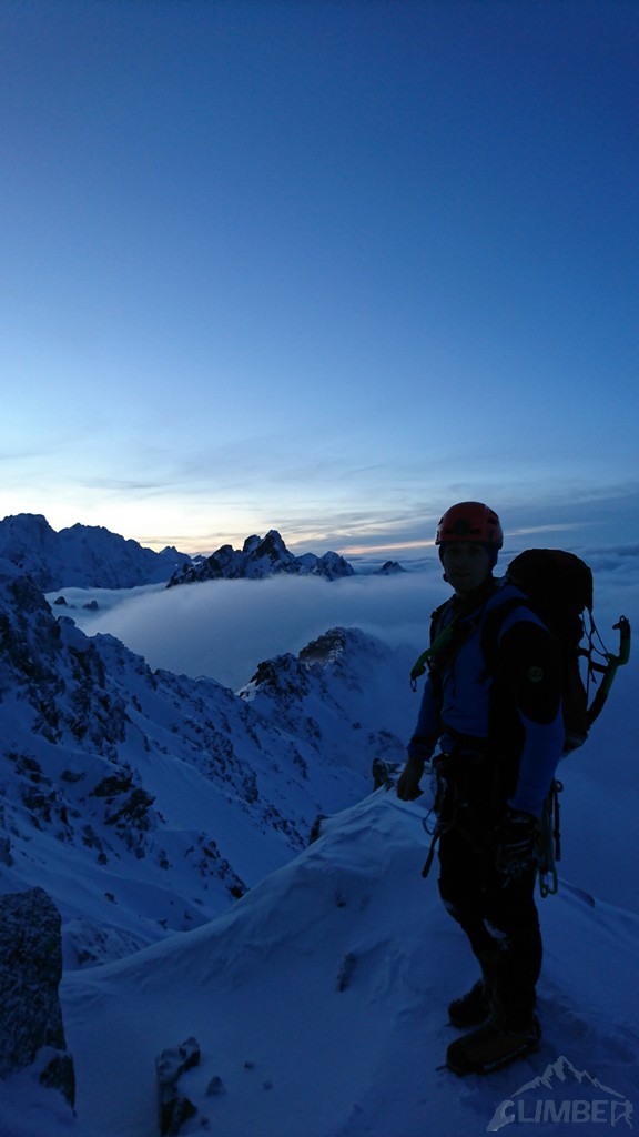 Ponownie chowamy liny do plecaków i ruszamy dalej, góra żlebu jest mocno zasypana, na szczęście śnieg nie trzyma tylko miejscami. Po wyjściu ze żlebu, tuż przed zmrokiem, wchodzimy w dobrze związany śnieg w depresji pomiędzy skałami, która wyprowadza nas prosto na wierzchołek Sławkowskiego Szczytu. Na ostatnich metrach zatrzymujemy się co chwilę podziwiając morze chmur pod nami i wystające dookoła wierzchołki najwyższych szczytów. Dodatkowo mocno nas to rozbawia bo Mariusz rano mówił, że marzy by kiedyś w zimie znaleźć się na wysokim szczycie, gdy wszystko wokół skąpane będzie w chmurach. Zamówienie zrealizowane 😉.