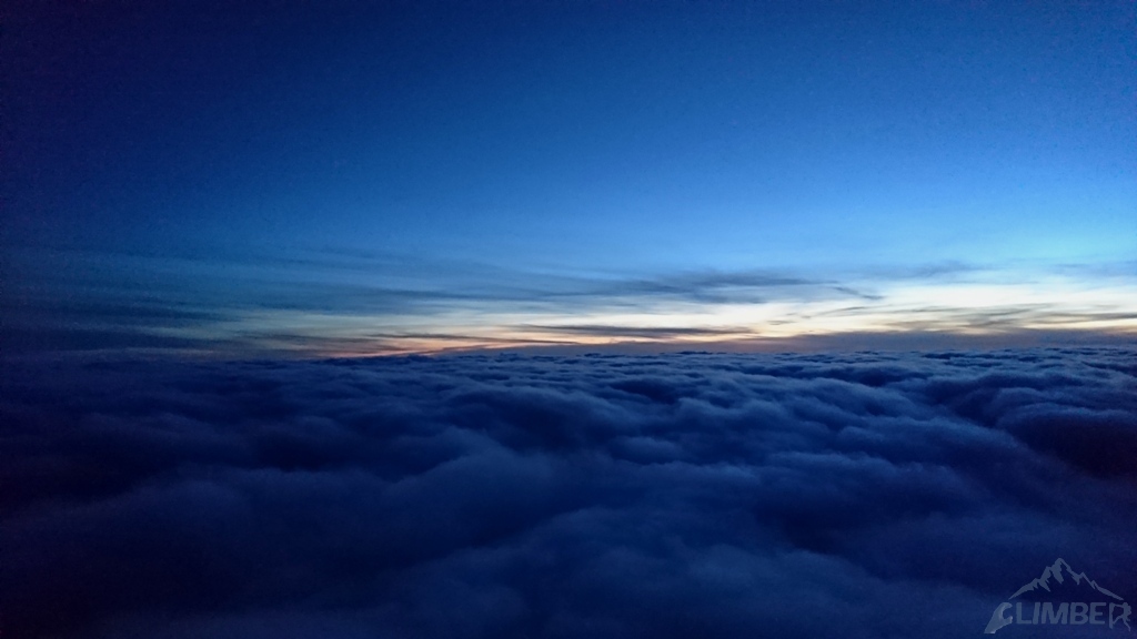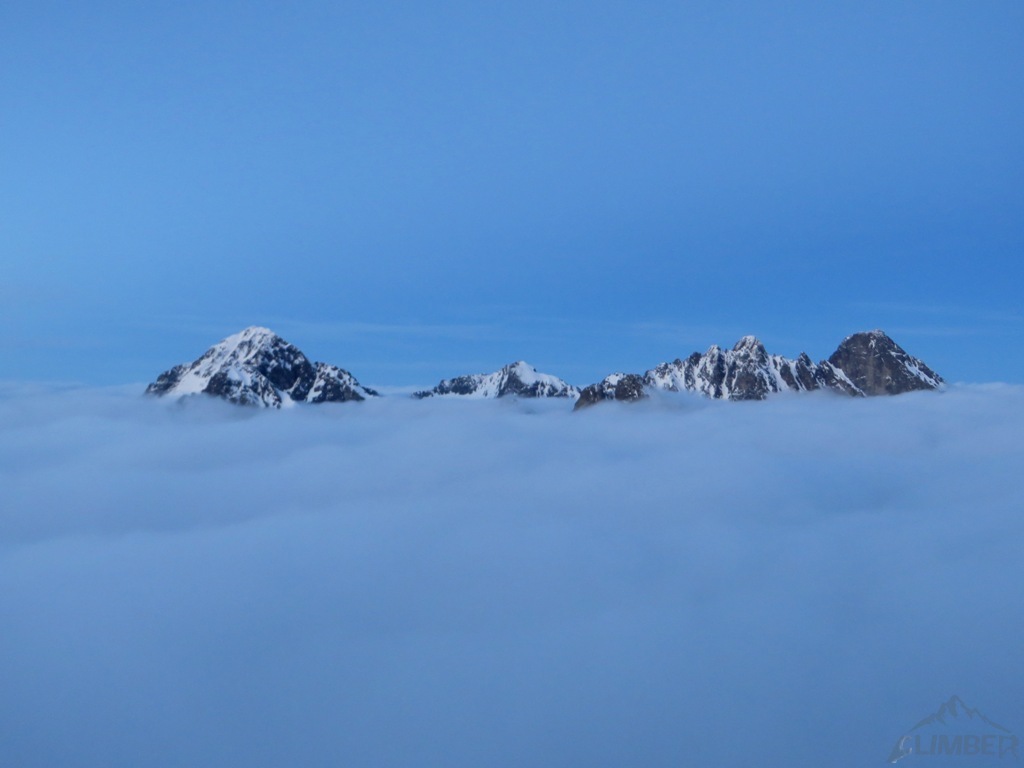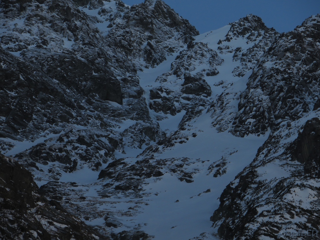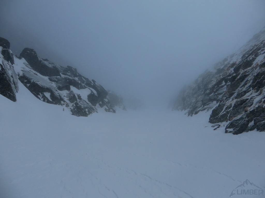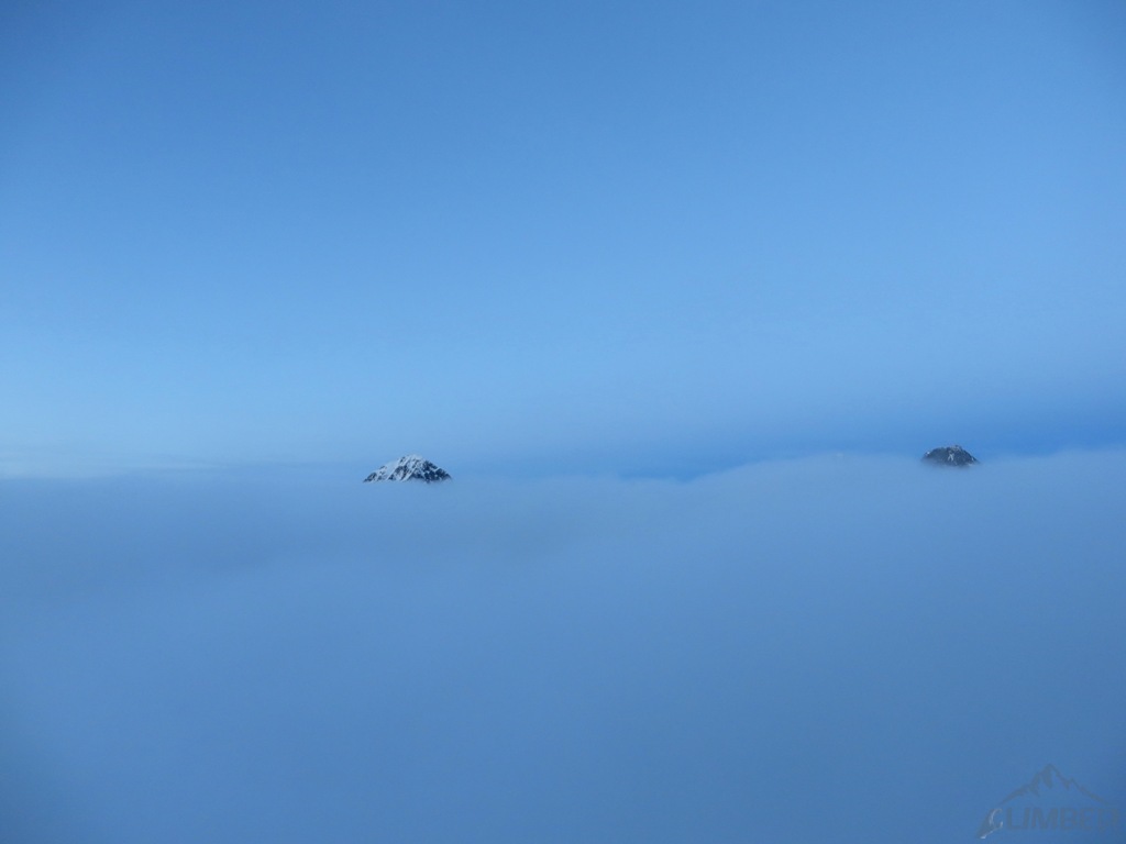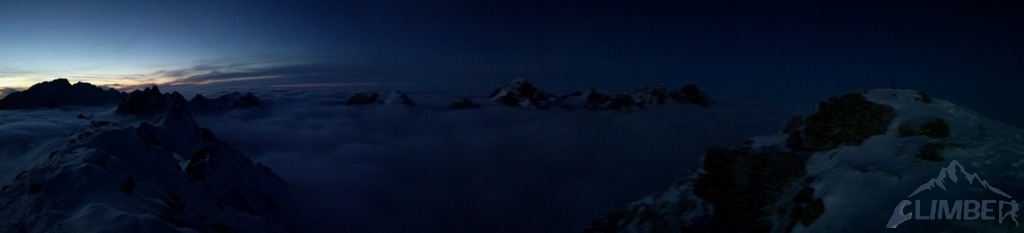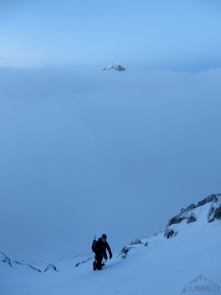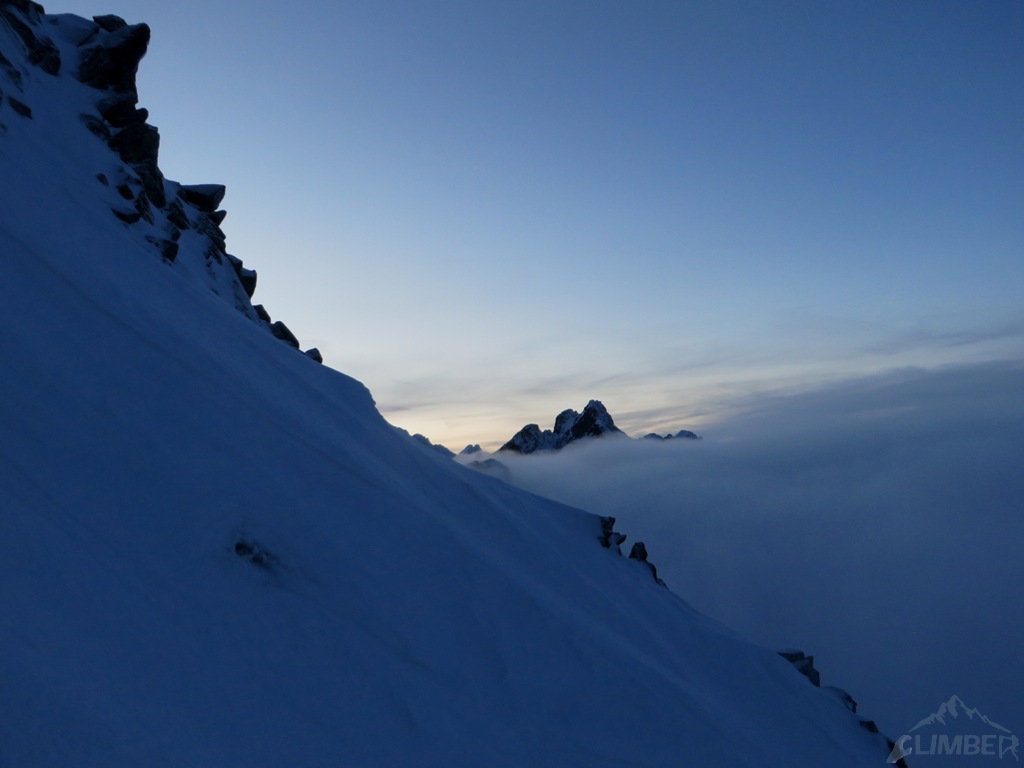 Ponownie chowamy liny do plecaków i ruszamy dalej, góra żlebu jest mocno zasypana, na szczęście śnieg nie trzyma tylko miejscami. Po wyjściu ze żlebu, tuż przed zmrokiem, wchodzimy w dobrze związany śnieg w depresji pomiędzy skałami, która wyprowadza nas prosto na wierzchołek Sławkowskiego Szczytu. Na ostatnich metrach zatrzymujemy się co chwilę podziwiając morze chmur pod nami i wystające dookoła wierzchołki najwyższych szczytów. Dodatkowo mocno nas to rozbawia bo Mariusz rano mówił, że marzy by kiedyś w zimie znaleźć się na wysokim szczycie, gdy wszystko wokół skąpane będzie w chmurach. Zamówienie zrealizowane 😉.