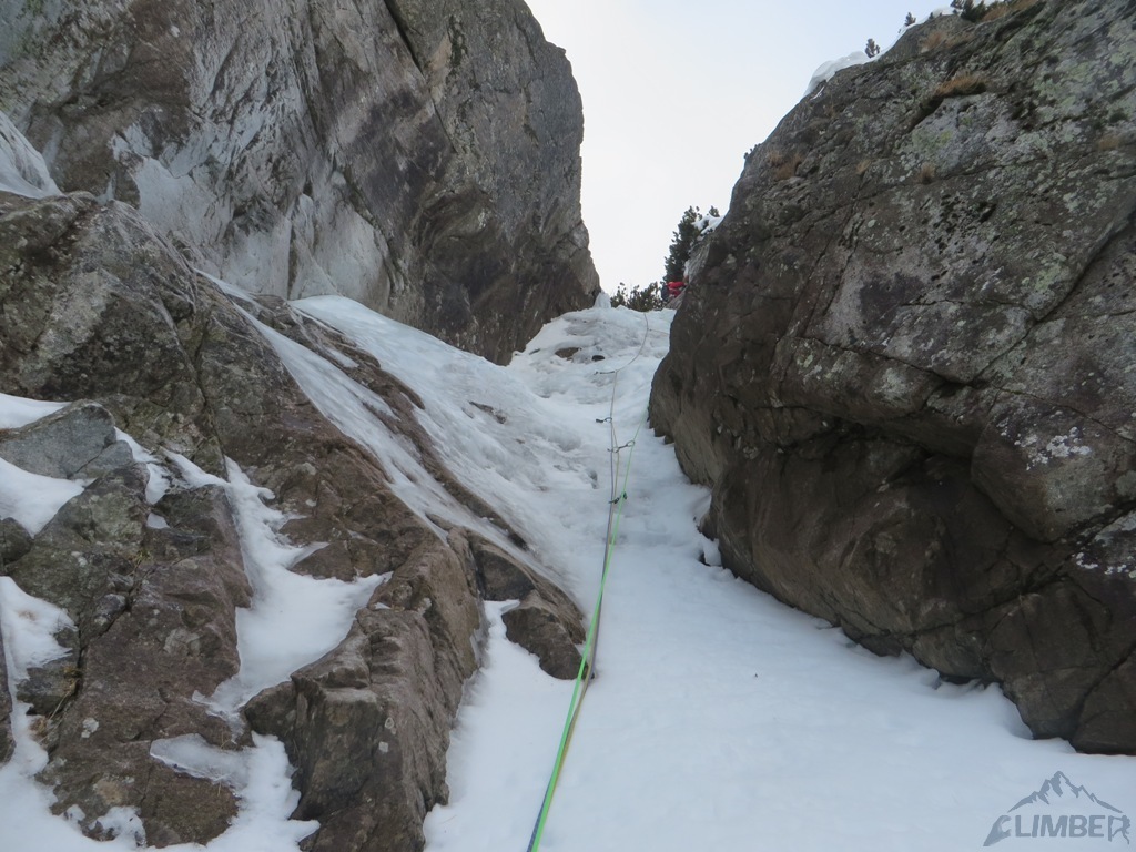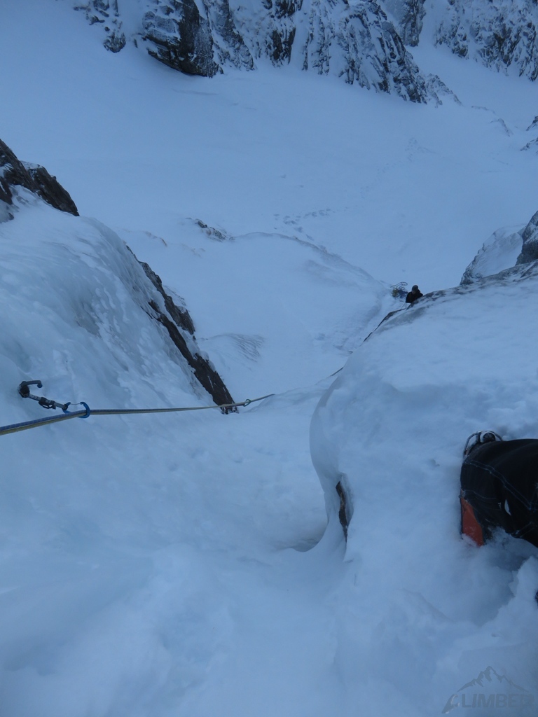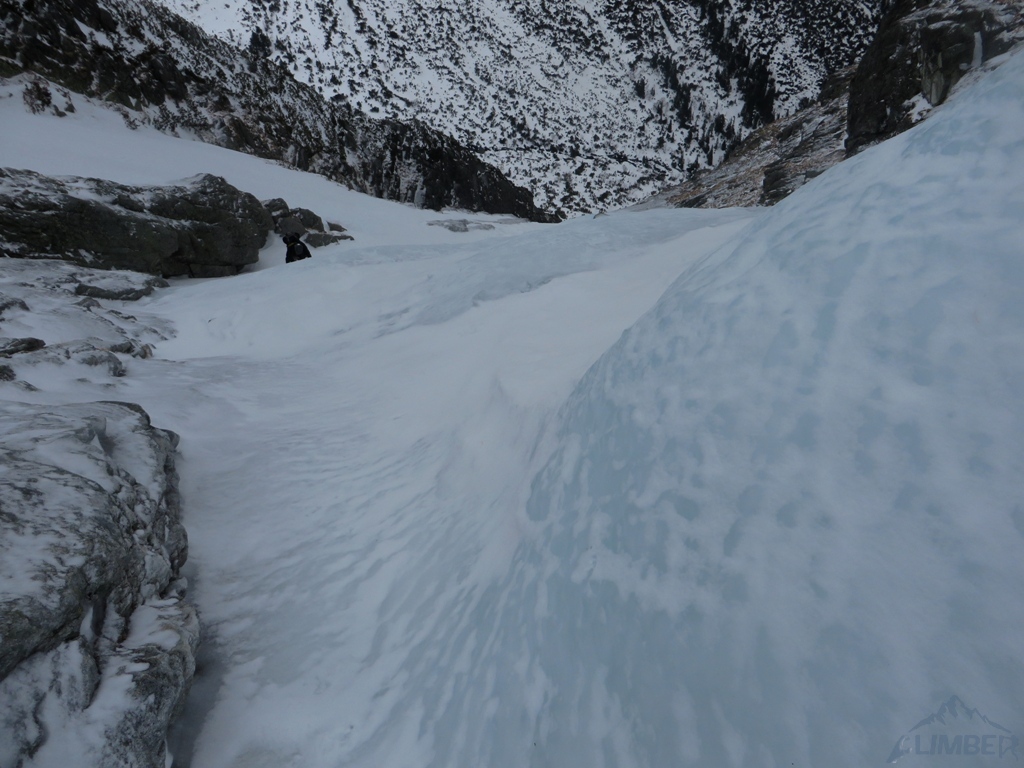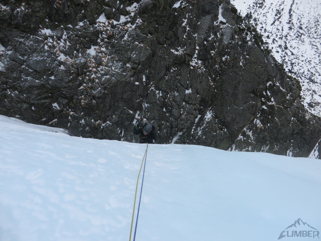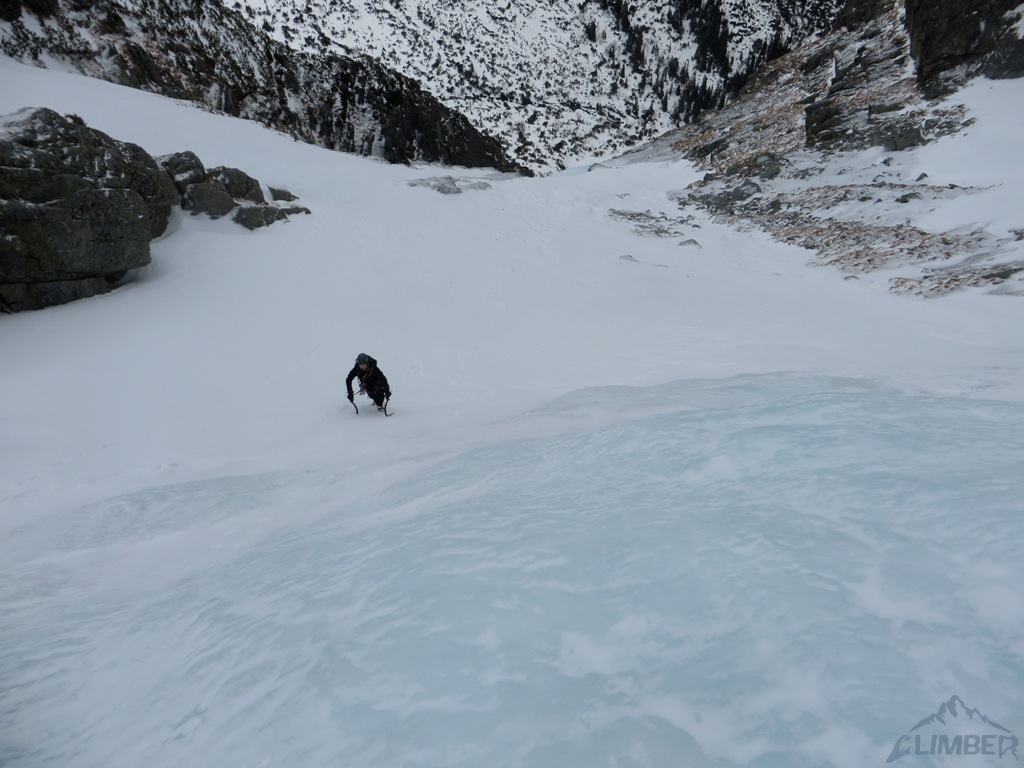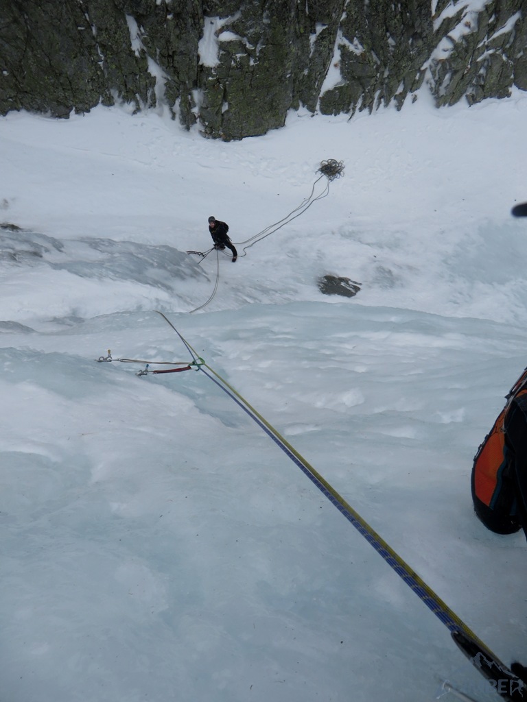 Dolny, łatwy (WI2) lód, prowadzi Mariusz i po chwili ściąga mnie na stan walcząc z zaplątaną przez Słowaka liną. Nie zatrzymuję się na stanie, tylko od razu ciągnę dalej pod Górnego Grosza. Fragment za WI4 trochę mnie bułuje, dodatkowo jest nieasekurowalny (śniego-lód) ale idzie sprawnie i po chwili melduje się przy stałym stanowisku. Ściągam kolegę, rozwiązujemy się i ruszamy dalej do góry. Pokonujemy krótki i połogi próg lodowy, po czym cały czas idziemy dość dobrze związanym śniegiem. Są jednak miejsca, gdzie śnieg przewiało i tam trzeba się żmudnie przez niego przekopywać.