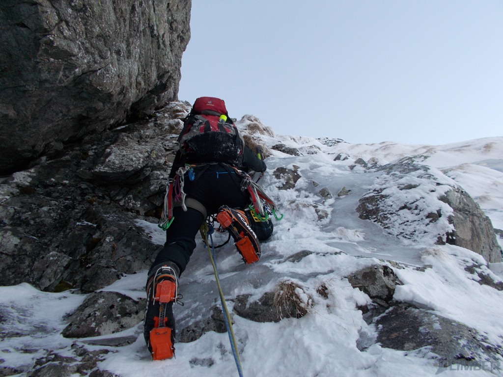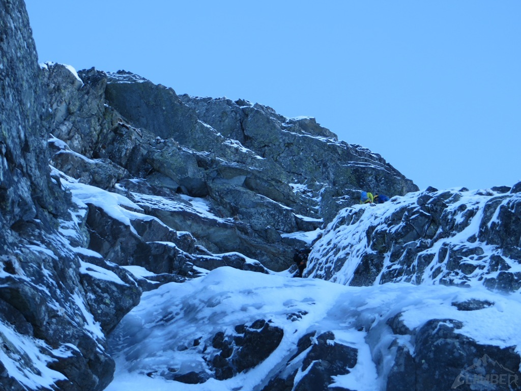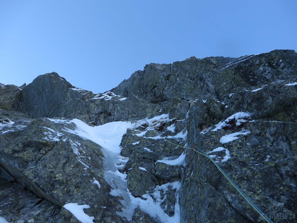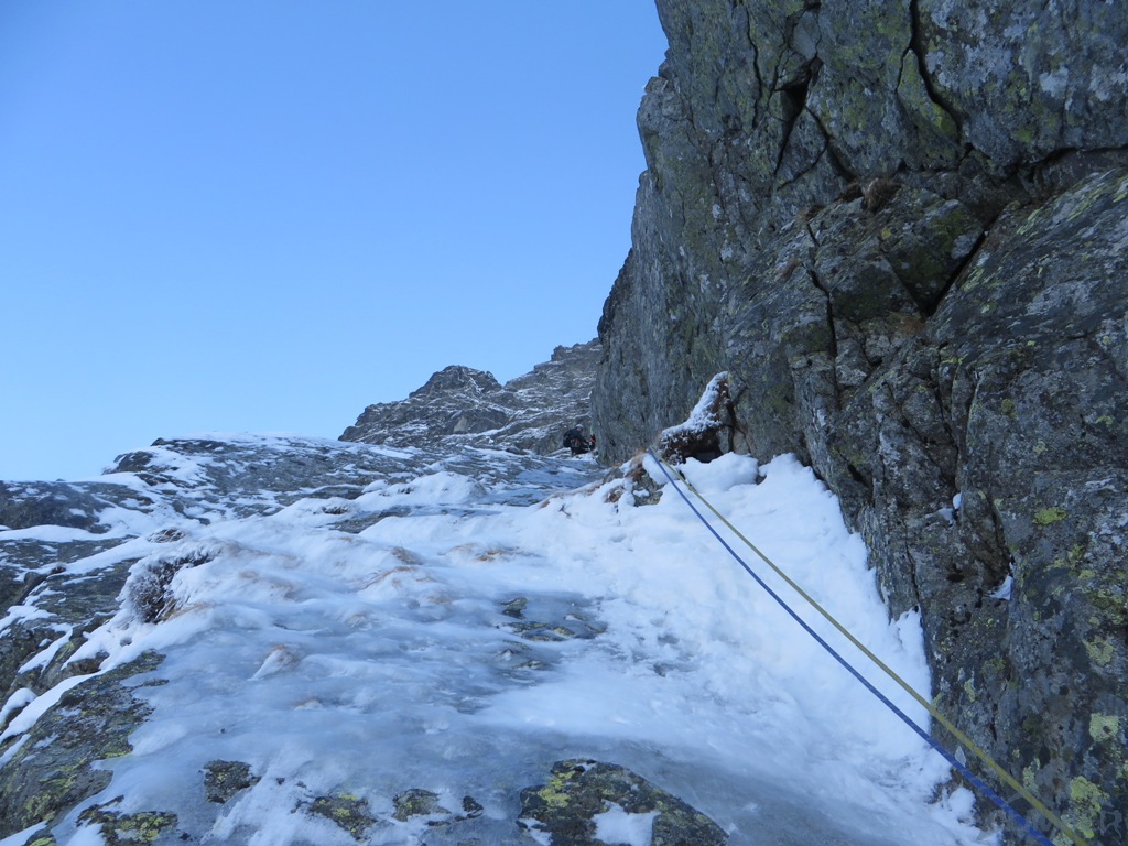 Pierwszy i drugi wyciąg to zalane lodem trawy, wspinanie nie jest trudne ale zajmujące i dość ciągowe. Na kolejnym odcinku prowadzę czwórkowy komin, który w obecnych warunkach zasługuje raczej na wycenę WI3+ 😊. Jacek przejmuje prowadzenie i najpierw trawami, potem ciekawą ścianką podchodzi pod kluczowy wyciąg – doganiamy chłopaków wspinających się przed nami.