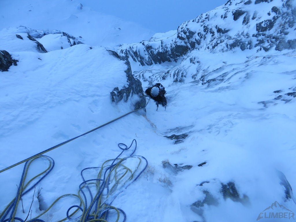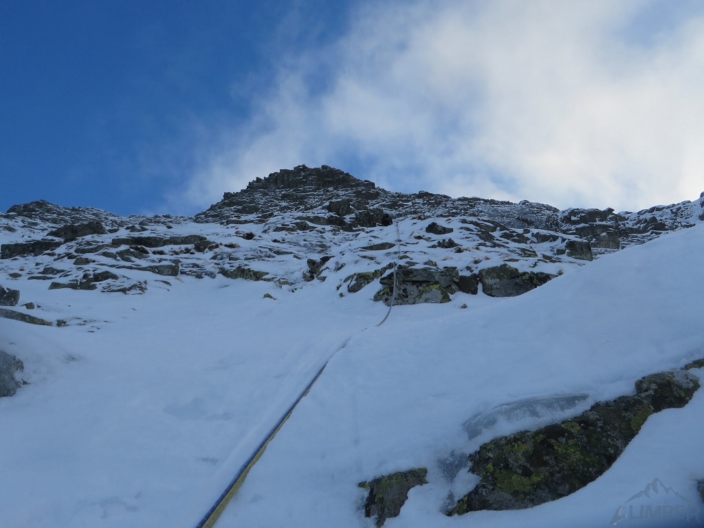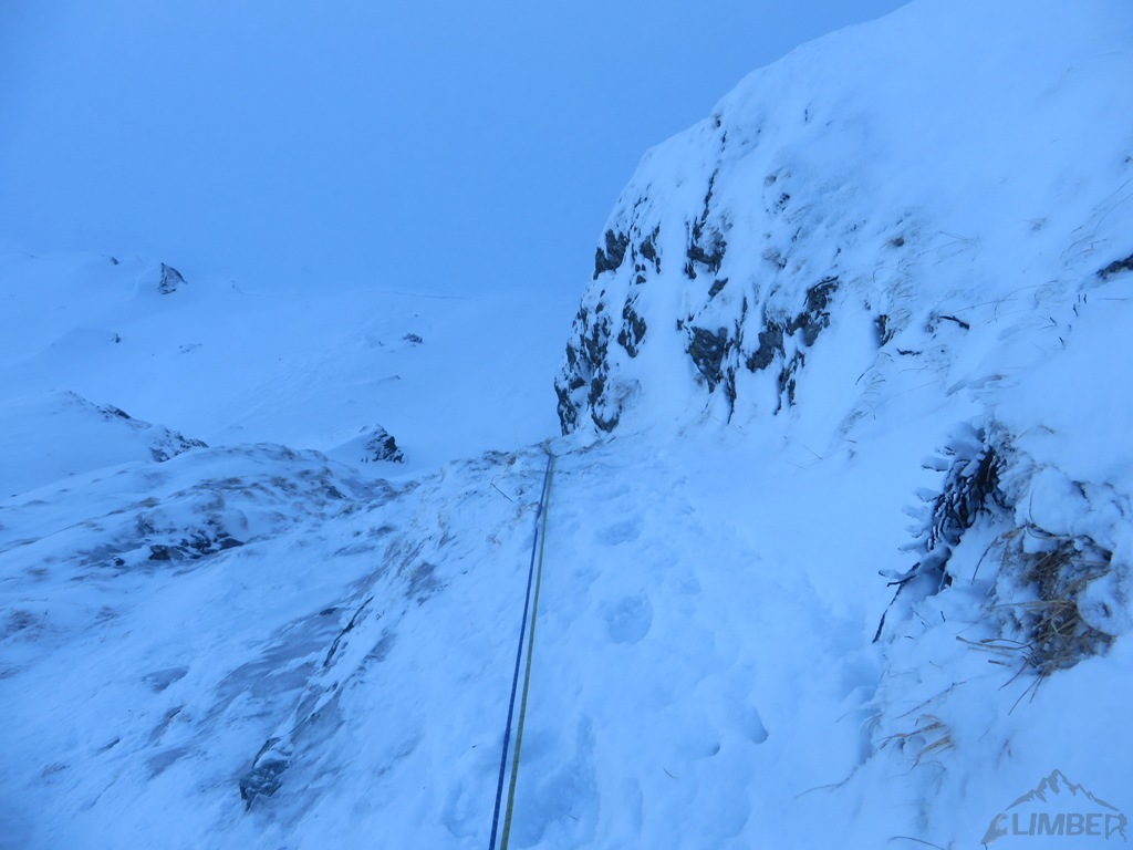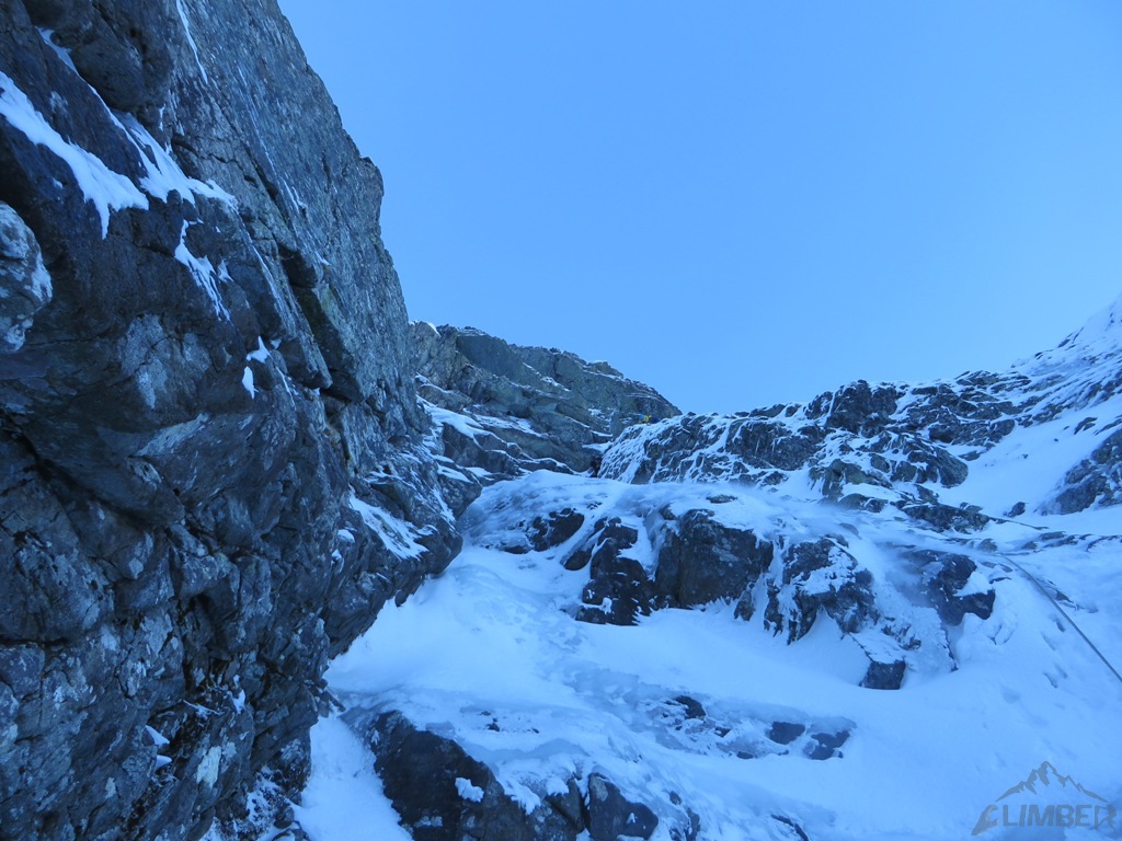 Pierwszy i drugi wyciąg to zalane lodem trawy, wspinanie nie jest trudne ale zajmujące i dość ciągowe. Na kolejnym odcinku prowadzę czwórkowy komin, który w obecnych warunkach zasługuje raczej na wycenę WI3+ 😊. Jacek przejmuje prowadzenie i najpierw trawami, potem ciekawą ścianką podchodzi pod kluczowy wyciąg – doganiamy chłopaków wspinających się przed nami.