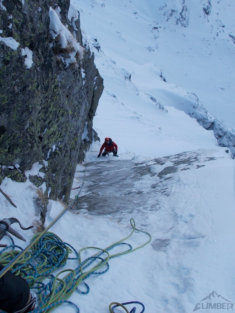 Pod załupą spędzamy prawie godzinę czekając aż chłopaki przejdą ten odcinek – nie jest łatwo, o czym świadczy lot prowadzącego 😉. W końcu nadchodzi nasza kolej – Jacek początkowo ma problemy z przewinięciem na płytkę, potem jednak idzie mu sprawniej. Dłużej spędza tylko przy wyjściu z załupy – niestety akurat lodu na płycie jest bardzo mało co utrudnia wspinanie, zgodnie przyznajemy, że w zastanych warunkach można wycenić ten wyciąg na 5+ (M5). Dochodzę do stanowiska i przejmuję prowadzenie – okazuje się, że kolejny wyciąg to… lodospad za ok. WI3, mający około 20 metrów. Problemem okazuje się jednak to, że nie zabraliśmy ani jednej śruby lodowej, przez co mam dodatkowe emocje aż do momentu wyjścia z lodu i dojściu do stanowiska.