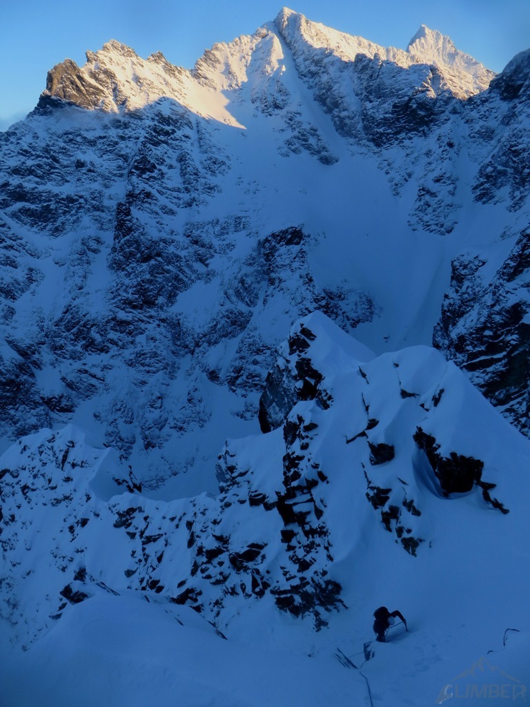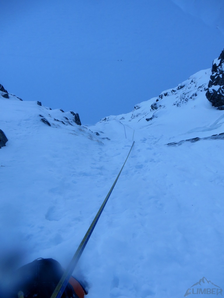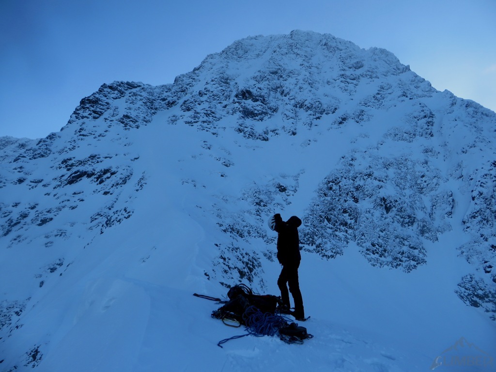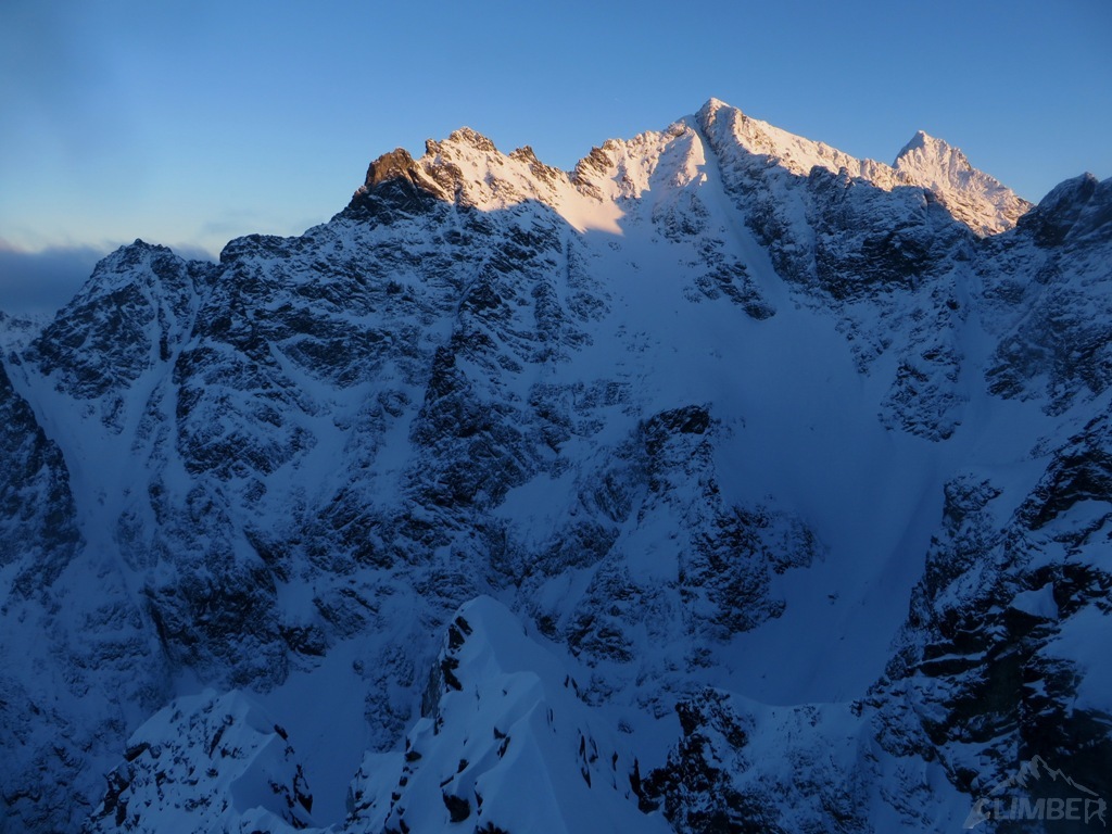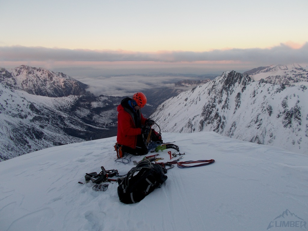 W tym miejscu trudności na drodze się kończą, na Kazalnicę jeszcze daleko (ok. 6-7 wyciągów + żleb), decydujemy się więc przejść na lotną – Jacek przechodzi część drogi, wyprzedzamy chłopaków, po czym zmieniamy się i wyszukanie optymalnej drogi w partii podszczytowej przypada mi. Na górze stawiamy się krótko przed zmrokiem, po około 7 godzinach wspinania. Dzielimy sprzęt i szykujemy się do zejścia, które okazuje się bardzo stresujące. Żleb do Bańdziocha nie jest zasypany, idziemy więc letnim szlakiem po nie do końca związanym śniegu, najgorszy trawers pokonujemy już po ciemku, zakładamy więc z powrotem uprzęże i wiążemy się. W końcu docieramy do schroniska i cieszymy się przejściem jednego z zimowych tatrzańskich klasyków!
