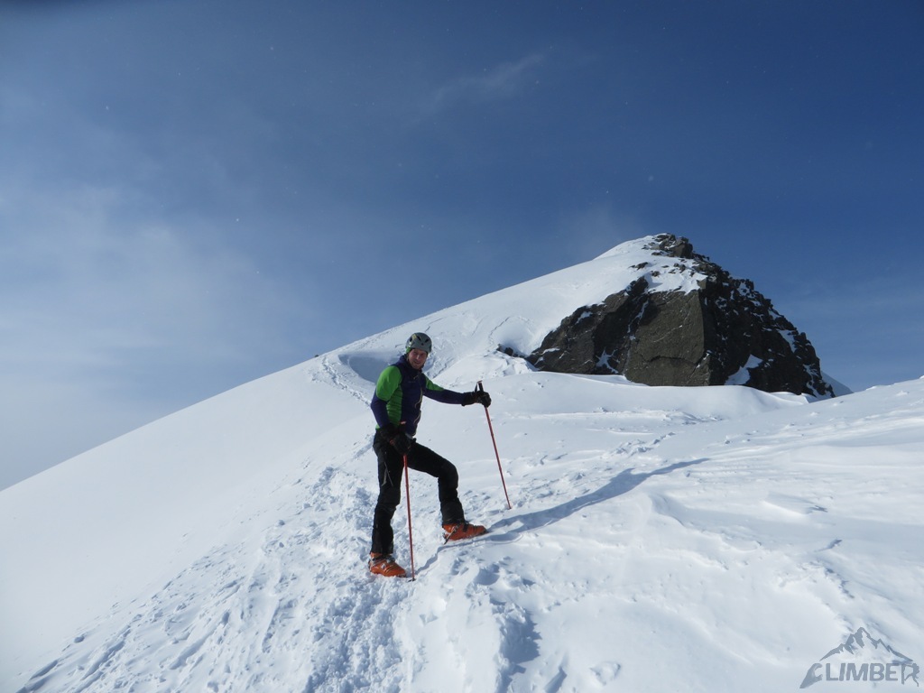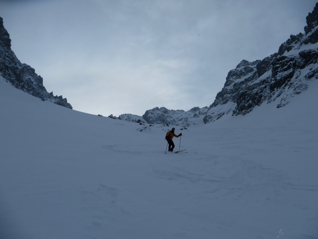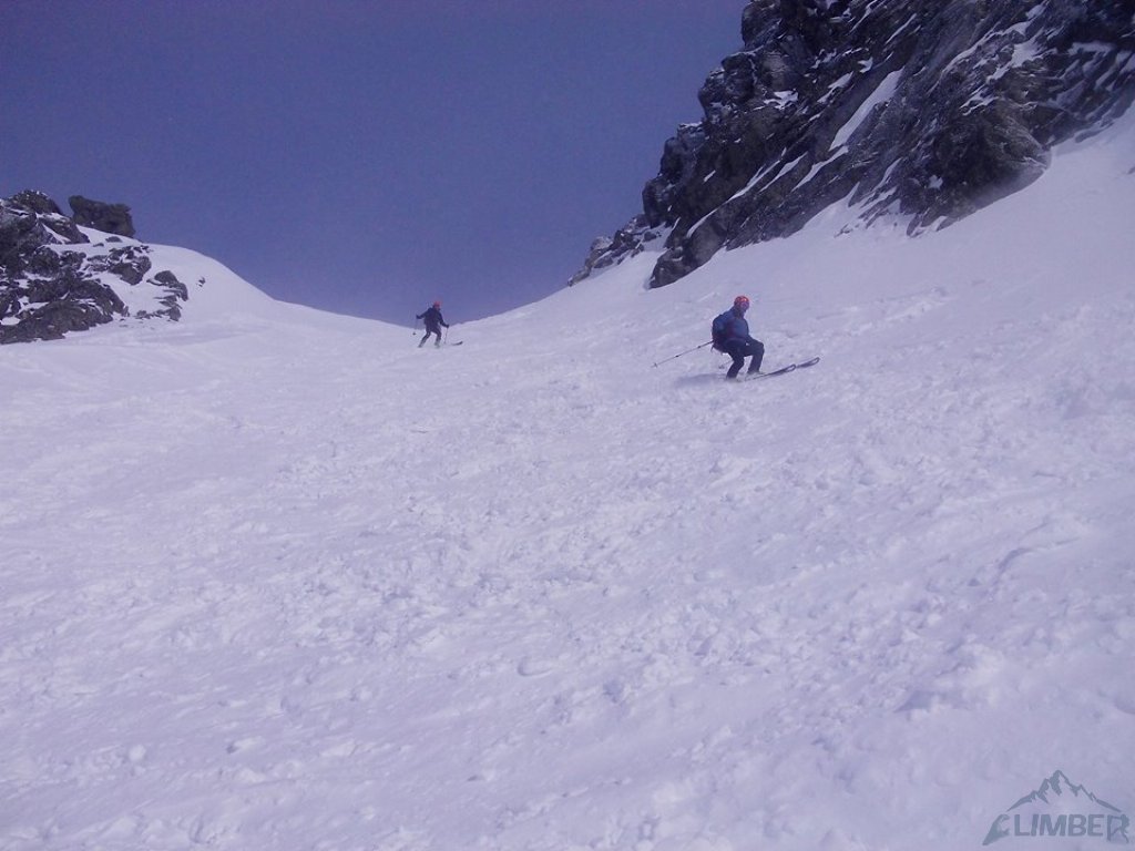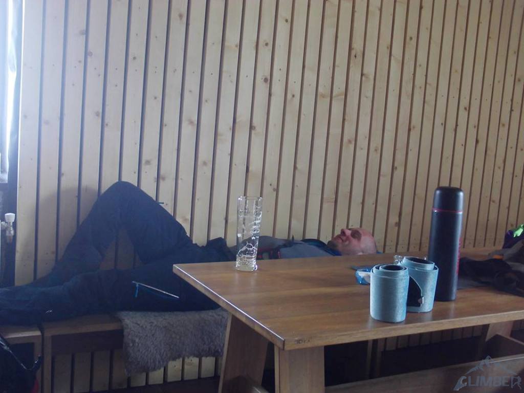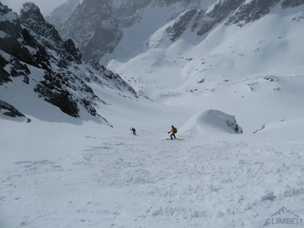 Po dojściu na siodło wraz z Jurasem porzucamy narty, zakładamy raki i szybko wchodzimy na szczyt Baranich Rogów. Po chwili wracamy na Przełęcz do Jurasa, zapinamy narty i ruszamy w stronę Doliny Kieżmarskiej. Początek zjazdu nie jest zbyt przyjemny, śnieg w jednym miejscu jest twardy, a w innym łamie się, im niżej tym jednak lepiej i już we „Flaszce” cieszymy się udanymi szusami. Do schroniska docieramy tuż przed obiadem, po którym odbywa się druga impreza integracyjna, tym razem bardziej szumna, co odczuję kolejnego dnia ;)