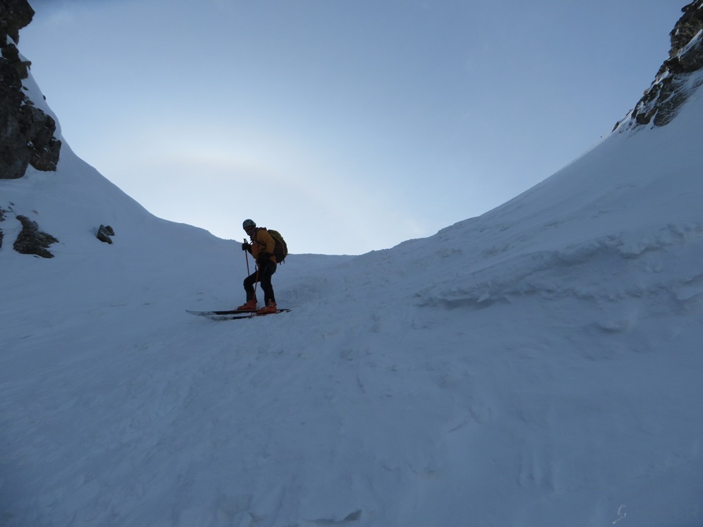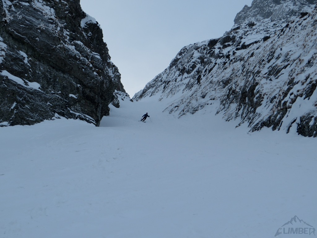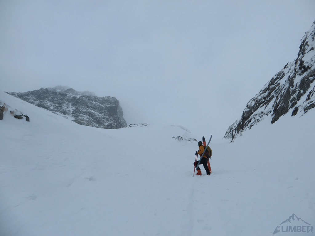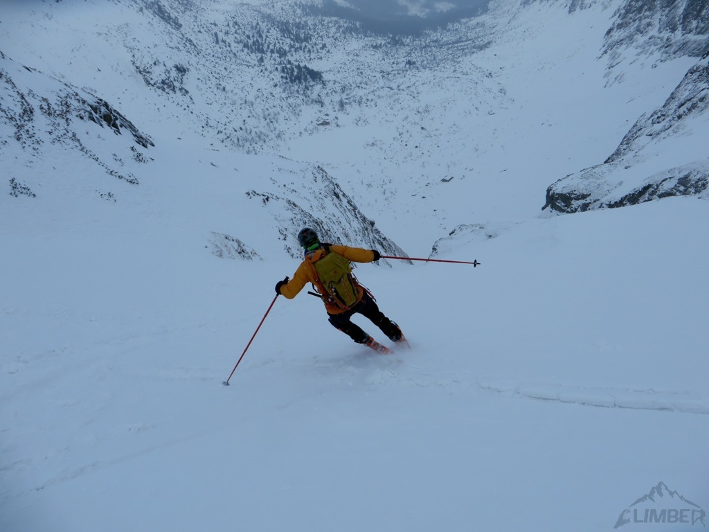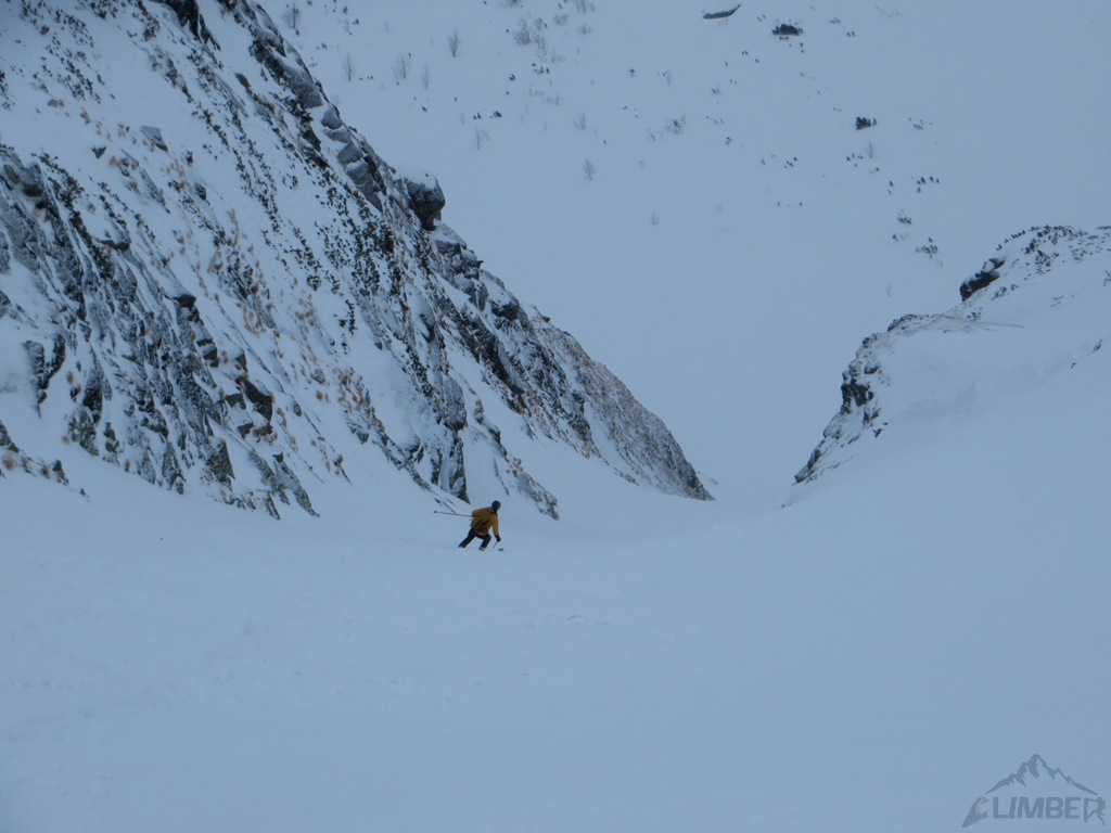 Po dojściu na siodło wraz z Jurasem porzucamy narty, zakładamy raki i szybko wchodzimy na szczyt Baranich Rogów. Po chwili wracamy na Przełęcz do Jurasa, zapinamy narty i ruszamy w stronę Doliny Kieżmarskiej. Początek zjazdu nie jest zbyt przyjemny, śnieg w jednym miejscu jest twardy, a w innym łamie się, im niżej tym jednak lepiej i już we „Flaszce” cieszymy się udanymi szusami. Do schroniska docieramy tuż przed obiadem, po którym odbywa się druga impreza integracyjna, tym razem bardziej szumna, co odczuję kolejnego dnia ;)