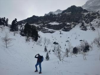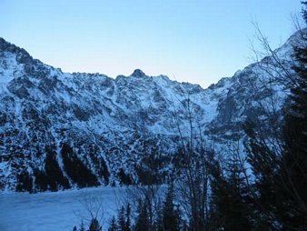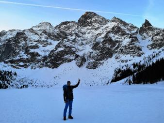 Pierwszy dzień obozu zimowego KW, za którego organizację ponownie odpowiadam. Po wyjątkowo szybkim dotarciu z bagażami do starego schroniska nad Morskim Okiem, pijemy z Szymonem kawkę i niespiesznie ruszamy w kierunku Czarnego Stawu. Na pierwszy ogień postanawiamy spróbować się na Cieniu Wielkiej Góry - drodze krótkiej i łatwej orientacyjnie, ale posiadającej jeden trudniejszy wyciąg, wyceniony oryginalnie na M6+ (obecnie od M5+ do M6-). Jest to jedna z najczęściej wybieranych dróg na Kotle Kazalnicy (a konkretnie Grzędzie Mięguszowieckiego Szczytu Czarnego) i stanowi dobre wprowadzenie do wspinania na tej ścianie.