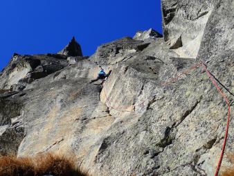 Dzień po wspinaniu po słowackiej stronie Tatr wybieram się z Damianem na Wegę (VIII+ 160m) na Mniszku. Droga okazuje się świetna - oferuje różnorodne wspinanie o dużej intensywności, do przejścia są bowiem cztery ósmekowe i dwa siódemkowe wyciągi w zaskakująco dobrej skale. Klasą porównać można ją do American Beauty na sąsiedniej ścianie (relacja z tego wielkiego klasyka TUTAJ), wymaga jednak zakładania własnej asekuracji – na wyciągu przez Okap Śmigło całkowicie, na pozostałych częściowo w łatwiejszym terenie. Z pewnością jest to jedna z lepszych linii w tych trudnościach w Tatrach i mimo niewielu przejść do tej pory zasługuje na miano nowoczesnego klasyka!