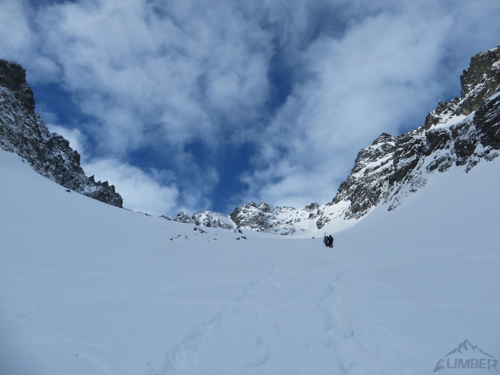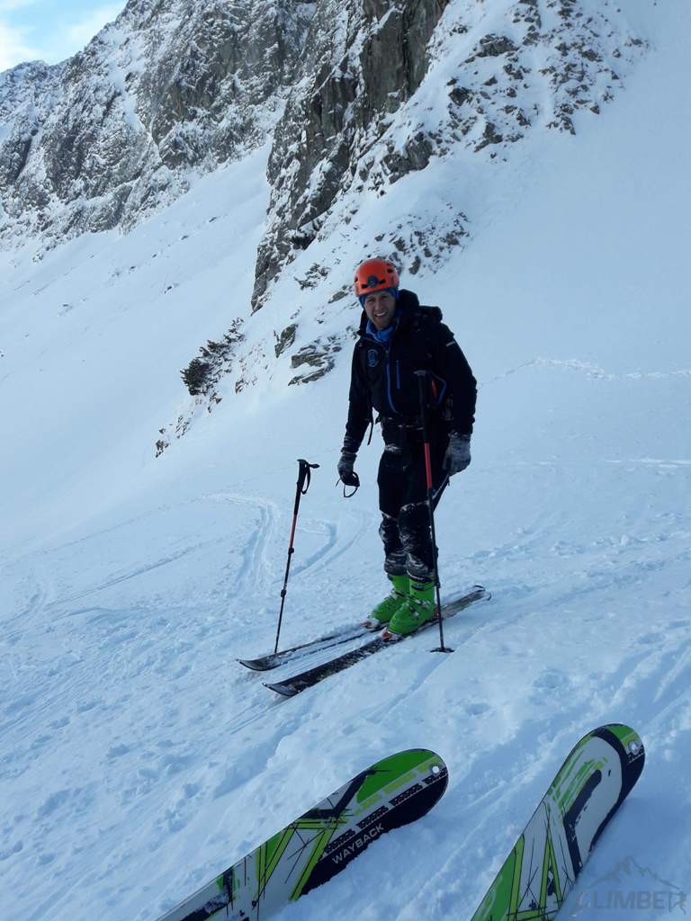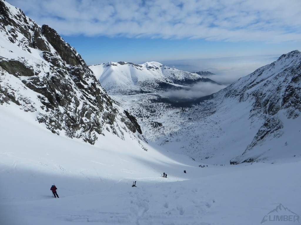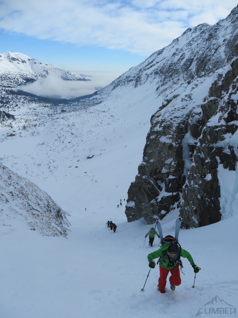 Żleb przechodzimy bardzo szybko, głównie z nartami na plechach, jest zdecydowanie twardziej niż gdy pokonywaliśmy tą samą drogę we wtorek. Postanawiamy podejść trochę wyżej by przedłużyć sobie zjazd, w Kotlinie Baraniej żegnamy się z Ryśkiem który idzie dalej na Baranią Przełęcz, ściągamy foki i jedziemy w dół. Górą jedzie się dobrze, sama Flaszka jest jednak w gorszym stanie niż kilka dni temu. Po drodze mijamy jeszcze kilku klubowiczów, jeden z nich kręci nawet krótki filmik z kawałka naszego zjazdu :)