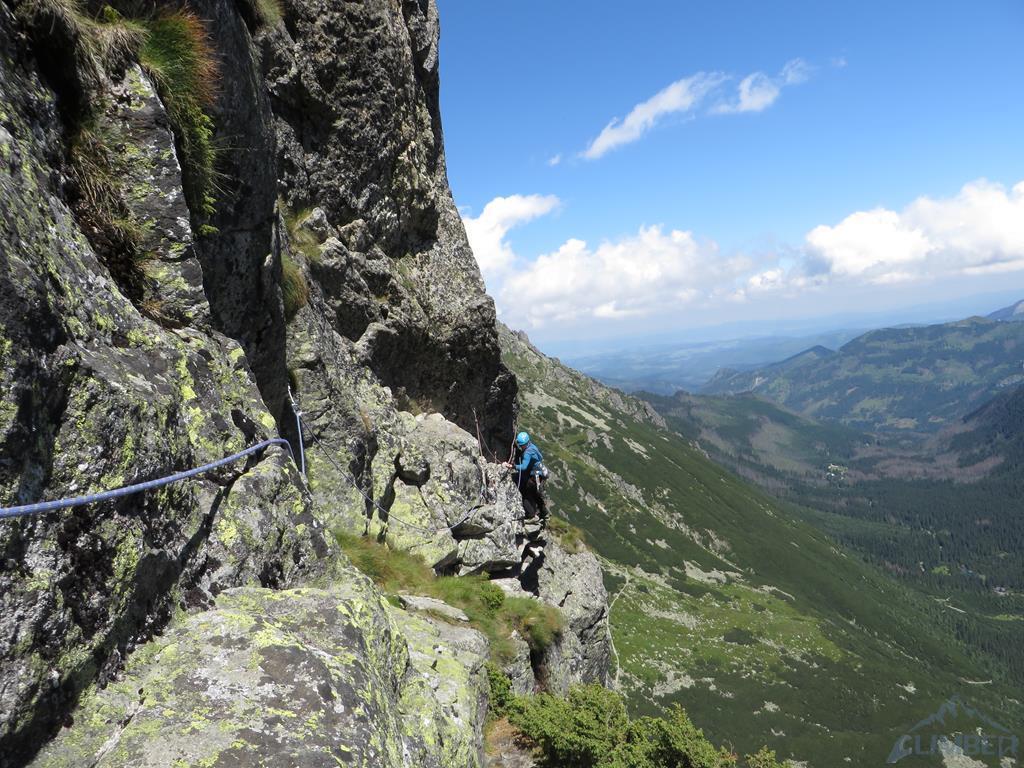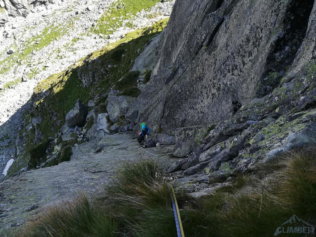 Na początek Zacięcie Biela i moje prowadzenie - jestem nierozgrzany więc pierwsze ruchy mam drewniane, z każdym ruchem jest jednak lepiej. Im wyżej w zacięciu, tym trudniej - jestem zmuszony sprężyć się na maxa, głośno wzdycham i pokrzykuję ale daję radę - jeszcze tylko kawałek łatwego terenu i stan (2 spity). Po chwili dołącza do mnie Ela, mogę więc ruszać dalej. Szybko przechodzę Skośne Zacięcie, które okazuje się bardzo ładne i komfortowe w asekuracji (kilka spitów), po czym docieram z powrotem na Dolne Półki, z których przed rozpoczęciem wspinania zjeżdżaliśmy. Ściągam Elę i namawiam ją na prowadzenie kolejnego wyciągu - pięknej Rysy Hobrzańskiego. Okazuje się, że cała rysa wymaga własnej asekuracji, więc koleżanka przeżywa długie ciężkie chwile podczas swojego przejścia, ale pięknie daje radę bez bloku! Idę na drugiego i szczerze podziwiam urodę tego odcinka oraz lufę pod nogami. Do stanu dochodzę ostro zbułowany... Szybko przechodzimy krótki wyciąg "łącznikowy" i stajemy pod Zacięciem Kosińskiego.