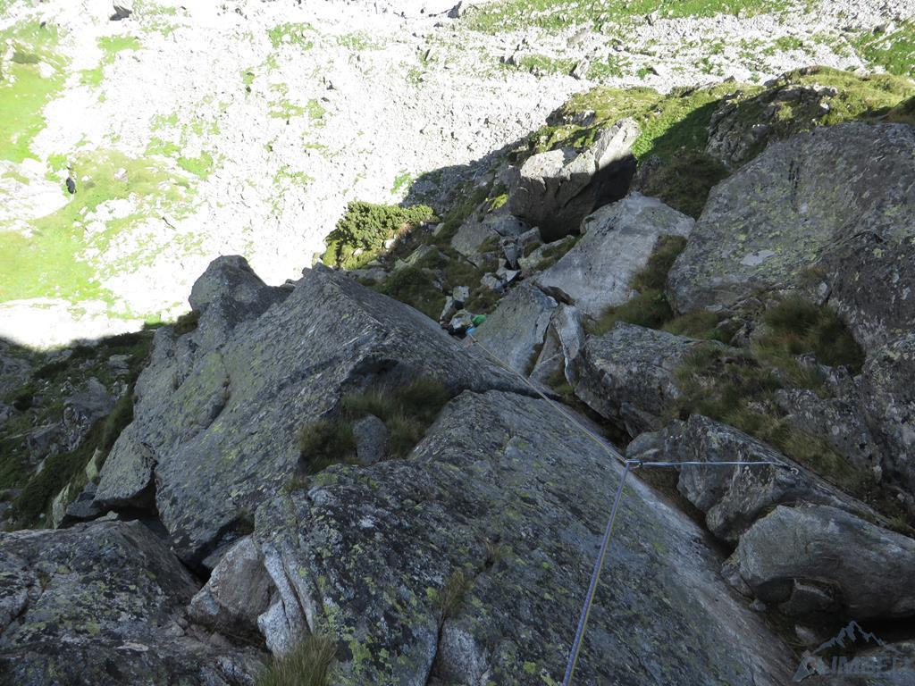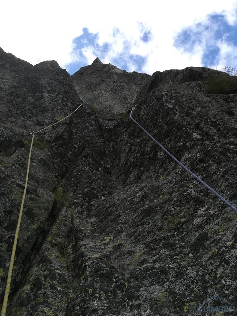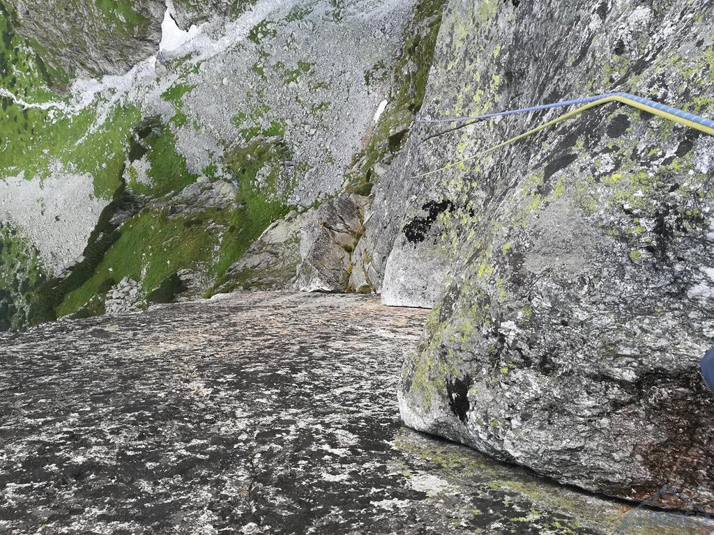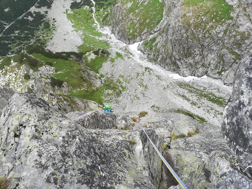 Na szczęście nic poważnego się nie stało, opuszczam koleżankę na stan i postanawiamy dać sobie spokój z ostatnimi metrami drogi - skoro jest mokro miałbym ten sam problem na wyjściu. Żeby skończyć ścianę prowadzę ostatni wyciąg (VI+) z Międzymiastowej (wspólny stan) i stajemy na Górnych Półkach Mnichowych, dokładnie w miejscu, które Ela już niedawno dotykała 😉. Zjeżdżamy Kosińskim by zebrać sprzęt, kolejny zjazd początkowymi wyciągami Międzymiastowej i stajemy pod ścianą, kończąc dzisiejsze zmagania. Jest już 19-ta, na Szałasiska docieramy więc późno, sił starcza tylko na kolację i szybkie piwo. Padamy do namiotów - jutro trzeba próbować działać dalej bo jest szansa, że nie będzie lać!