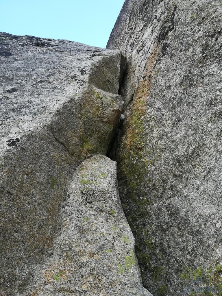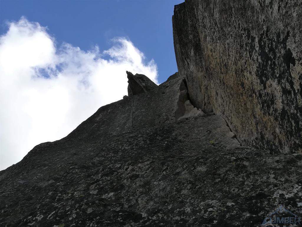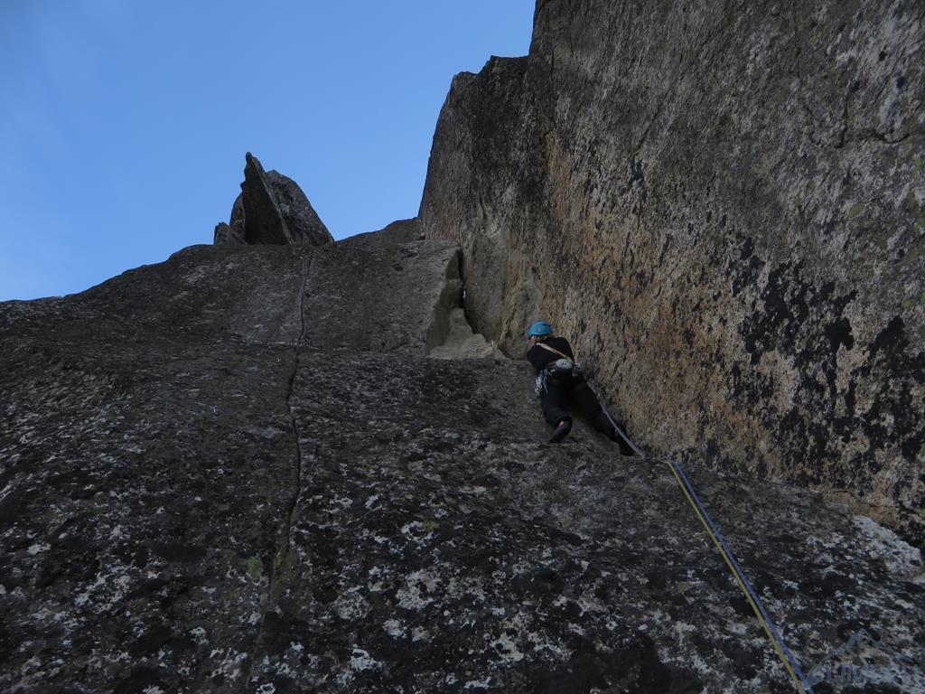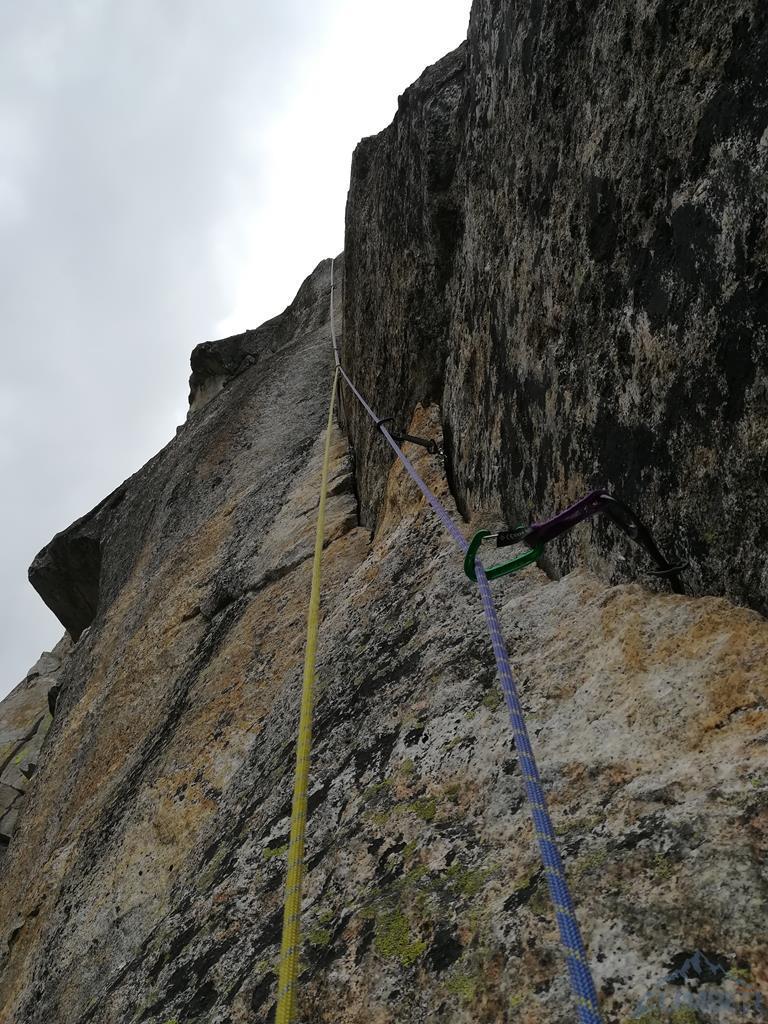 Okazuje się, że ten siódemkowy wyciąg również pozbawiony jest spitów i haków, trzeba więc zawierzyć wyłącznie swojemu sprzętowi i umiejętności jego osadzania 😉. Wracam na prowadzenie, śmiało przechodzę pierwsze metry i staję pod ścianką z rysą w zamkniętym zacięciu. Niestety długo próbuję znaleźć właściwą kombinację ruchów (trikowe) i gdy w końcu wychodzę z zacięcia, odcina mnie i przed lotem ratuje mnie tylko szybko osadzony mikrofriend. Ela opuszcza mnie na stan i rusza spróbować. Patent na wyjście jest już znany, sprawnie wychodzi więc na półkę i staje pod ostatnim spionowanym zacięciem kończącym drogę. Z dołu wygląda niewinnie, okazuje się jednak, że wycena VII nie bierze się znikąd, a cienka rysa w pionowym zacięciu wymaga sprawnego operowania palcami. Koleżanka powoli ale sprawnie porusza się coraz wyżej i gdy łapie już rysy na półce, wydaje się, że jest po temacie. Niestety, nyża jest zalana wodą, ręka wyjeżdża z chwytu i Ela zalicza nieprzyjemny lot do półki pod zacięciem. Tutaj mała dygresja - miejsce jest niebezpieczne i gdy prowadzący nie założy asekuracji odpowiednio wysoko, w przypadku odpadnięcia uderzenie w półkę gwarantowane. Kiedyś na wyjściu był spit...