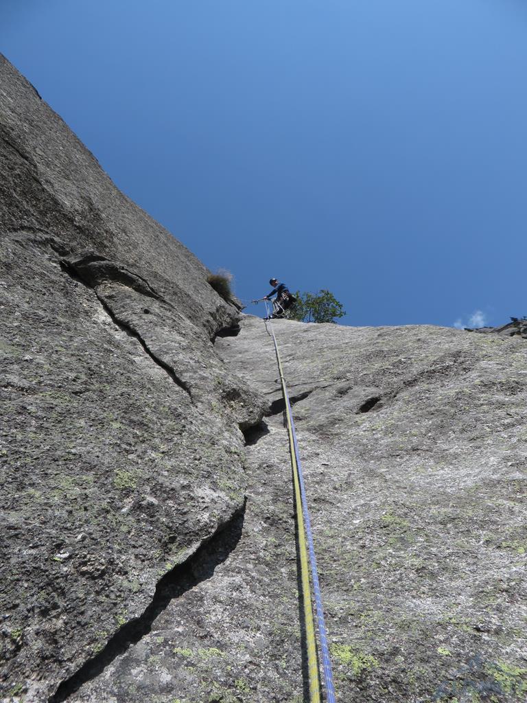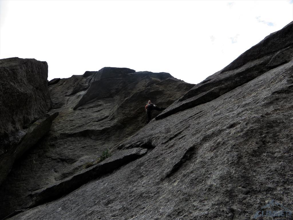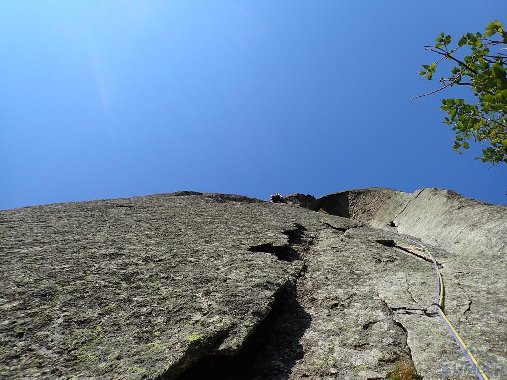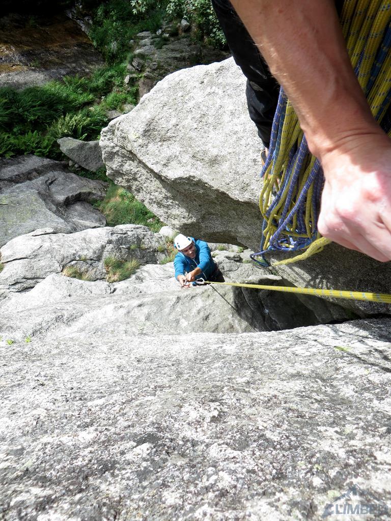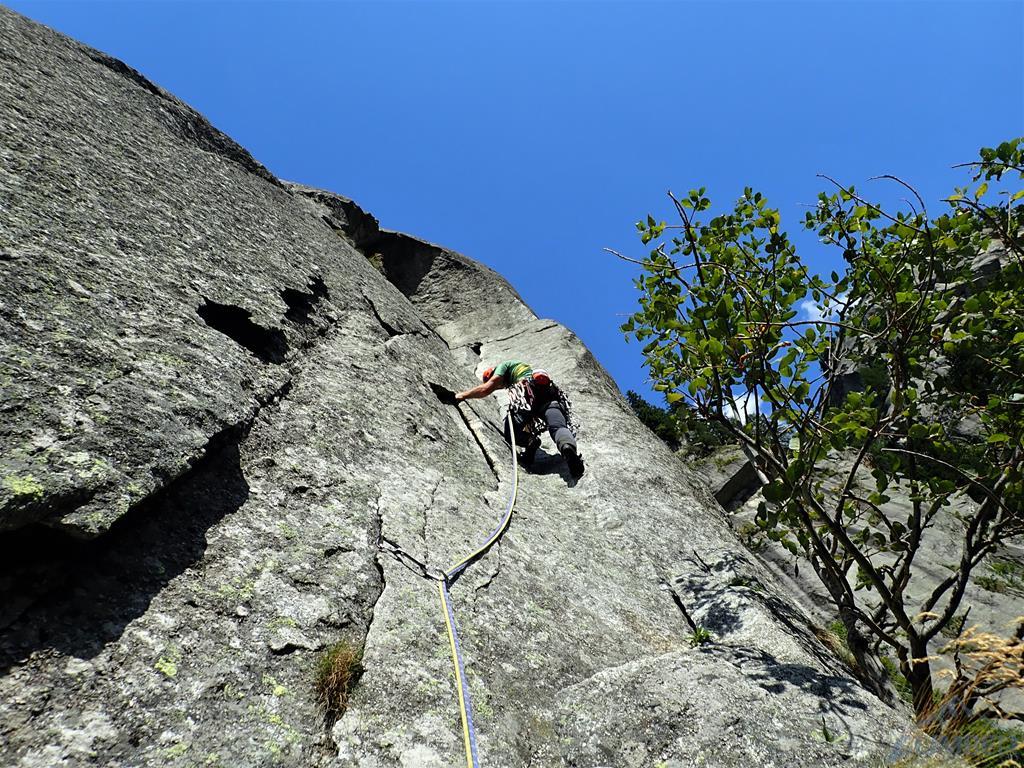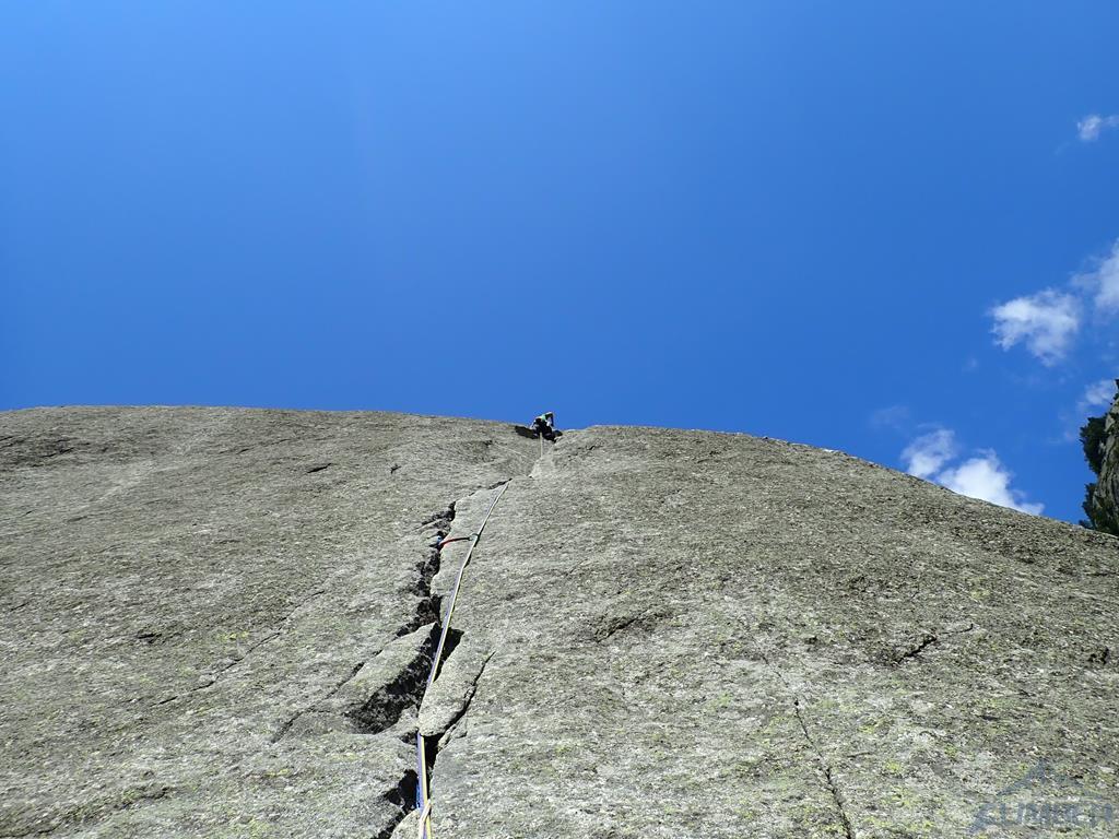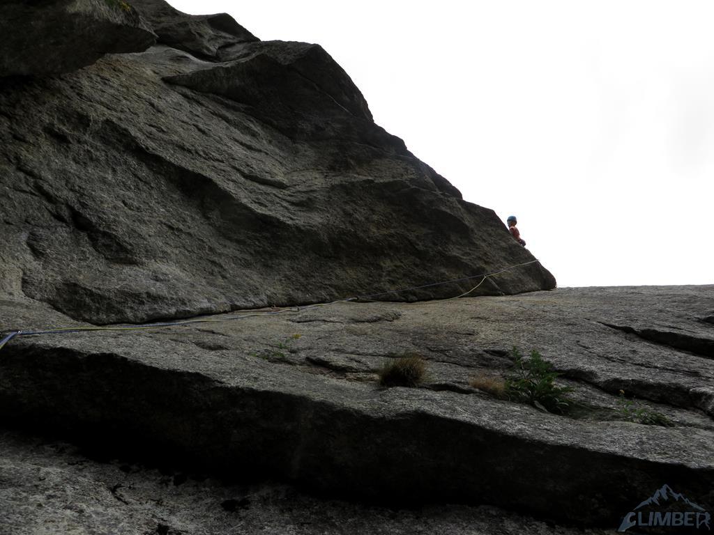 Teraz proponuję byśmy prowadzili już po dwa wyciągi - drugi bardzo mi się spodobał więc chciałem się z nim koniecznie zmierzyć. Na początek kawałek komino-zacięciem (dalej do góry idzie inna znana droga, Polimago), po czym wejście w tarciowy trawers z podchwytami ukrytymi pod okapem, z trudnościami do VII-. Daję radę i zadowolony ściągam do siebie kolegę, zerkając do góry na przepiękną rysę w zacięciu, która na mnie czeka. Ten wyciąg (V+) nie tylko pięknie wygląda, pięknie się również na nim wspina. Kolejny wyciąg również jest kapitalny - rysa pomiędzy dwoma ścianami za ok. VI/VI+ daje mnóstwo frajdy. Rysiek spokojnie daje radę na tym, jak i kolejnym, nie mniej urodziwym odcinku - prowadzącym najpierw po płycie, a po przewinięciu koło okapiku zacięciem wzdłuż rysy (VI-).