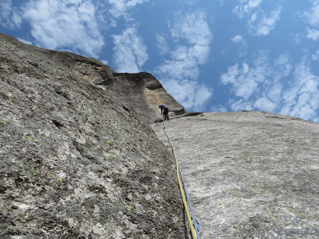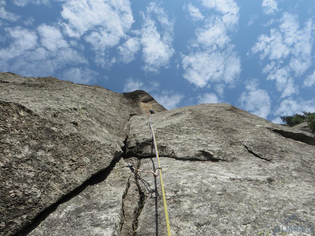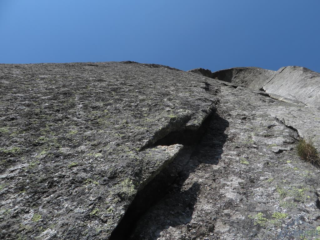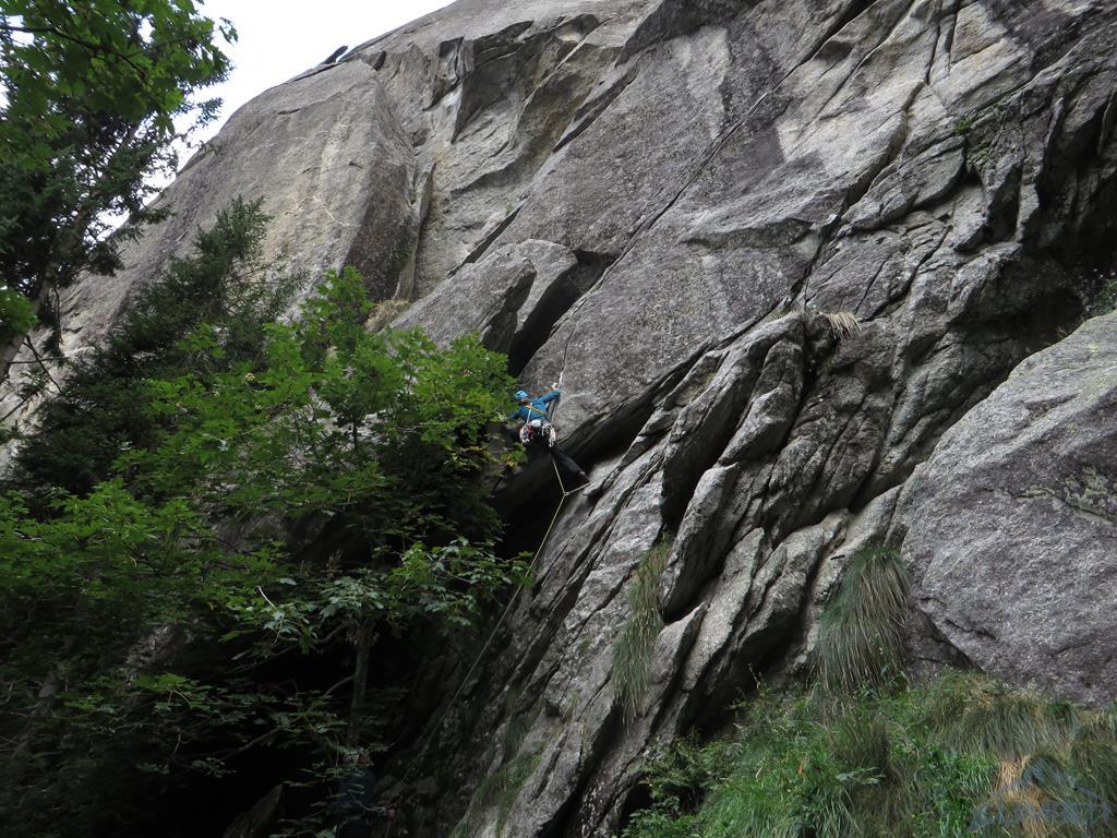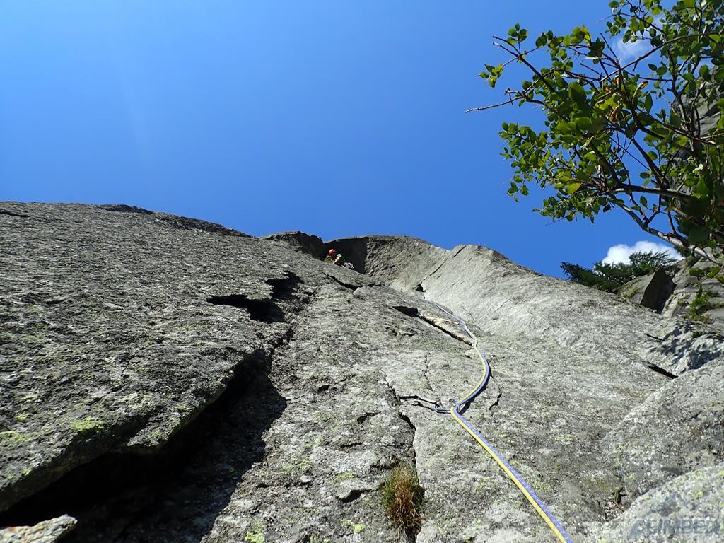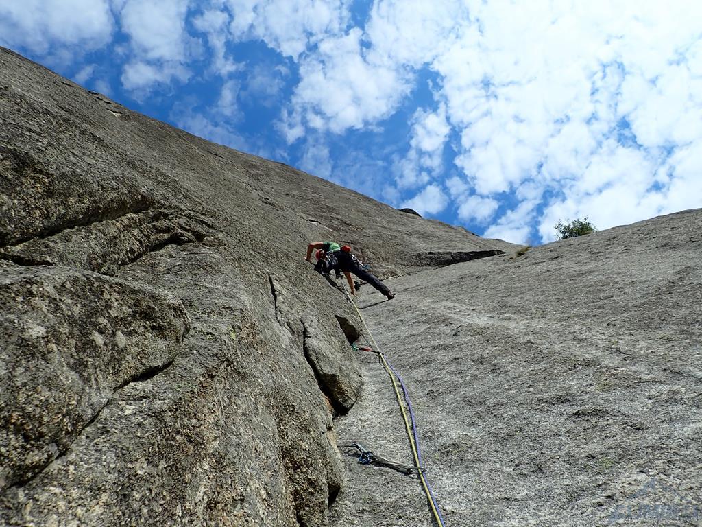 Teraz proponuję byśmy prowadzili już po dwa wyciągi - drugi bardzo mi się spodobał więc chciałem się z nim koniecznie zmierzyć. Na początek kawałek komino-zacięciem (dalej do góry idzie inna znana droga, Polimago), po czym wejście w tarciowy trawers z podchwytami ukrytymi pod okapem, z trudnościami do VII-. Daję radę i zadowolony ściągam do siebie kolegę, zerkając do góry na przepiękną rysę w zacięciu, która na mnie czeka. Ten wyciąg (V+) nie tylko pięknie wygląda, pięknie się również na nim wspina. Kolejny wyciąg również jest kapitalny - rysa pomiędzy dwoma ścianami za ok. VI/VI+ daje mnóstwo frajdy. Rysiek spokojnie daje radę na tym, jak i kolejnym, nie mniej urodziwym odcinku - prowadzącym najpierw po płycie, a po przewinięciu koło okapiku zacięciem wzdłuż rysy (VI-).
