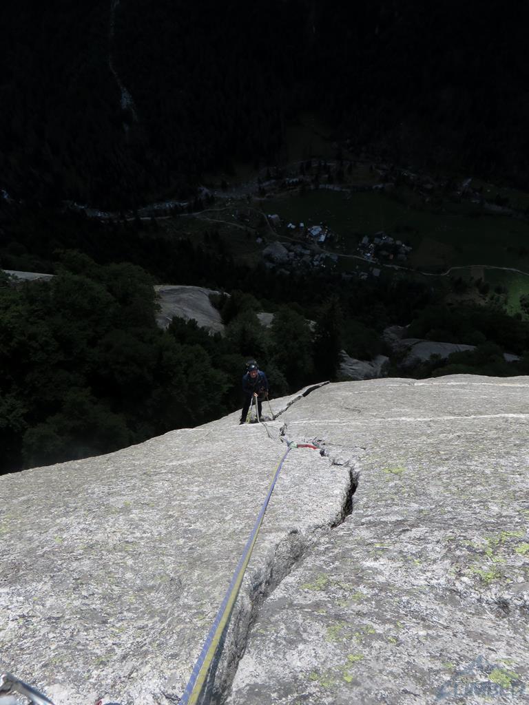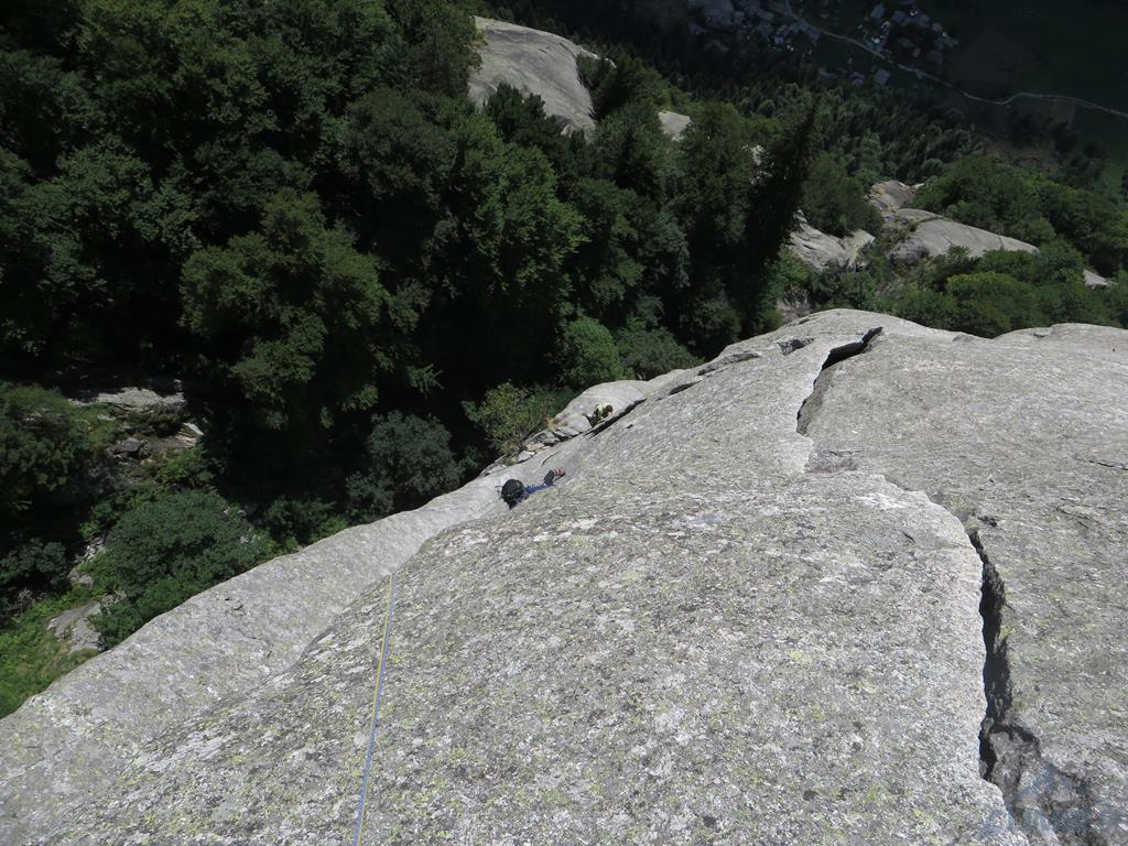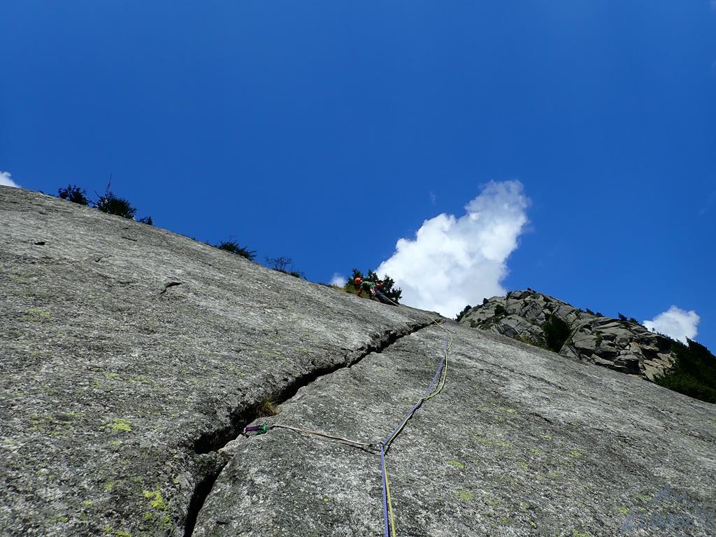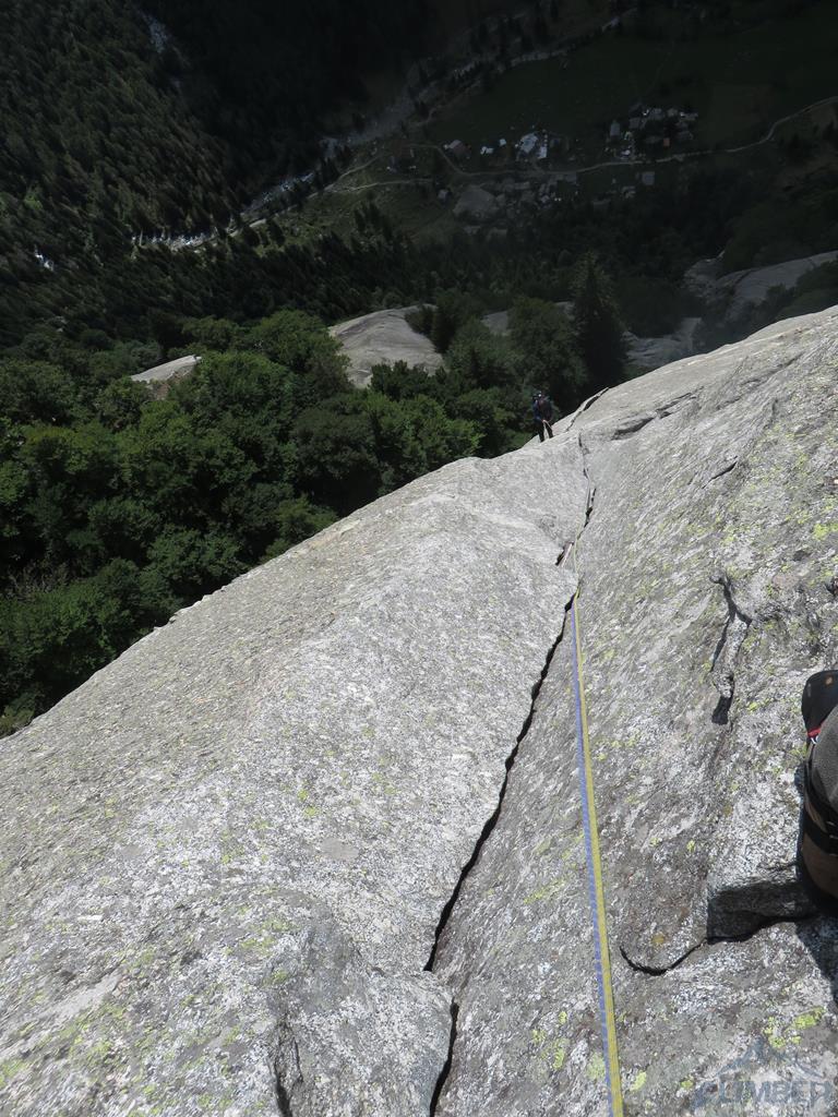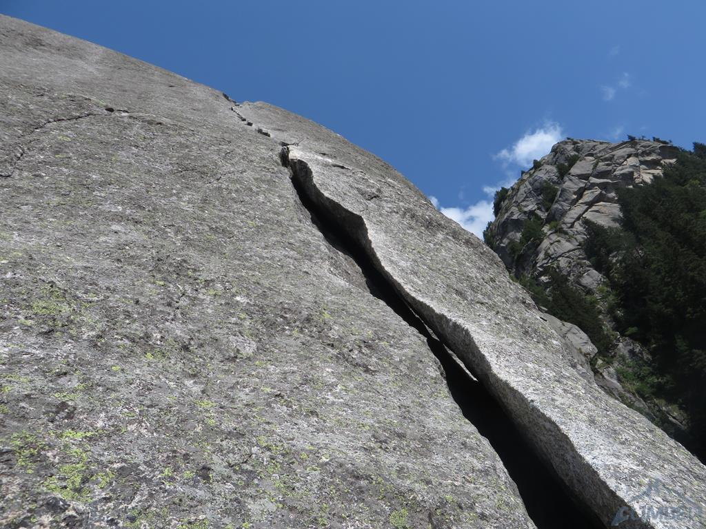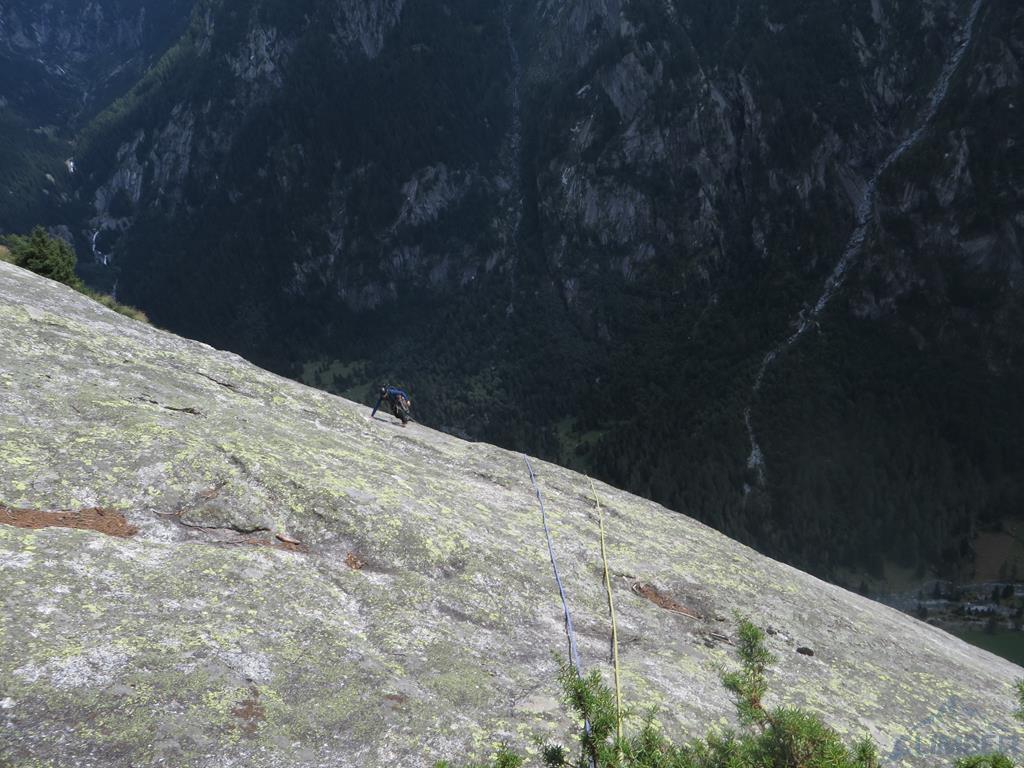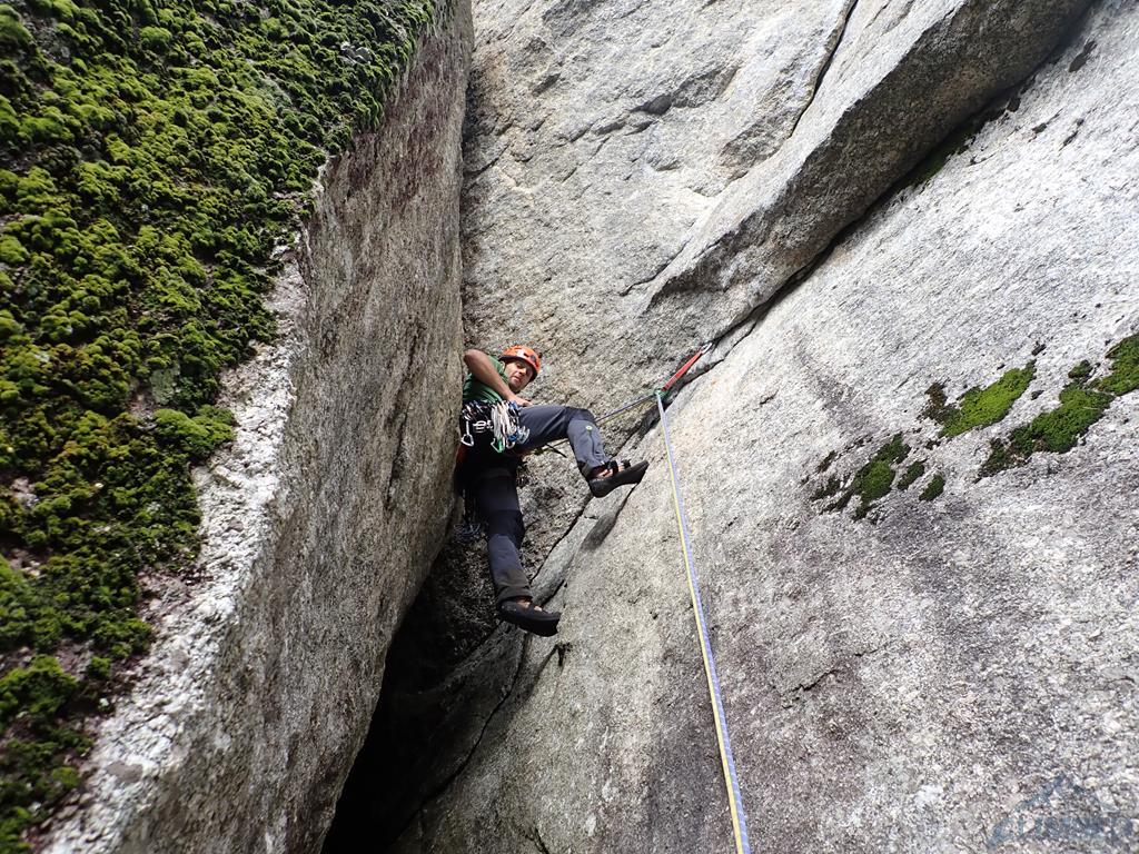 Teraz proponuję byśmy prowadzili już po dwa wyciągi - drugi bardzo mi się spodobał więc chciałem się z nim koniecznie zmierzyć. Na początek kawałek komino-zacięciem (dalej do góry idzie inna znana droga, Polimago), po czym wejście w tarciowy trawers z podchwytami ukrytymi pod okapem, z trudnościami do VII-. Daję radę i zadowolony ściągam do siebie kolegę, zerkając do góry na przepiękną rysę w zacięciu, która na mnie czeka. Ten wyciąg (V+) nie tylko pięknie wygląda, pięknie się również na nim wspina. Kolejny wyciąg również jest kapitalny - rysa pomiędzy dwoma ścianami za ok. VI/VI+ daje mnóstwo frajdy. Rysiek spokojnie daje radę na tym, jak i kolejnym, nie mniej urodziwym odcinku - prowadzącym najpierw po płycie, a po przewinięciu koło okapiku zacięciem wzdłuż rysy (VI-).