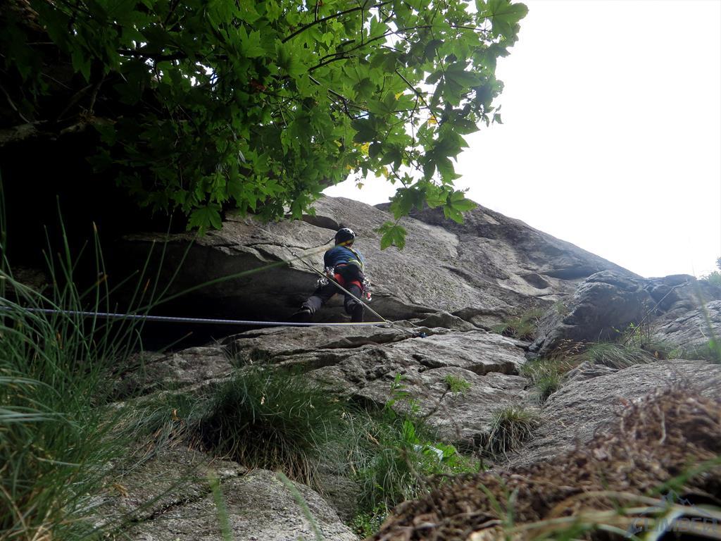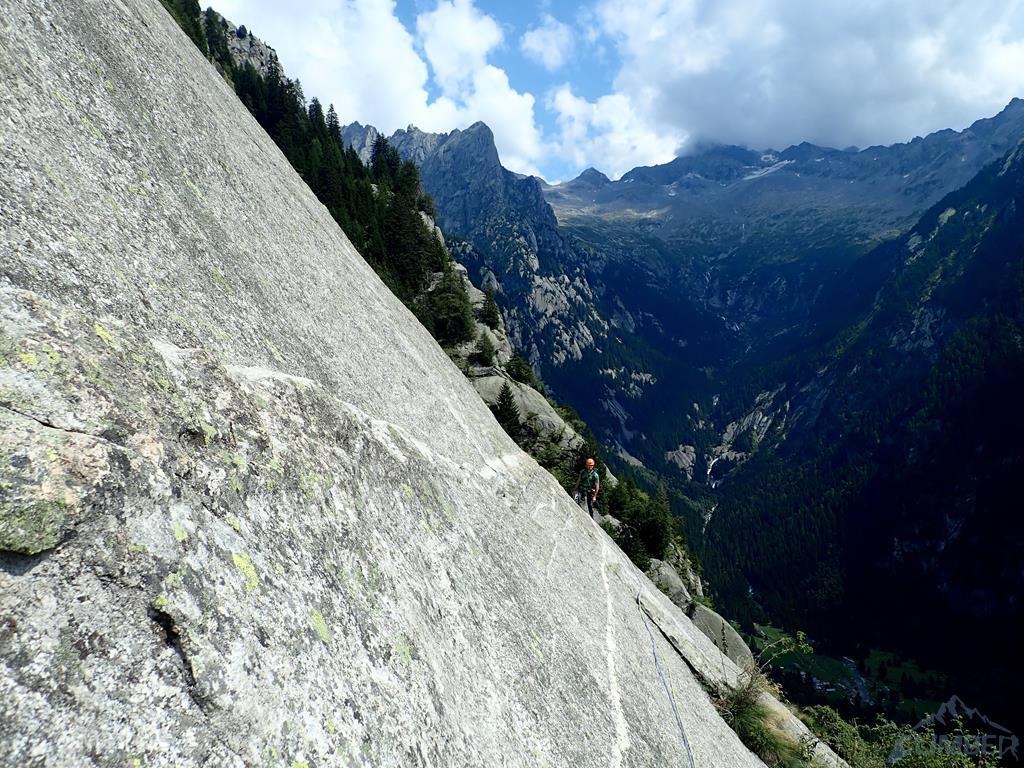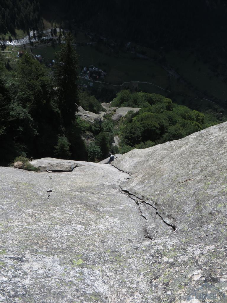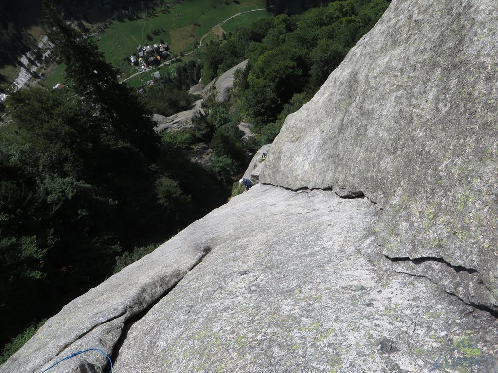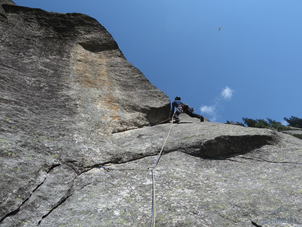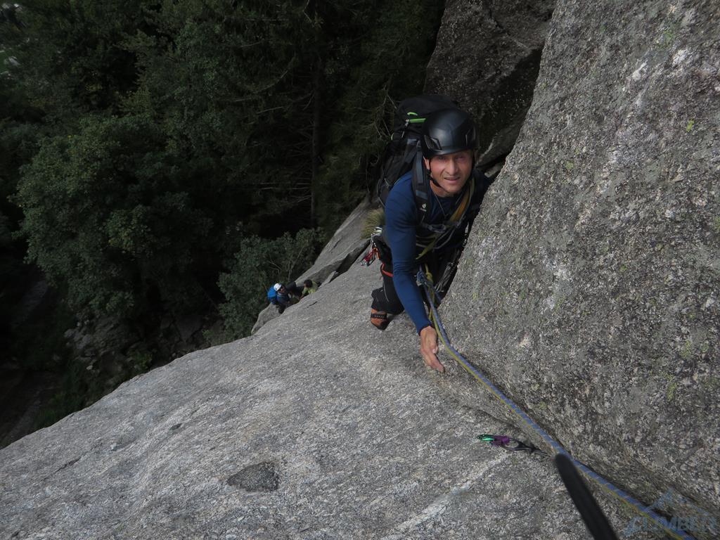 Teraz proponuję byśmy prowadzili już po dwa wyciągi - drugi bardzo mi się spodobał więc chciałem się z nim koniecznie zmierzyć. Na początek kawałek komino-zacięciem (dalej do góry idzie inna znana droga, Polimago), po czym wejście w tarciowy trawers z podchwytami ukrytymi pod okapem, z trudnościami do VII-. Daję radę i zadowolony ściągam do siebie kolegę, zerkając do góry na przepiękną rysę w zacięciu, która na mnie czeka. Ten wyciąg (V+) nie tylko pięknie wygląda, pięknie się również na nim wspina. Kolejny wyciąg również jest kapitalny - rysa pomiędzy dwoma ścianami za ok. VI/VI+ daje mnóstwo frajdy. Rysiek spokojnie daje radę na tym, jak i kolejnym, nie mniej urodziwym odcinku - prowadzącym najpierw po płycie, a po przewinięciu koło okapiku zacięciem wzdłuż rysy (VI-).