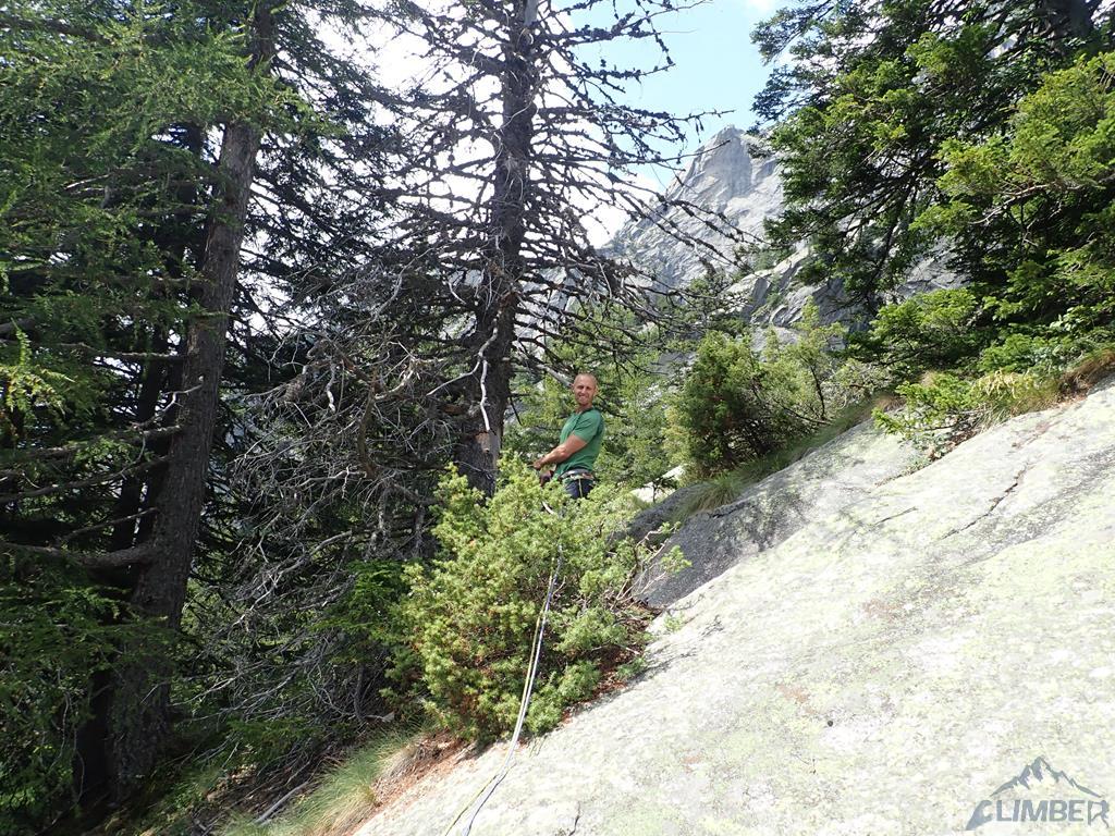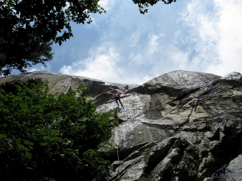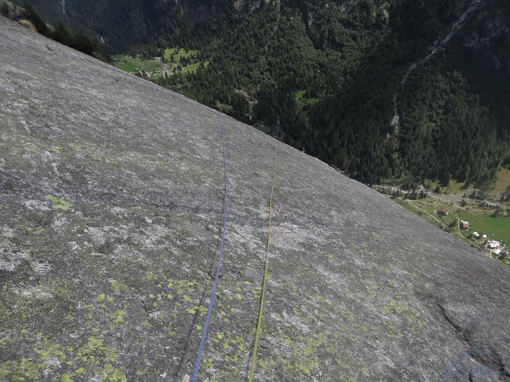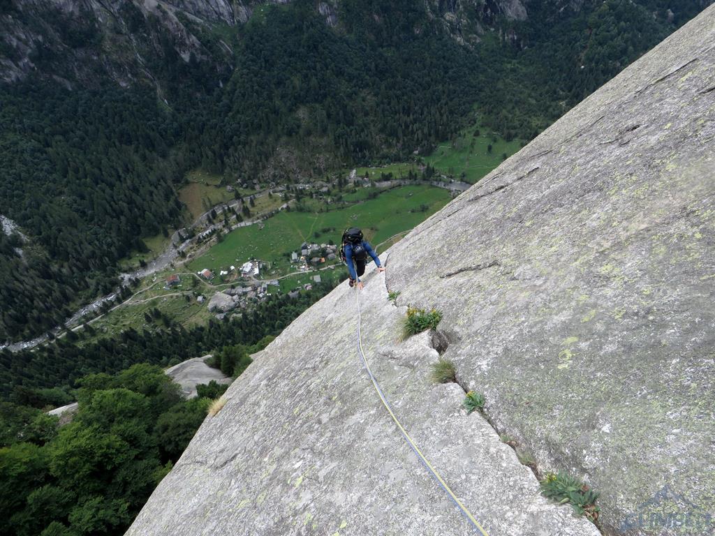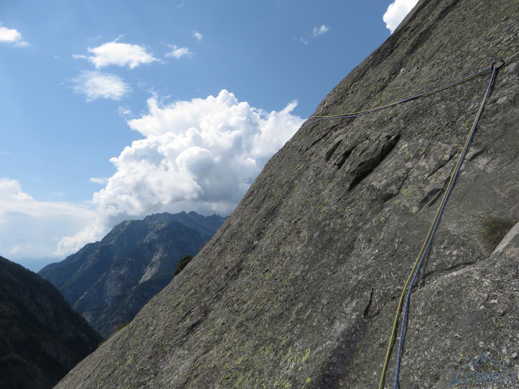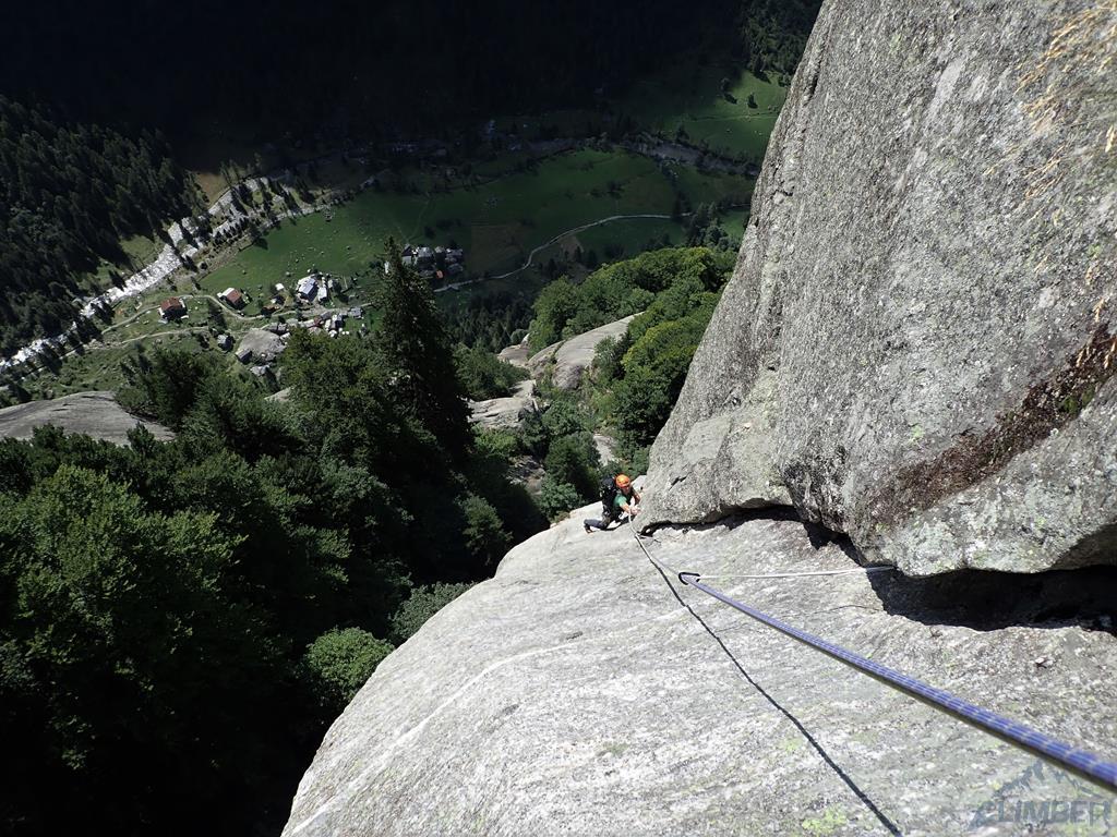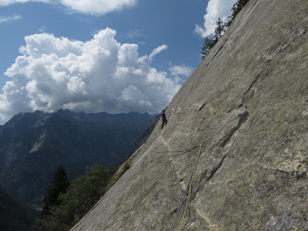 Teraz proponuję byśmy prowadzili już po dwa wyciągi - drugi bardzo mi się spodobał więc chciałem się z nim koniecznie zmierzyć. Na początek kawałek komino-zacięciem (dalej do góry idzie inna znana droga, Polimago), po czym wejście w tarciowy trawers z podchwytami ukrytymi pod okapem, z trudnościami do VII-. Daję radę i zadowolony ściągam do siebie kolegę, zerkając do góry na przepiękną rysę w zacięciu, która na mnie czeka. Ten wyciąg (V+) nie tylko pięknie wygląda, pięknie się również na nim wspina. Kolejny wyciąg również jest kapitalny - rysa pomiędzy dwoma ścianami za ok. VI/VI+ daje mnóstwo frajdy. Rysiek spokojnie daje radę na tym, jak i kolejnym, nie mniej urodziwym odcinku - prowadzącym najpierw po płycie, a po przewinięciu koło okapiku zacięciem wzdłuż rysy (VI-).