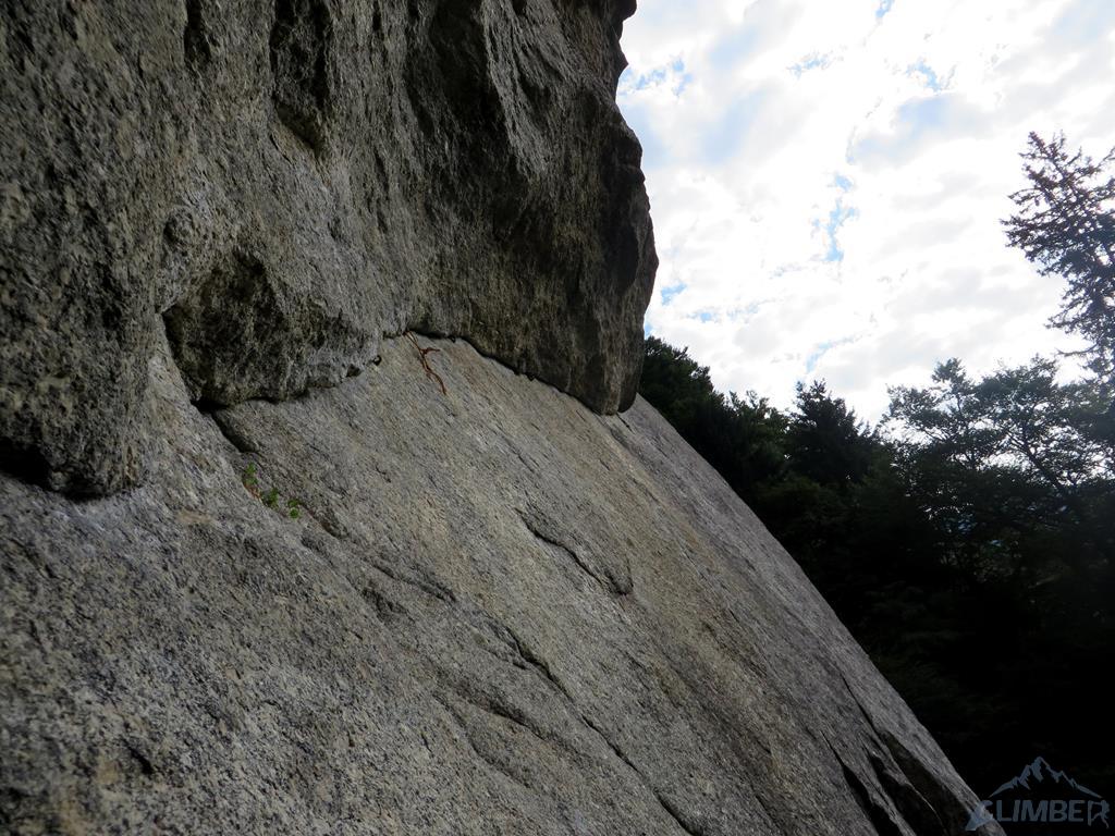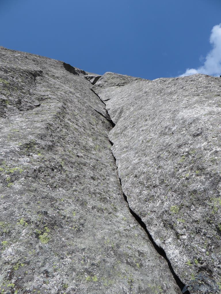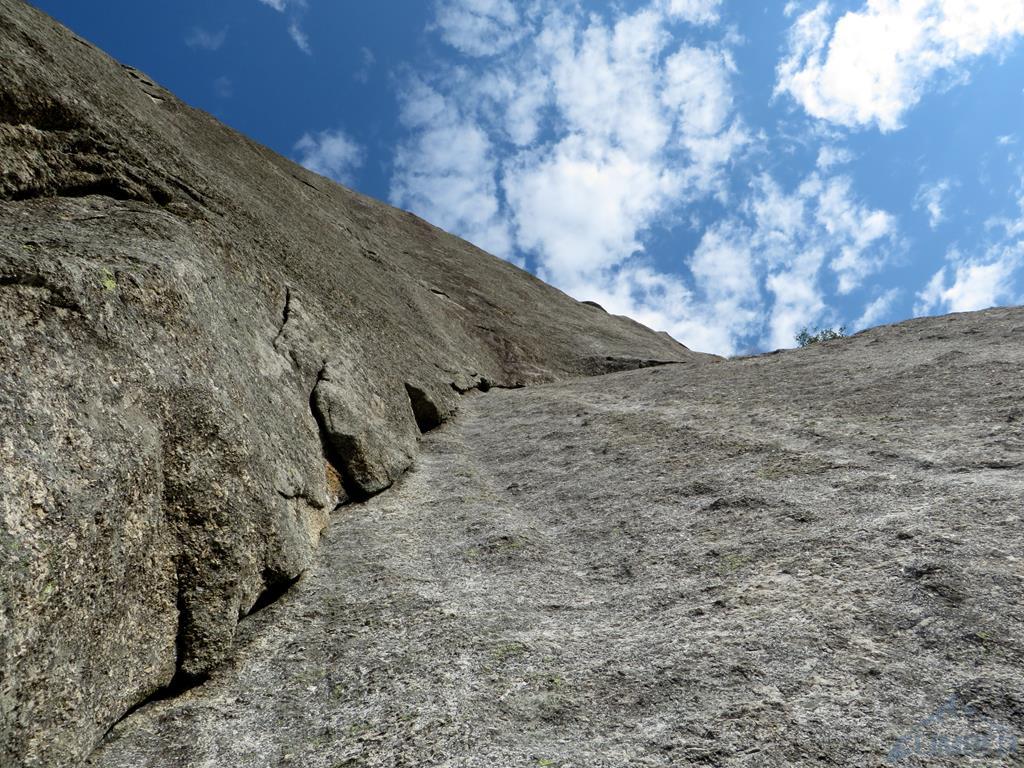 Kolejny odcinek to wymarzone wręcz zacięcie z rysą (V+), przechwyty robię najwolniej jak się da bo wspinanie jest tak piękne, że nie chcę by się skończyło! W końcu się jednak kończy, dochodzi Rysiek i rusza dalej. Teraz czeka nas najbardziej najdziwniejszy wyciąg na drodze - trzydziestometrowy trójkowy trawers, prowadzący po skalnej "listwie" w płycie, na którym da się założyć co najwyżej 2 przeloty. Taki podniebny spacer w morzu granitu 😊. Ostatni fragment miał również należeć do Ryśka, oddaje mi jednak prowadzenie. Idę kawałek rysą i odbijam na ogromną płytę w lewo. Okazuje się jednak, że wchodzę na nią za wysoko i trafiam na połóg o trudnościach V-VI bez jakiejkolwiek możliwości asekuracji. Po drodze kilka razy muszę sobie powtarzać jak to jestem dobrze rozwspinany w połogach i na pewno nie zaliczę kilkudziesięciometrowego lota. Przechodzę sobie tak jakieś 30 metrów, aż docieram do rysy kończącej wyciąg, gdzie w końcu wpinam się do haka. Trzy minuty później dochodzę do drzew, gdzie droga się kończy.