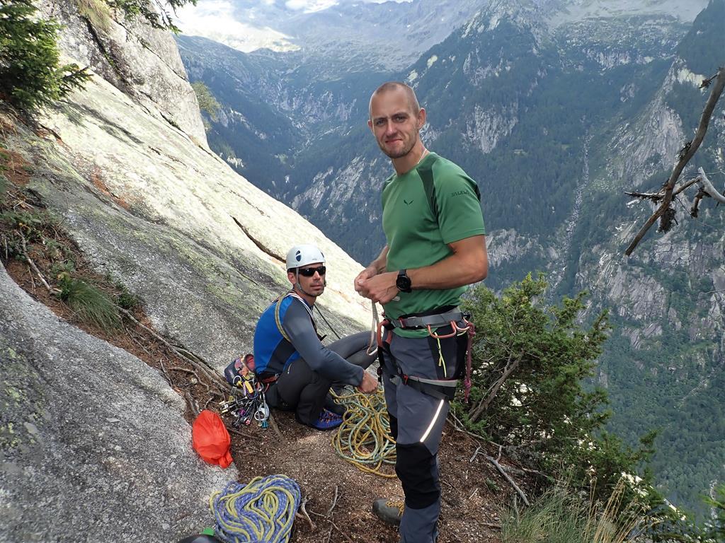 Ściągam Ryśka i rozkładamy się na prawie godzinnego resta bo mimo iż chłopaki szli tuż za nami, ciągle ich na ostatniej płycie nie widać. Słyszę jak Rysiek rozmawia z Szymonem przez radio, instruując go gdzie ma iść, nie zwracam jednak na to większej uwagi. Może dlatego nie odnotowuję, że Szymon pytał o wyciąg przedostatni, a Rysiek podaje mu jak ma iść na ostatnim 😉. Robią się z tego niezłe jaja, bo zgodnie ze wskazówkami Szymon podchodzi kawałek do góry i skręca w lewo na płytę - zamiast więc przejść trawers do stanowiska, ląduje na nieasekurowalnych płytach nad nim... Gdy w końcu kolega pojawia się na ostatnim odcinku, kończy mu się lina i musi poprosić Romka o podejście. Ten drugi dochodząc do nas nie może się nadziwić cóż to za dziwny wyciąg był 😊.