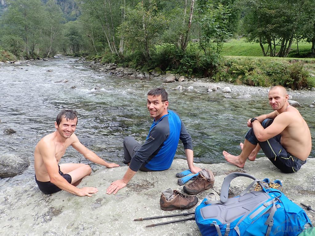 Jesteśmy w komplecie, po chwili więc zaczynamy zejście. A właściwie najpierw idziemy do góry, bo wg wskazówek lokalesów trzeba wysoko przekroczyć żleb przecinający ścianę. Do tego żlebu władowali się w środę nasi znajomi, robią tak zresztą prawie wszyscy bo najwyraźniejsza ścieżka tam prowadzi. Co ciekawe wyżej jest jeszcze jeden zapych, do którego wchodzimy, szybko się jednak wracamy. Gdy żleb się już przekroczy, zejście pod ścianę jest ewidentne. Wracamy na dno doliny ścieżką i rozkładamy się kilka minut na rzeką by schłodzić stopy (albo jak Romek całe ciało).