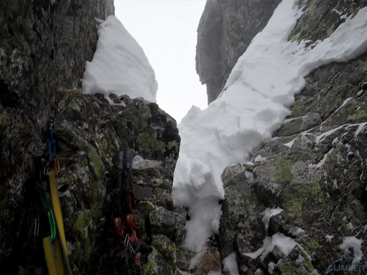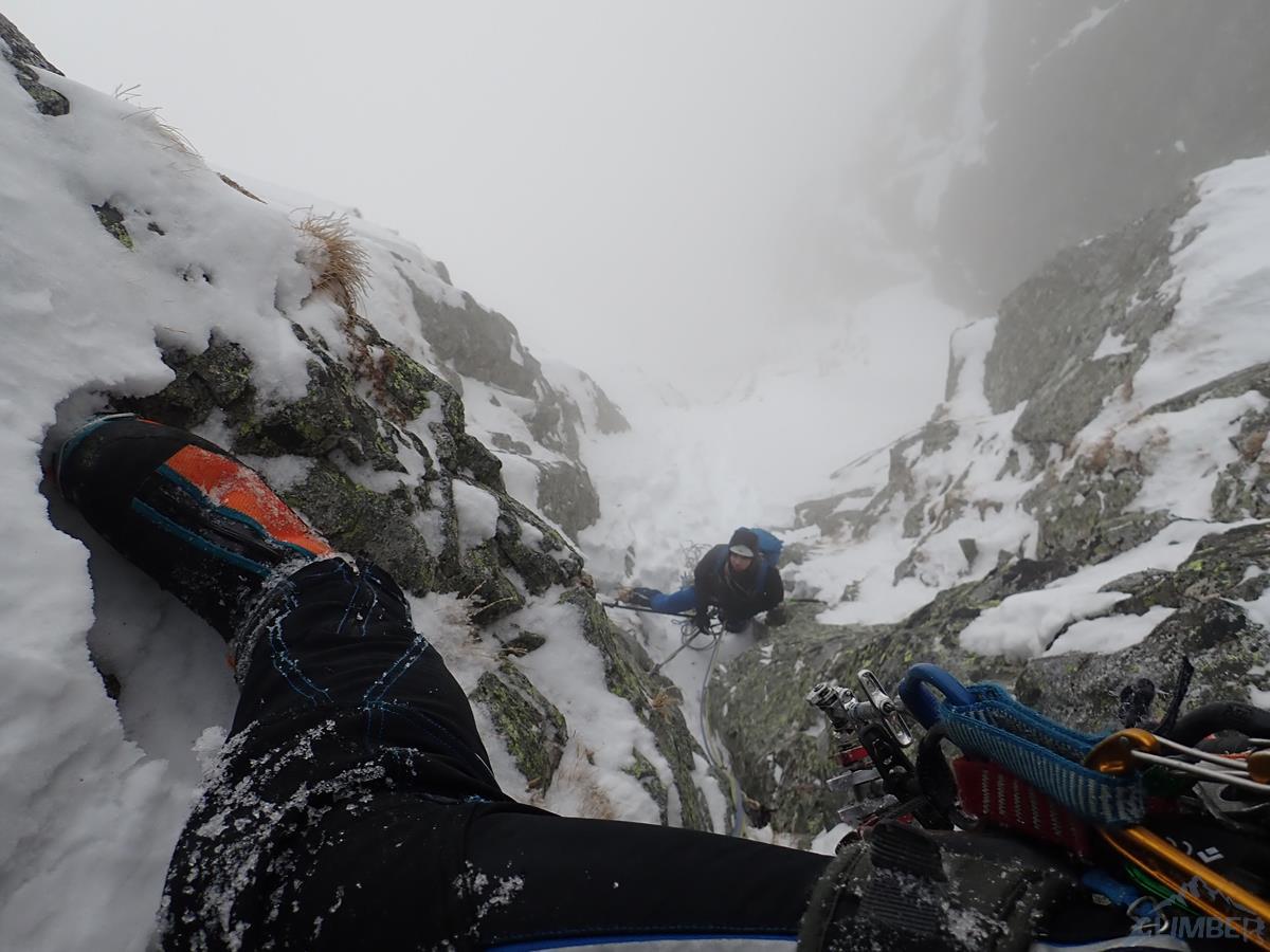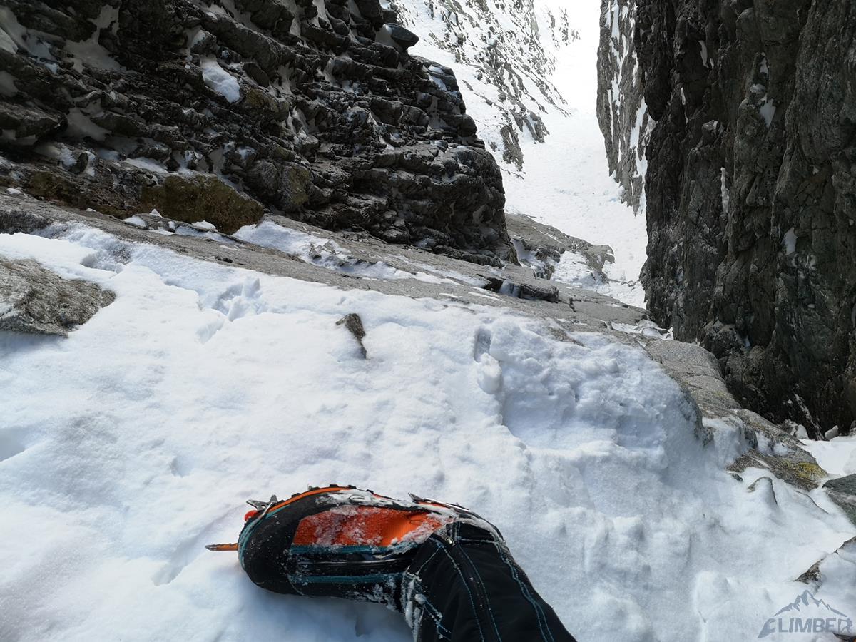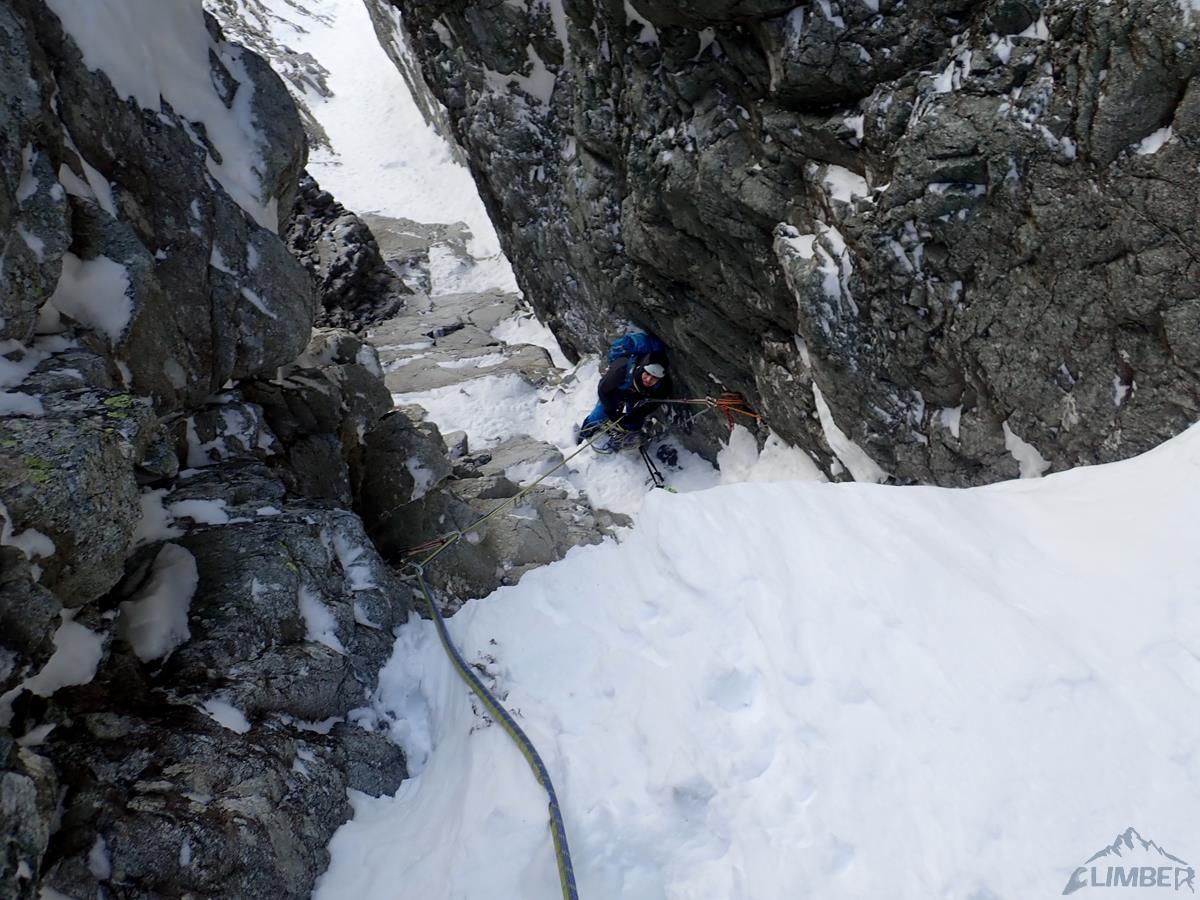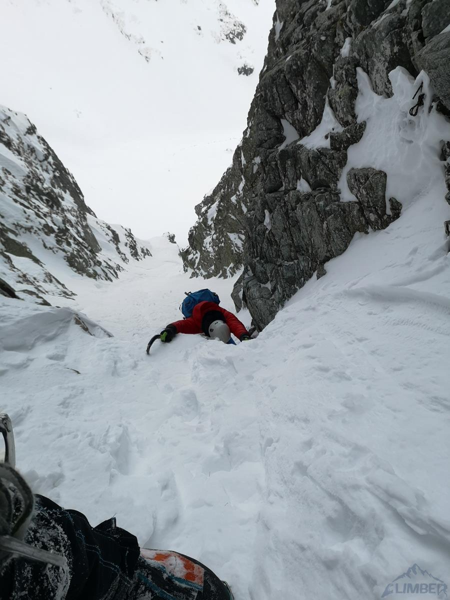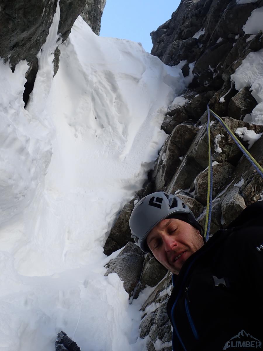 Pogoda rano jest kapitalna, trochę nas to rozleniwia i podchodzimy niezbyt szybko podziwiając widoki i wypatrując celów na przyszłość. Gdy już docieramy pod naszą drogę, okazuje się, że warunki w dolnej części (żlebie) są kapitalne, przebiegamy je więc bardzo szybko. Niestety od początku komina śnieg jest fatalny - miejscami luźny i sypki, miejscami zbity w miękkie mury odgradzające przejście. Lodu brak, mnóstwo luźnych kamieni, niektóre dość pokaźne, uniki na drugiego były więc wskazane 😉. Szymon próbuje pierwszy trudny odcinek i po przejściu czujnej płyty nie daje rady na ściance, którą chcemy ominąć śnieżny nawis. Ja pokonuję ten fragment nie bez problemów, na dodatek okazuje się, że po nim są jeszcze dwa niebanalne progi w podobnie niesprzyjających warunkach. Mimo tego iż trudności pokonujemy bardzo powoli, postanawiamy jednak się nie wycofywać i sięgnąć po swoje rezerwy - w dobrych warunkach na drodze zimą można spotkać odcinki do M5, tym razem było nieco trudniej.