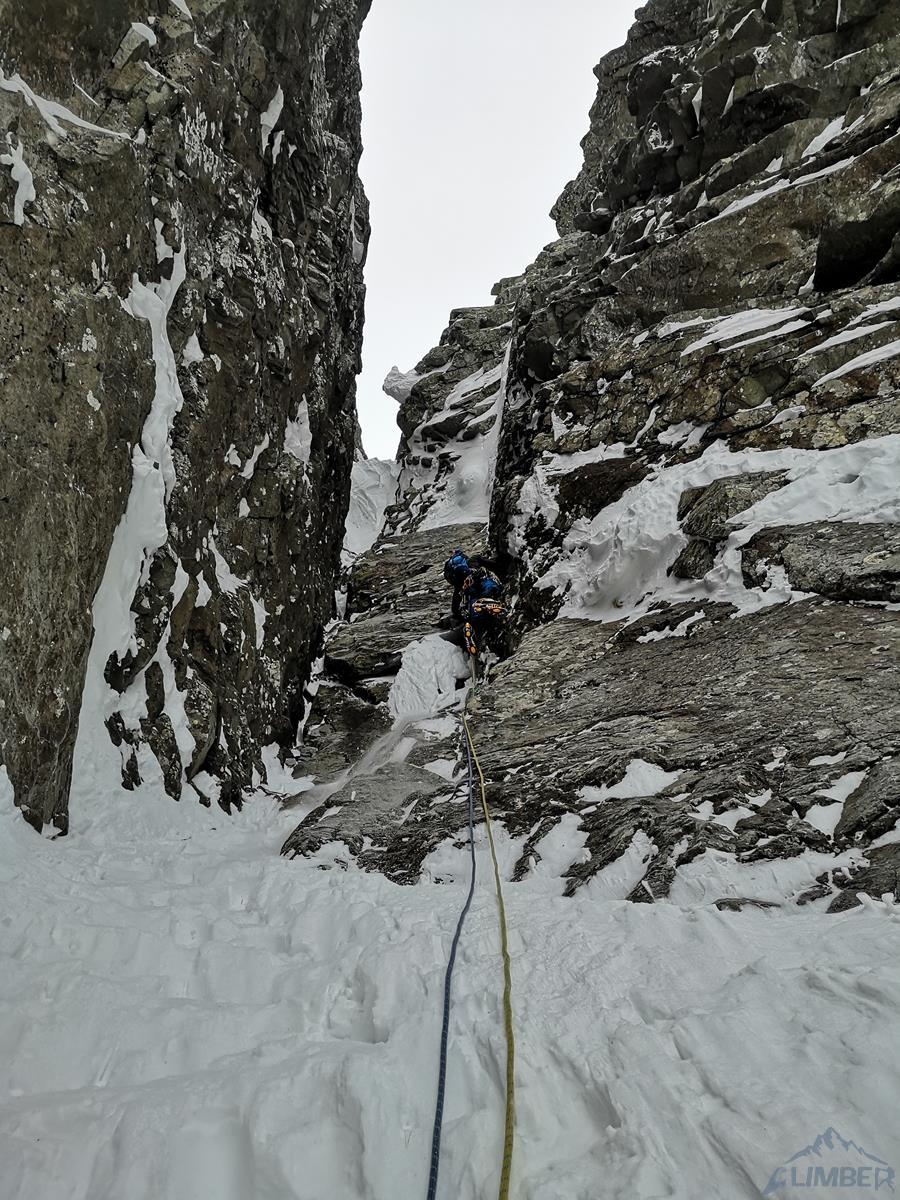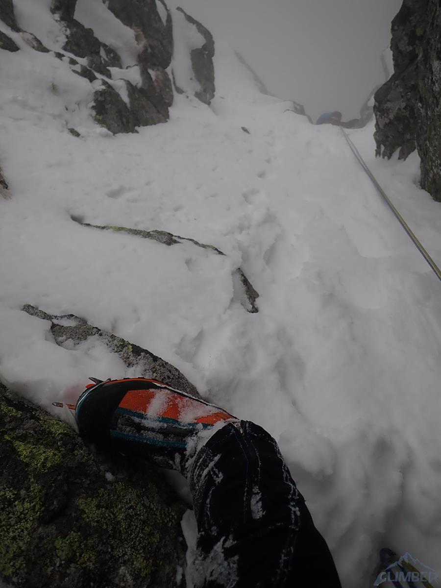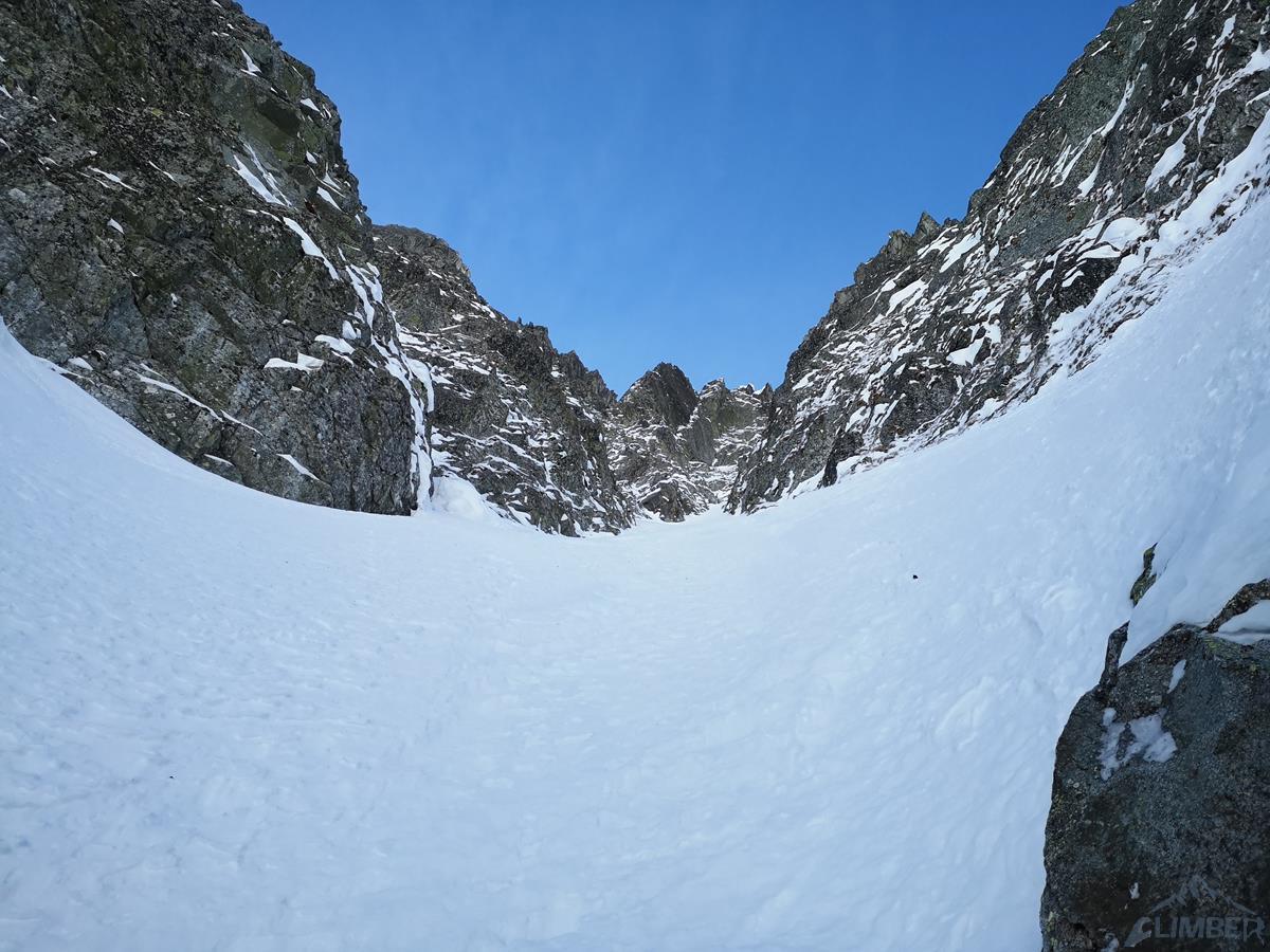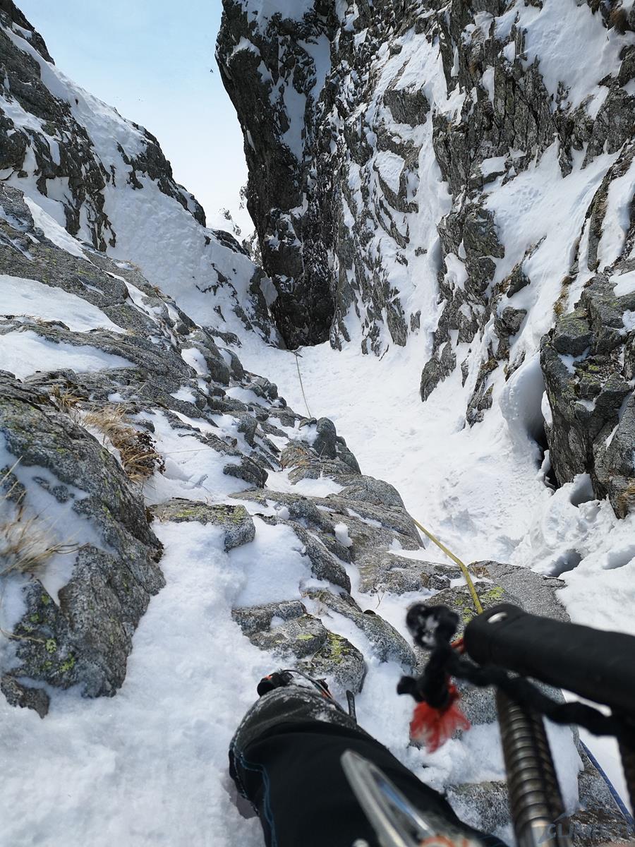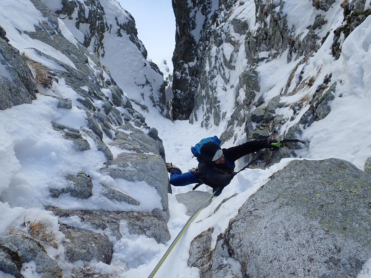 Pogoda rano jest kapitalna, trochę nas to rozleniwia i podchodzimy niezbyt szybko podziwiając widoki i wypatrując celów na przyszłość. Gdy już docieramy pod naszą drogę, okazuje się, że warunki w dolnej części (żlebie) są kapitalne, przebiegamy je więc bardzo szybko. Niestety od początku komina śnieg jest fatalny - miejscami luźny i sypki, miejscami zbity w miękkie mury odgradzające przejście. Lodu brak, mnóstwo luźnych kamieni, niektóre dość pokaźne, uniki na drugiego były więc wskazane 😉. Szymon próbuje pierwszy trudny odcinek i po przejściu czujnej płyty nie daje rady na ściance, którą chcemy ominąć śnieżny nawis. Ja pokonuję ten fragment nie bez problemów, na dodatek okazuje się, że po nim są jeszcze dwa niebanalne progi w podobnie niesprzyjających warunkach. Mimo tego iż trudności pokonujemy bardzo powoli, postanawiamy jednak się nie wycofywać i sięgnąć po swoje rezerwy - w dobrych warunkach na drodze zimą można spotkać odcinki do M5, tym razem było nieco trudniej.
