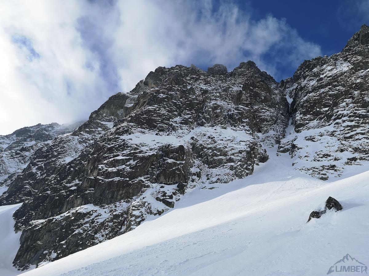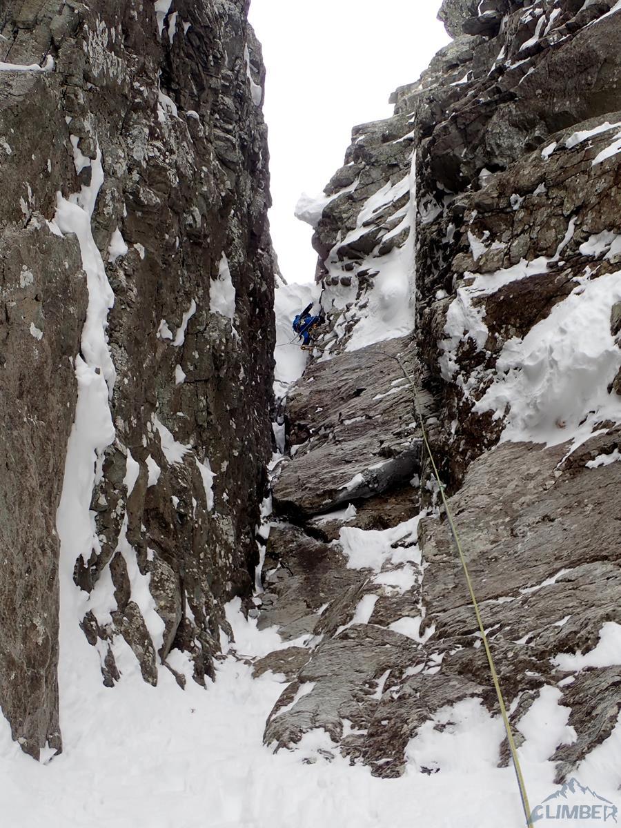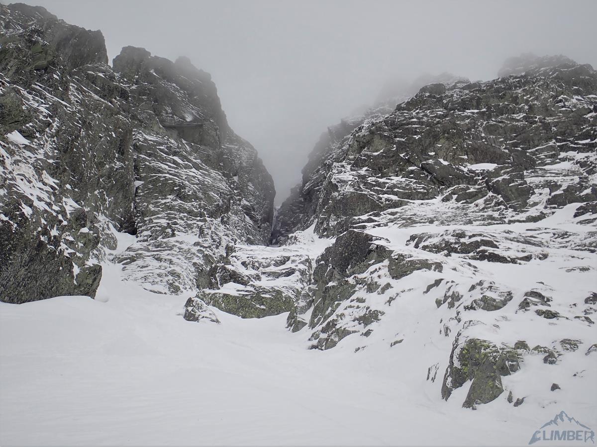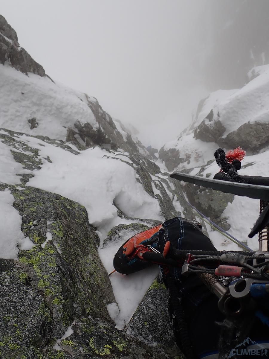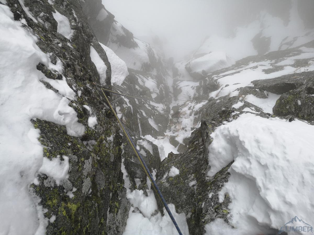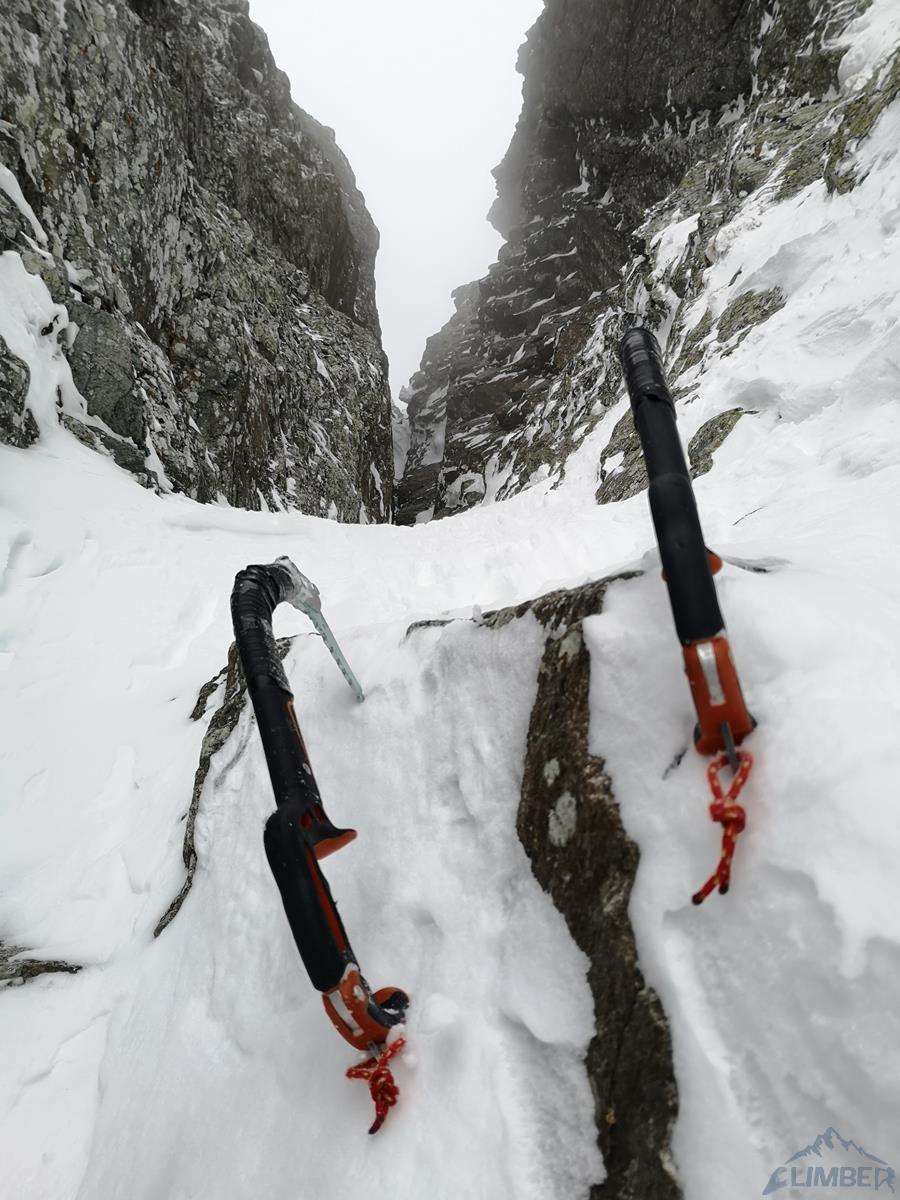Pogoda rano jest kapitalna, trochę nas to rozleniwia i podchodzimy niezbyt szybko podziwiając widoki i wypatrując celów na przyszłość. Gdy już docieramy pod naszą drogę, okazuje się, że warunki w dolnej części (żlebie) są kapitalne, przebiegamy je więc bardzo szybko. Niestety od początku komina śnieg jest fatalny - miejscami luźny i sypki, miejscami zbity w miękkie mury odgradzające przejście. Lodu brak, mnóstwo luźnych kamieni, niektóre dość pokaźne, uniki na drugiego były więc wskazane 😉. Szymon próbuje pierwszy trudny odcinek i po przejściu czujnej płyty nie daje rady na ściance, którą chcemy ominąć śnieżny nawis. Ja pokonuję ten fragment nie bez problemów, na dodatek okazuje się, że po nim są jeszcze dwa niebanalne progi w podobnie niesprzyjających warunkach. Mimo tego iż trudności pokonujemy bardzo powoli, postanawiamy jednak się nie wycofywać i sięgnąć po swoje rezerwy - w dobrych warunkach na drodze zimą można spotkać odcinki do M5, tym razem było nieco trudniej.