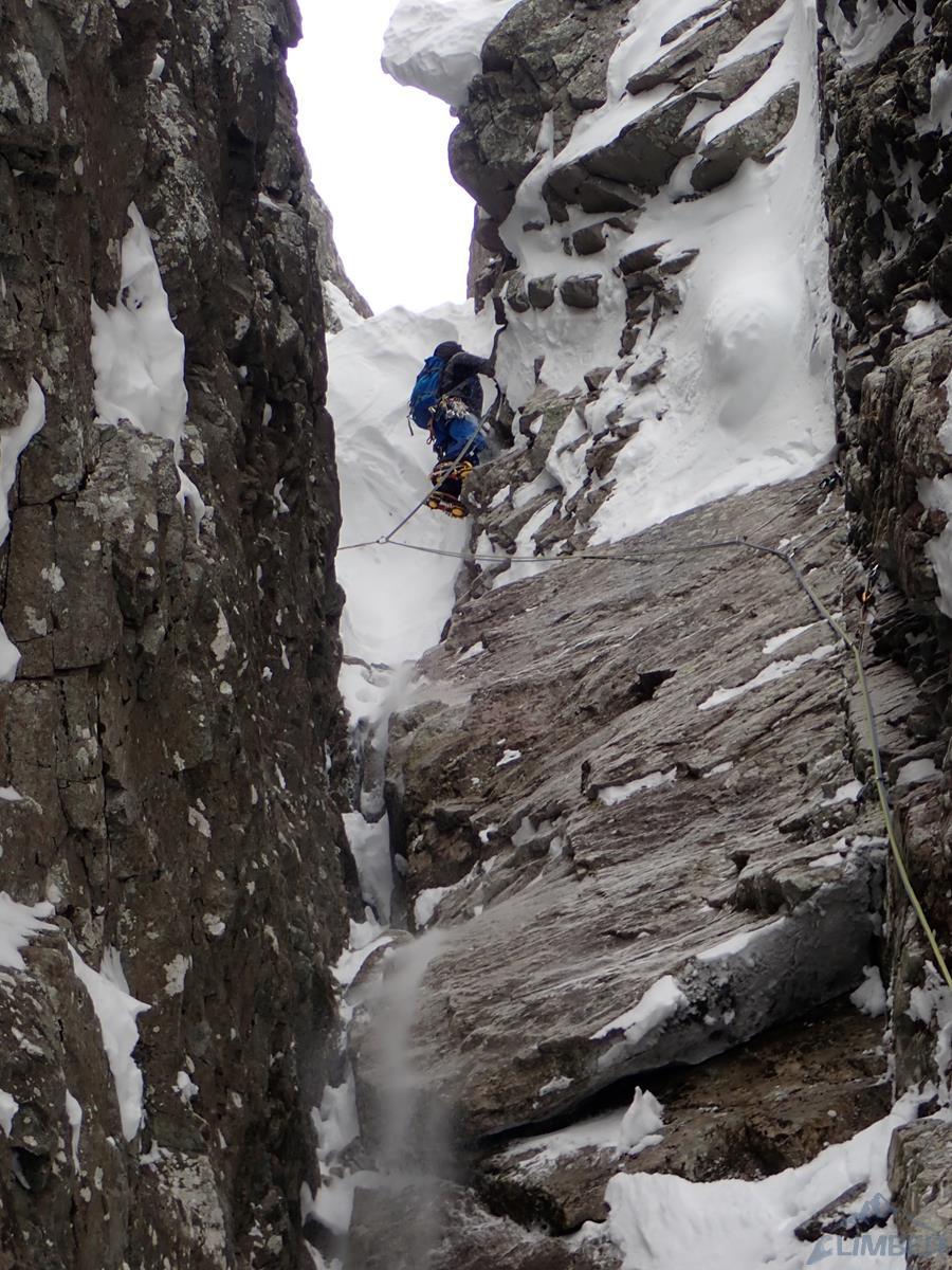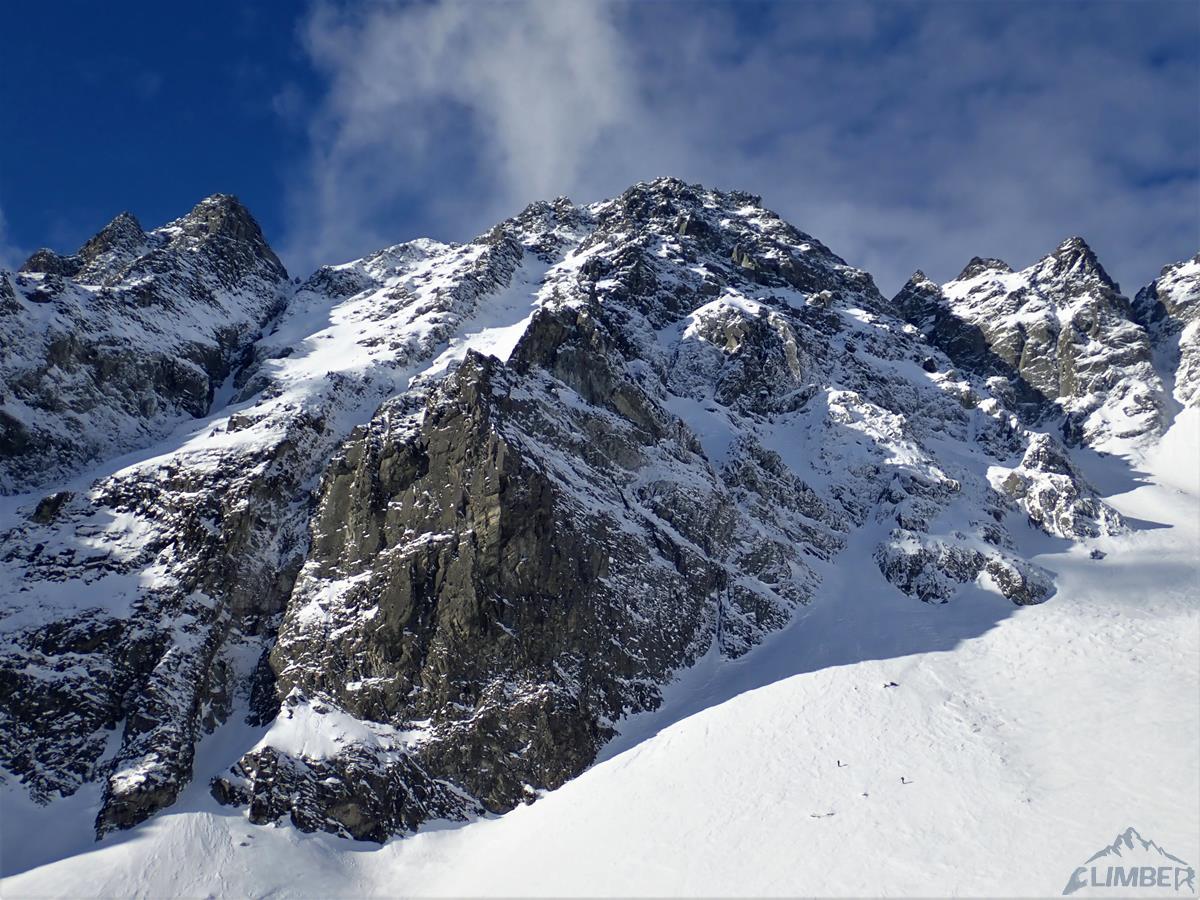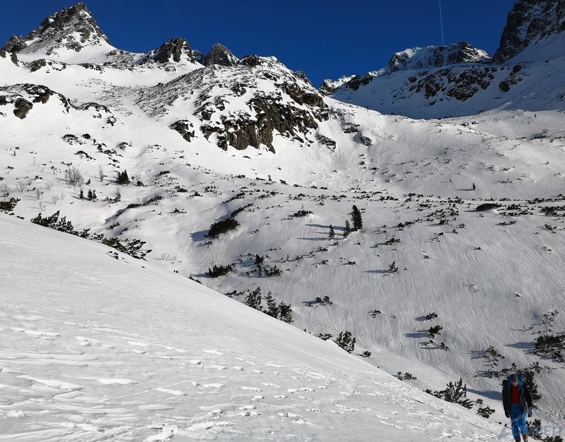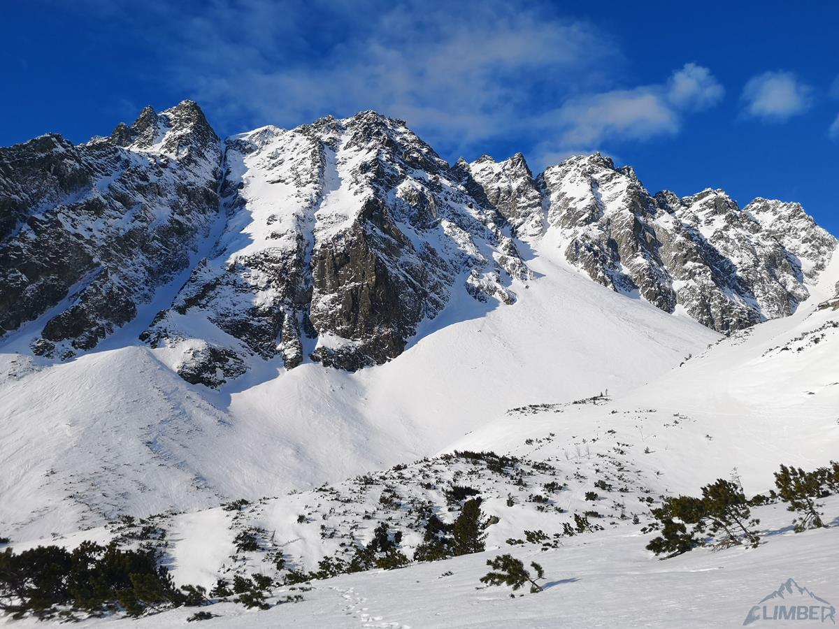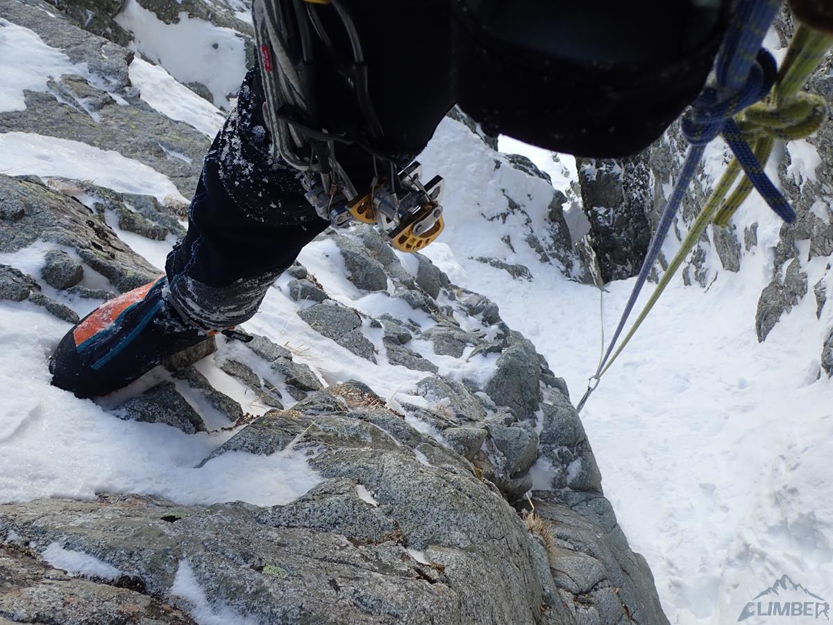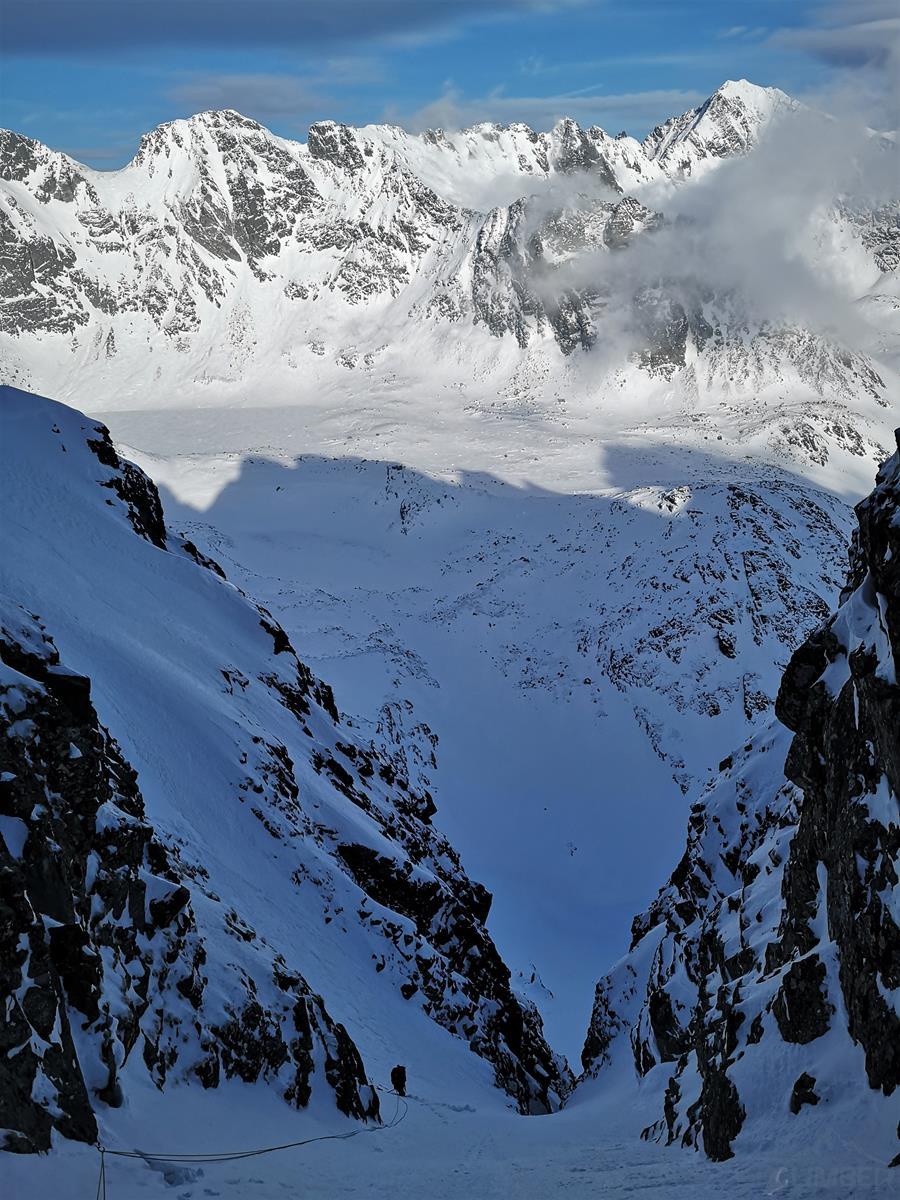 Pogoda rano jest kapitalna, trochę nas to rozleniwia i podchodzimy niezbyt szybko podziwiając widoki i wypatrując celów na przyszłość. Gdy już docieramy pod naszą drogę, okazuje się, że warunki w dolnej części (żlebie) są kapitalne, przebiegamy je więc bardzo szybko. Niestety od początku komina śnieg jest fatalny - miejscami luźny i sypki, miejscami zbity w miękkie mury odgradzające przejście. Lodu brak, mnóstwo luźnych kamieni, niektóre dość pokaźne, uniki na drugiego były więc wskazane 😉. Szymon próbuje pierwszy trudny odcinek i po przejściu czujnej płyty nie daje rady na ściance, którą chcemy ominąć śnieżny nawis. Ja pokonuję ten fragment nie bez problemów, na dodatek okazuje się, że po nim są jeszcze dwa niebanalne progi w podobnie niesprzyjających warunkach. Mimo tego iż trudności pokonujemy bardzo powoli, postanawiamy jednak się nie wycofywać i sięgnąć po swoje rezerwy - w dobrych warunkach na drodze zimą można spotkać odcinki do M5, tym razem było nieco trudniej.