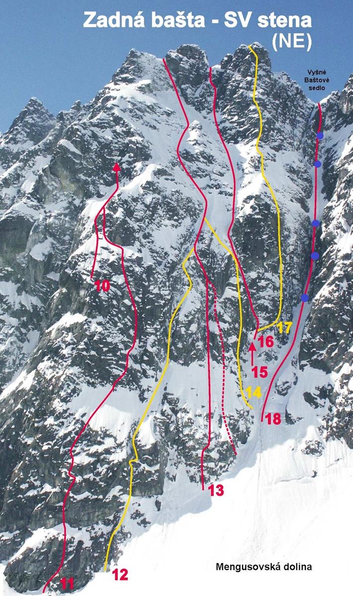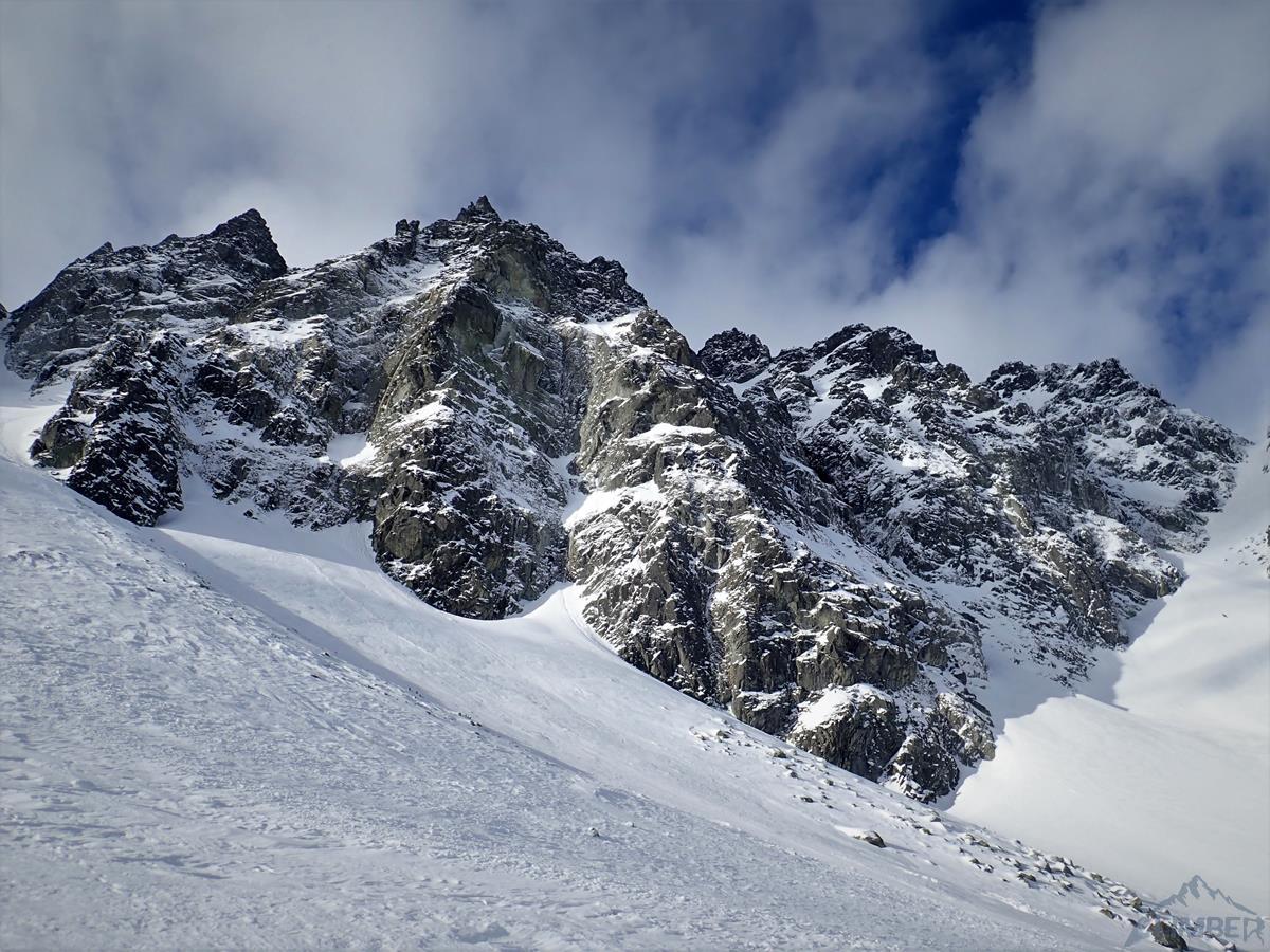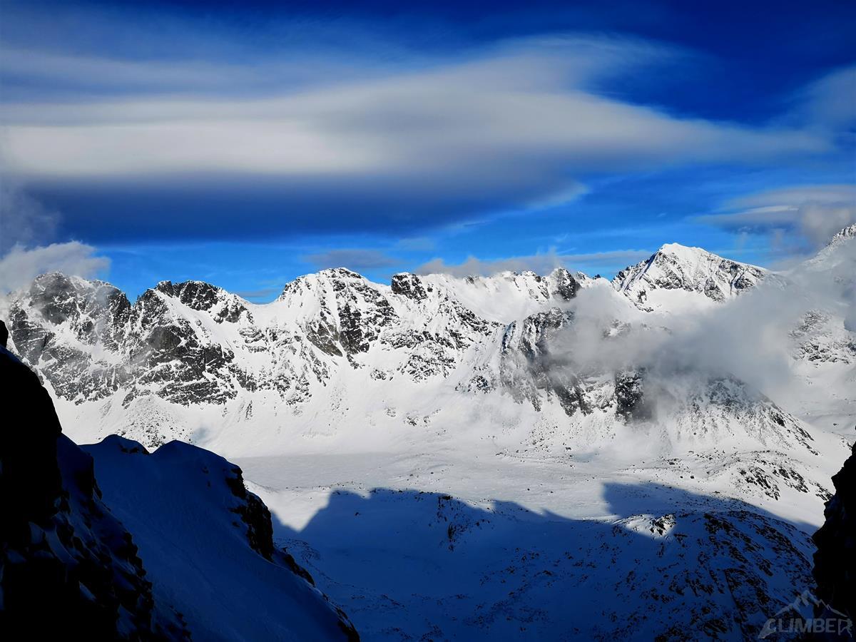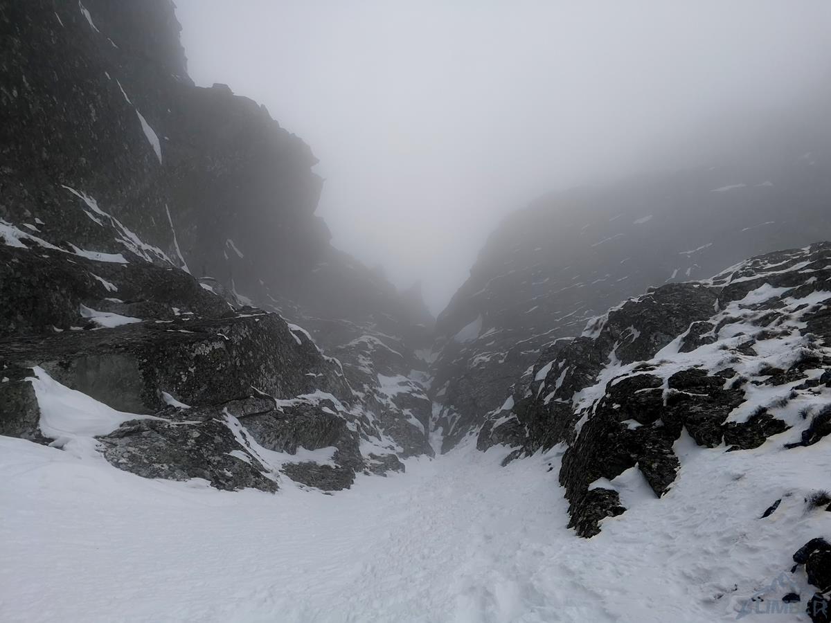Po przejściu pola śnieżnego nad progami dochodzimy do kominów wyjściowych i żmudna praca trwa - na skalnych odcinkach sporo wspinania na rękach, w połogach odśnieżanie i szukanie kępek trawy. W końcu przed zmrokiem, po 5 godzinach wspinania, docieramy do Wyżniej Basztowej Przełęczy. Tutaj zabawa się nie kończy - czeka nas wejście granią na szczyt, a pogoda zgodnie z zapowiedziami pogarsza się z minuty na minutę. Gdy docieramy na szczyt robi się ciemno, wieje i sypie, a widoczność spada do kilku metrów. Liczymy się z możliwością kopania domku na noc 😊. Okazuje się finalnie, że nie będzie to konieczne - cierpliwie (3 godziny) sprawdzamy kolejne żleby, aż w końcu trafiamy na ten właściwy, sprowadzający do Doliny Młynickiej. A przy małym armagedonie, który się rozpętał nawet odnalezienie szlaku na dole łatwe się nie okazuje... "Delikatnie" zmęczeni schodzimy ok. 23-ej do Szczyrbskiego Plesa, a następnie torami człapiemy do auta pozostawionego przecież dolinę dalej - pod Popradzkim Stawem.