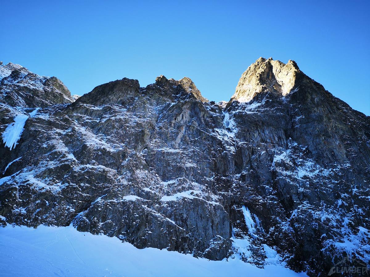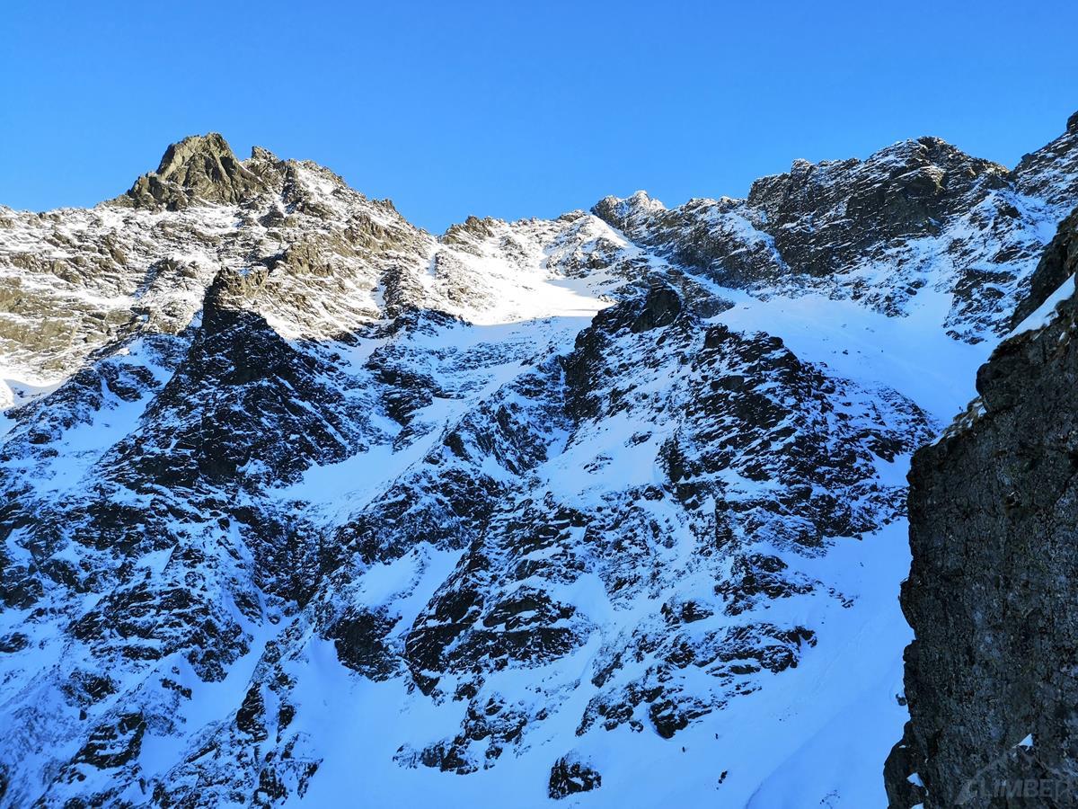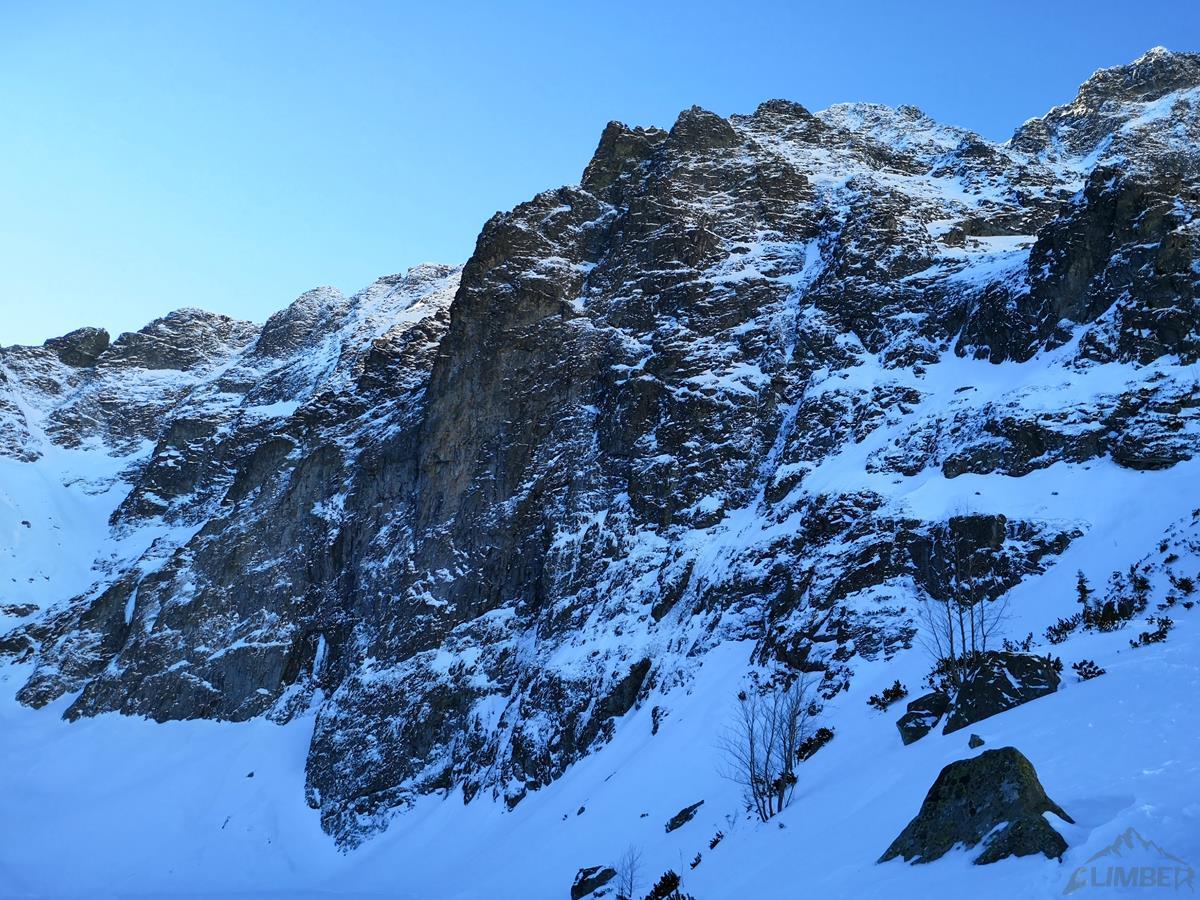 Pogoda jest kapitalna - lekko poniżej zera, brak wiatru, ani jednej chmury na lazurowym niebie. Jak zwykle szokuje mnie brak wspinaczy zimowych mimo takich warunków i niedzieli - wypatrujemy tylko jeden zespół na Czołówce MSW.