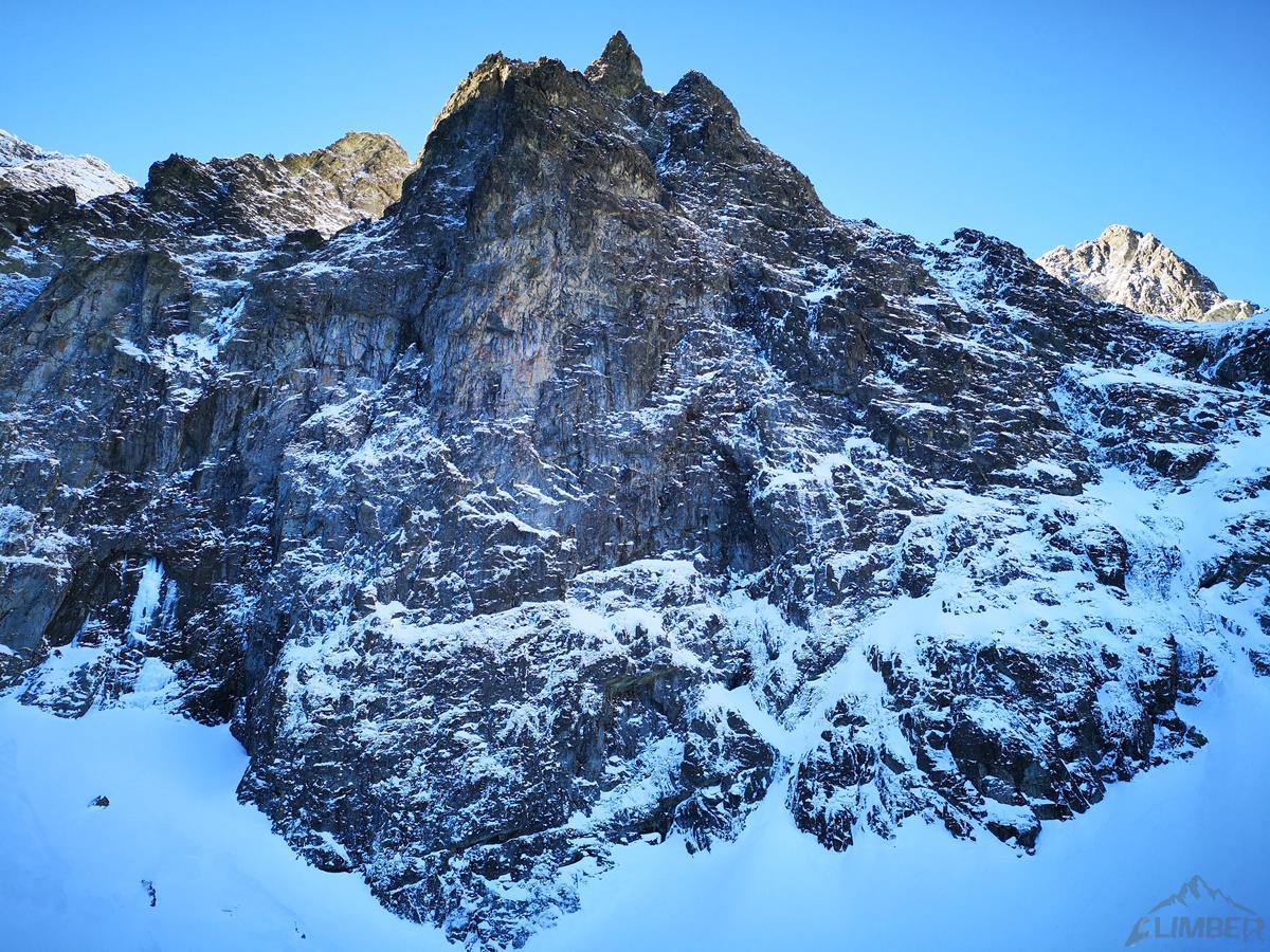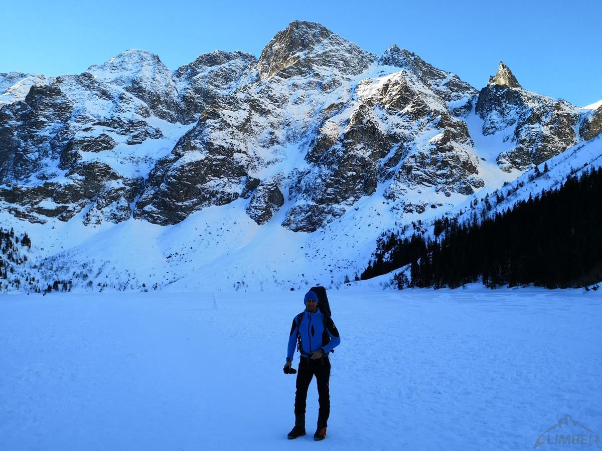 Pierwszy dzień obozu zimowego KW, za którego organizację ponownie odpowiadam. Po wyjątkowo szybkim dotarciu z bagażami do starego schroniska nad Morskim Okiem, pijemy z Szymonem kawkę i niespiesznie ruszamy w kierunku Czarnego Stawu. Na pierwszy ogień postanawiamy spróbować się na Cieniu Wielkiej Góry - drodze krótkiej i łatwej orientacyjnie, ale posiadającej jeden trudniejszy wyciąg, wyceniony oryginalnie na M6+ (obecnie od M5+ do M6-). Jest to jedna z najczęściej wybieranych dróg na Kotle Kazalnicy (a konkretnie Grzędzie Mięguszowieckiego Szczytu Czarnego) i stanowi dobre wprowadzenie do wspinania na tej ścianie.