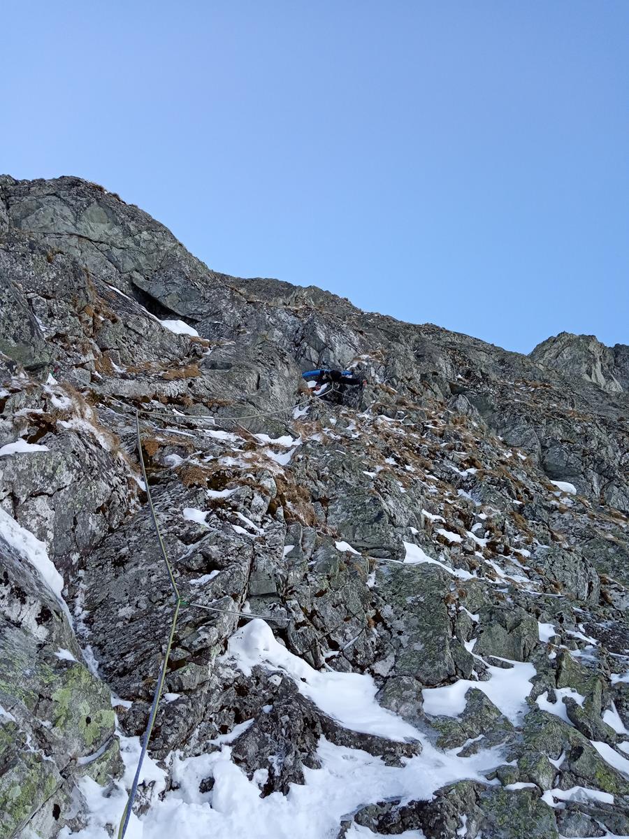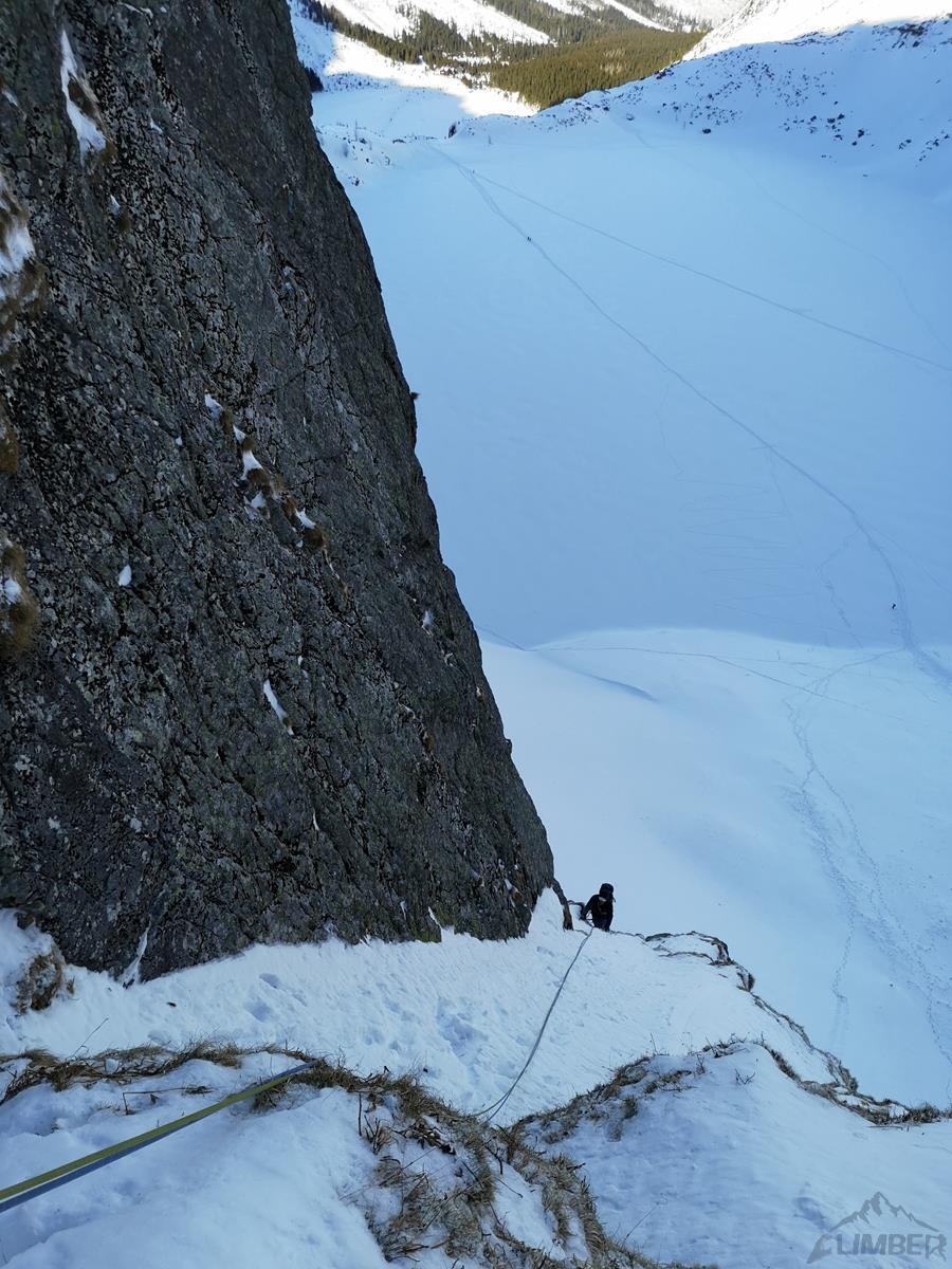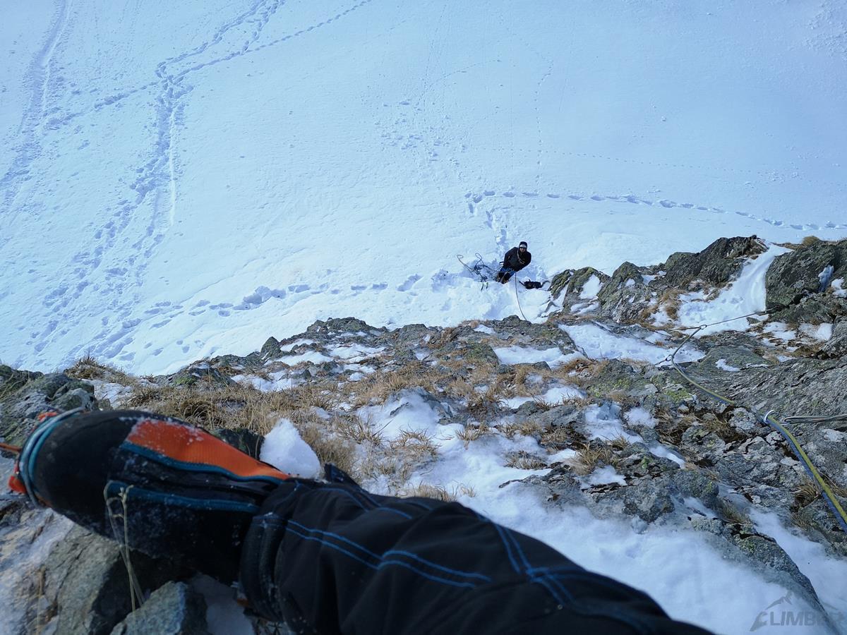 Drugi wyciąg przechodzę bardzo szybko - najpierw ładny trawkowy komin następnie 20 metrów po śniegu do kolejnego gotowego stanowiska. Prowadzenie przejmuje Szymon - na początek czeka go bardzo przyjemne skośne zacięcie, po czym podejście łatwiejszym terenem pod kolejny wyciąg. Dwa ostatnie wyciągi to szukanie łatwego terenu pomiędzy skalnymi ściankami - po piątym wyciągu droga kończy się na dużej półce. Wpinamy się do stanowiska zjazdowego i ruszamy w dół. Z ciekawości sprawdzam przy każdym zjeździe jak daleko można dojechać. Finalnie okazuje się, że ominąć można tylko przedostatnie stanowisko, z reszty trzeba skorzystać - wychodzą więc 4 zjazdy do ziemi.