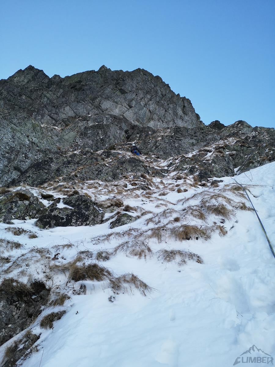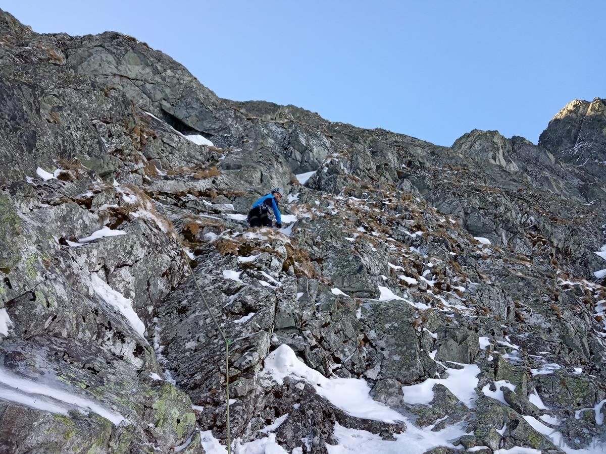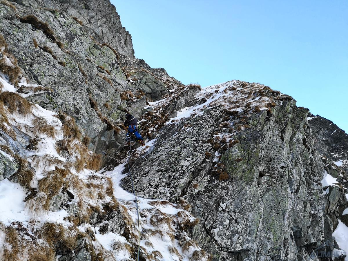 Drugi wyciąg przechodzę bardzo szybko - najpierw ładny trawkowy komin następnie 20 metrów po śniegu do kolejnego gotowego stanowiska. Prowadzenie przejmuje Szymon - na początek czeka go bardzo przyjemne skośne zacięcie, po czym podejście łatwiejszym terenem pod kolejny wyciąg. Dwa ostatnie wyciągi to szukanie łatwego terenu pomiędzy skalnymi ściankami - po piątym wyciągu droga kończy się na dużej półce. Wpinamy się do stanowiska zjazdowego i ruszamy w dół. Z ciekawości sprawdzam przy każdym zjeździe jak daleko można dojechać. Finalnie okazuje się, że ominąć można tylko przedostatnie stanowisko, z reszty trzeba skorzystać - wychodzą więc 4 zjazdy do ziemi.