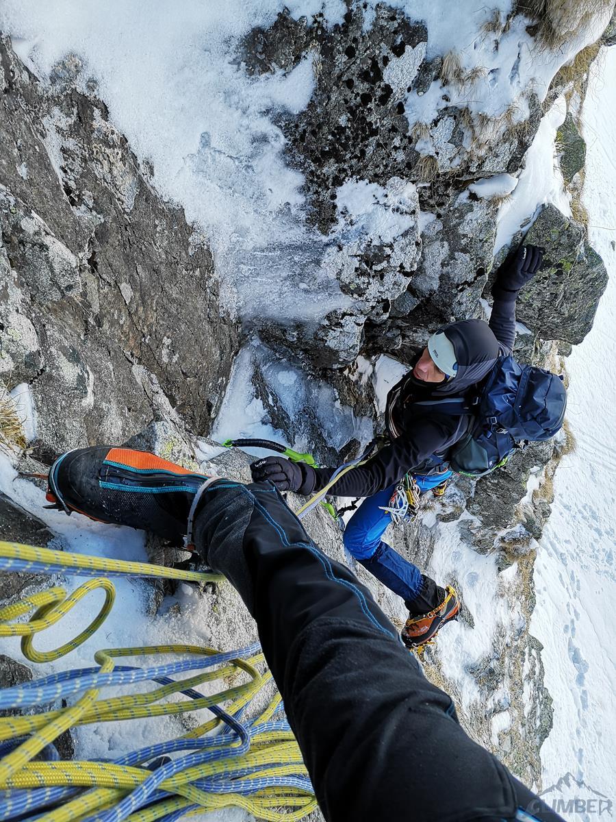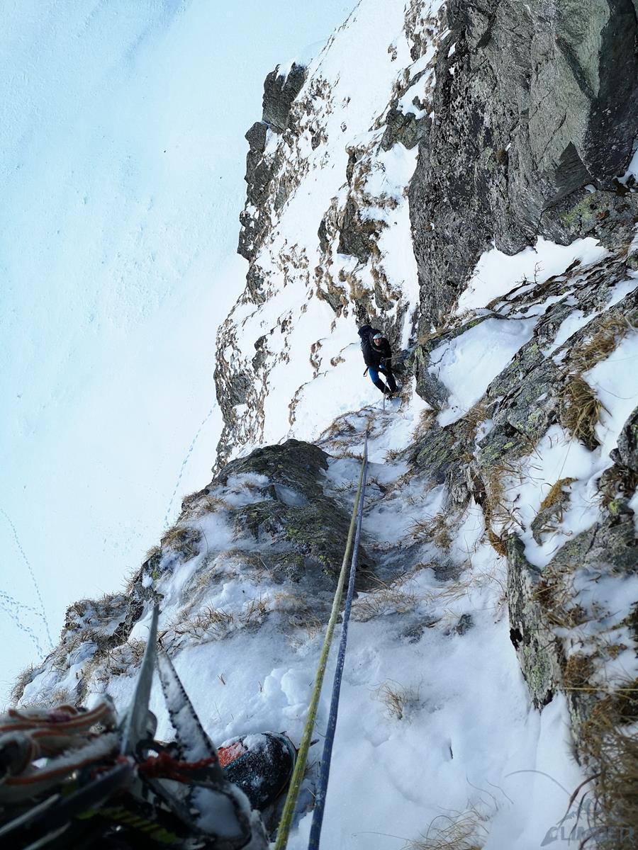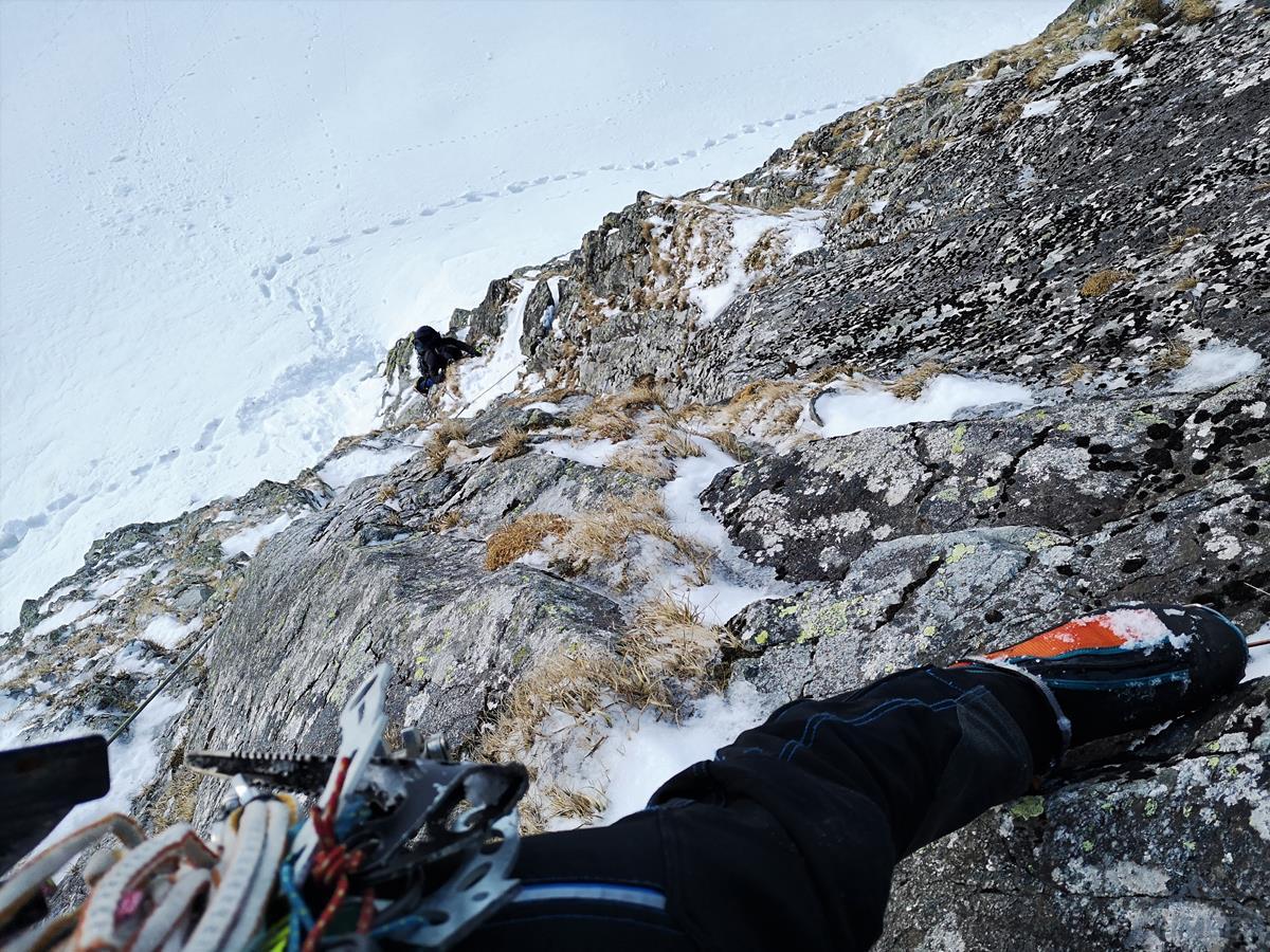 Wspinać zaczynamy się dopiero ok. 11-tej. Ruszam na pierwszy wyciąg trochę niepewnie - jest on najtrudniejszy na całej drodze, więc nie będzie okazji się rozwspinać. Pierwsze metry to bardzo fajne (do M5) wspinanie po płytkich trawkach porastających ścianki i małe depresje. Po przejściu tego odcinka i dojściu pod kluczowe trudności postanawiam skorzystać z zastanego stanowiska i ściągnąć w to miejsce partnera. Będzie miał mnie na oku gdy wejdę w cruxa... Po chwili ruszam w skalną załupę, asekuracja jest świetna (hak + rysa), wspinanie jest czysto drytoolowe - kilka fajnych ale czujnych ruchów w połogu i po wszystkim.