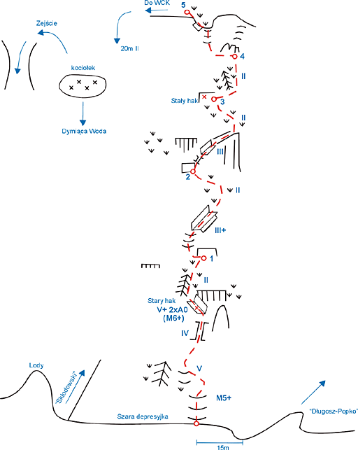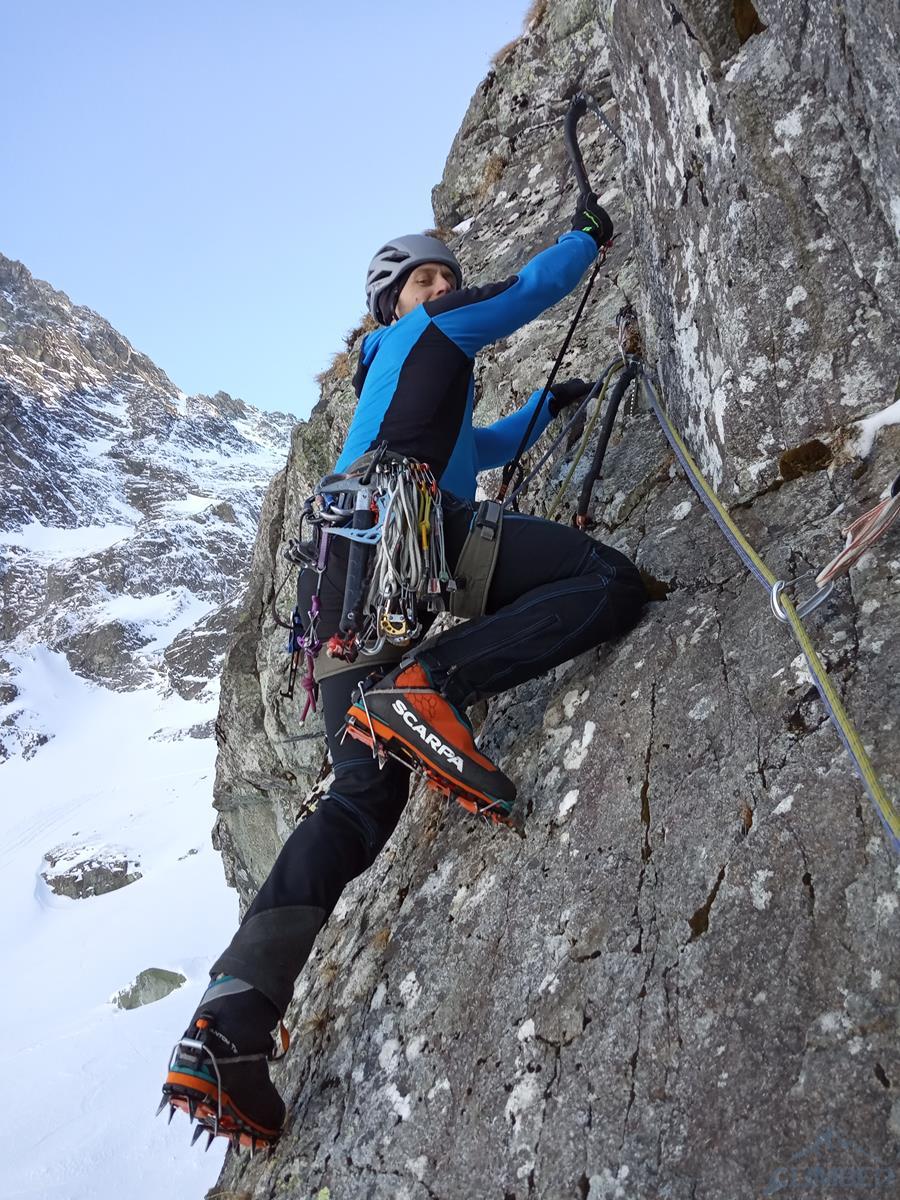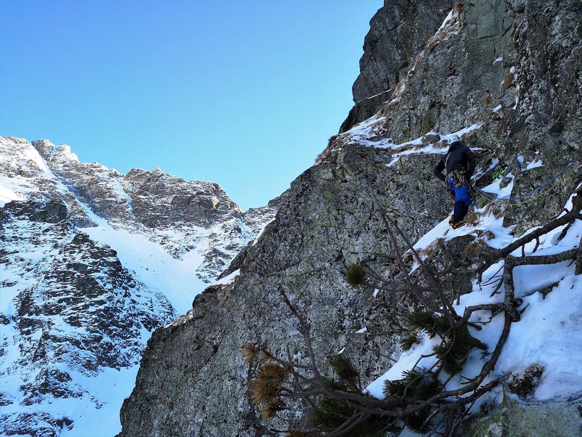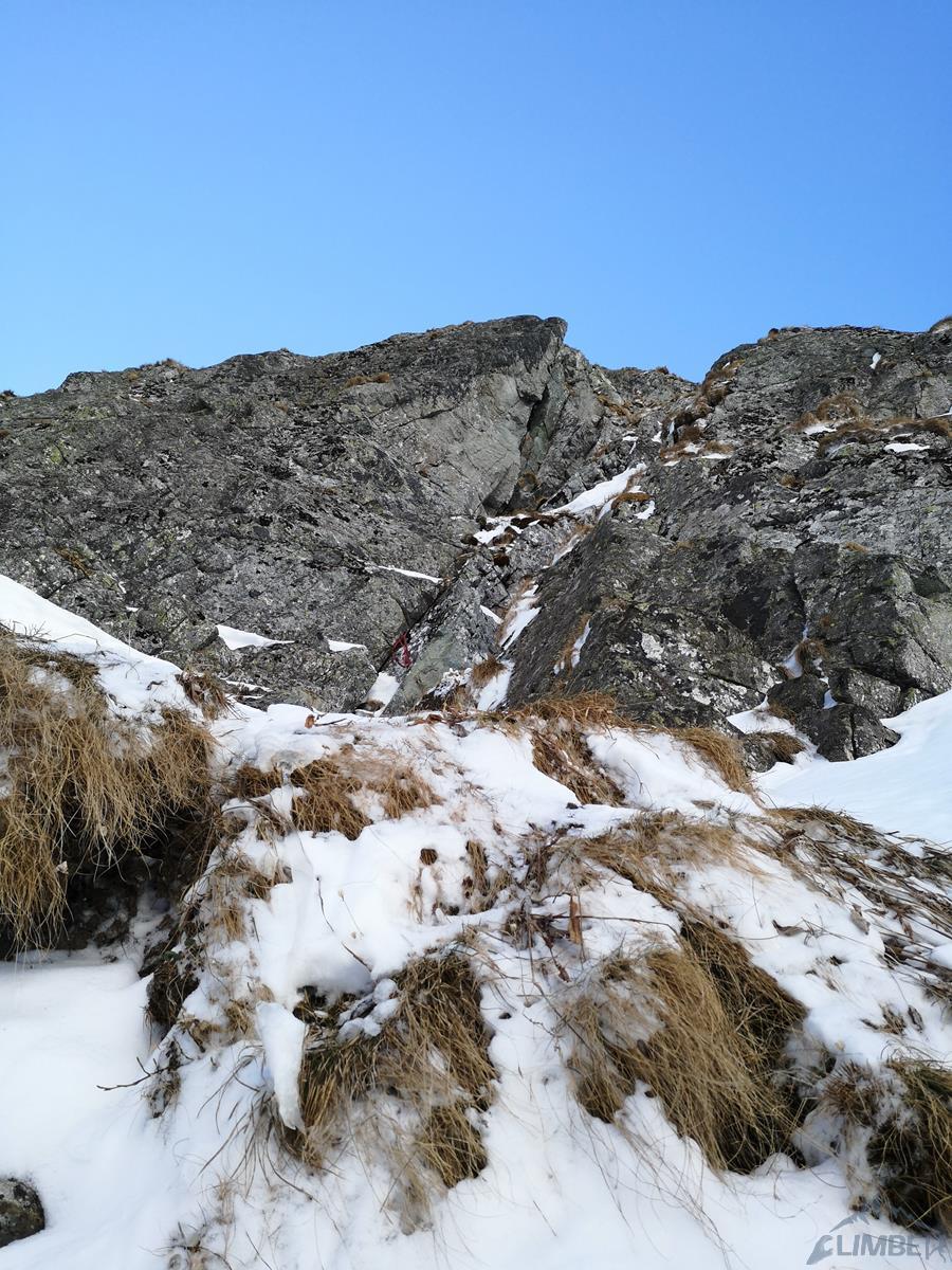 Wspinać zaczynamy się dopiero ok. 11-tej. Ruszam na pierwszy wyciąg trochę niepewnie - jest on najtrudniejszy na całej drodze, więc nie będzie okazji się rozwspinać. Pierwsze metry to bardzo fajne (do M5) wspinanie po płytkich trawkach porastających ścianki i małe depresje. Po przejściu tego odcinka i dojściu pod kluczowe trudności postanawiam skorzystać z zastanego stanowiska i ściągnąć w to miejsce partnera. Będzie miał mnie na oku gdy wejdę w cruxa... Po chwili ruszam w skalną załupę, asekuracja jest świetna (hak + rysa), wspinanie jest czysto drytoolowe - kilka fajnych ale czujnych ruchów w połogu i po wszystkim.