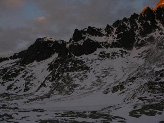 Po sobotnim wspinaniu na Smoczym i Wysokiej (o czym TUTAJ) następnego dnia fundujemy sobie jeszcze dłuższą wycieczkę – pod Lodowy Szczyt. Wschodnia wystawa trzeciego najwyższego szczytu nie jest zbyt popularna, wspinacze kolekcjonujący tatrzańskie ściany powinni się nią jednak zainteresować. Do najciekawszych propozycji z pewnością należy Filar Brnčala (V) oferujący całkiem sporo (400m) przystępnego wspinania kończącego się wyjściem wprost na wierzchołek. Droga ma nieco przygodowy charakter, nie znajdziemy na niej zbyt wiele haków, jej przebieg na kluczowych wyciągach jest jednak ewidentny, a asekuracja w trudnościach bardzo dobra – można więc śmiało zaliczyć ją do grona lepszych tatrzańskich piątek.