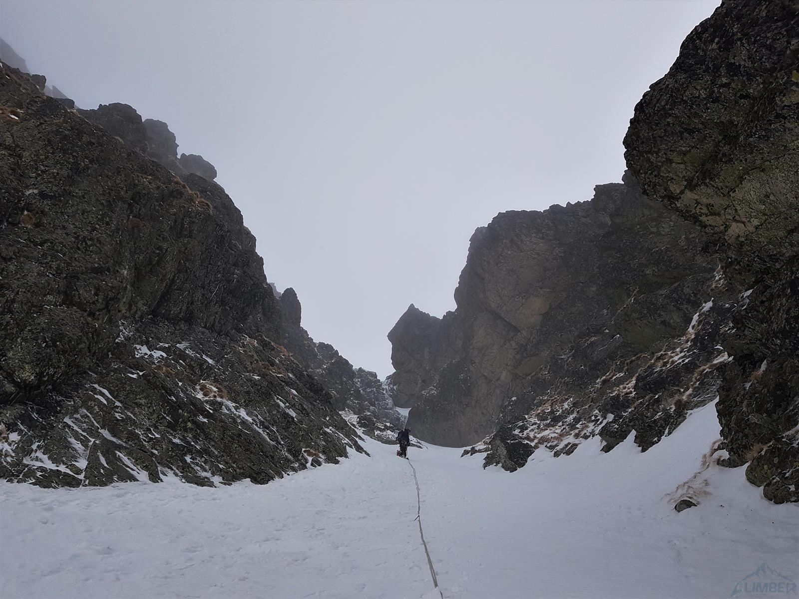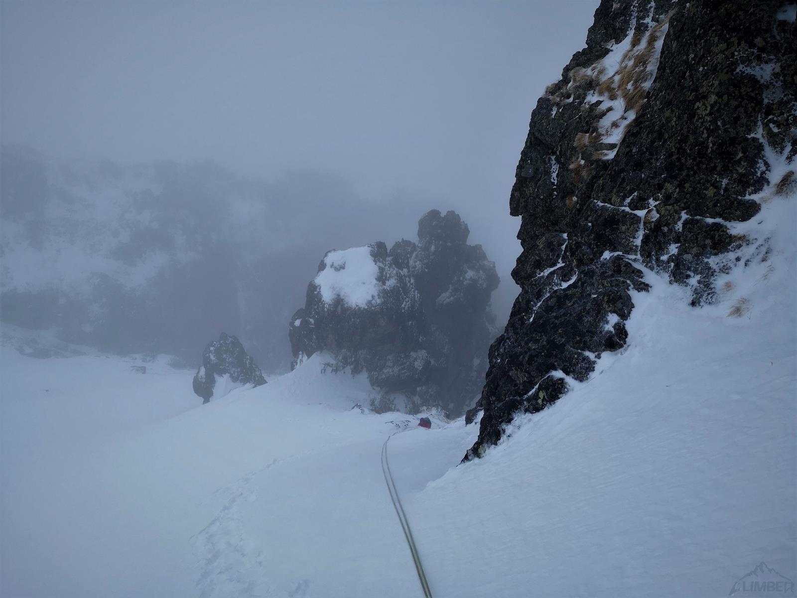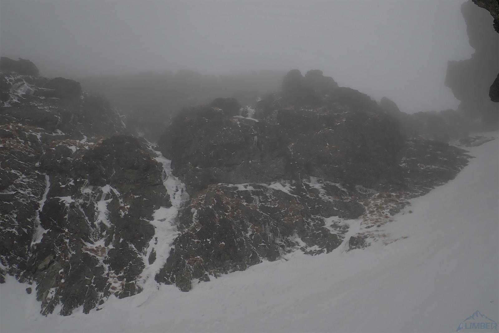Pokonujemy jeszcze jeden łatwiejszy odcinek lodowy i wchodzimy do kotła pod spiętrzeniem szczytowym Wielickiej Baszty. Kusi nitka lodowa biegnąca ścianą w kierunku szczytu, nie ma jednak ani czasu ani warunków by wybrać tą opcję. Kontynuujemy więc naszą linią i z kotła wchodzimy w śnieżny żleb, którym żmudnie pniemy się w górę. Trudności nie ma prawie żadnych, poza ostatnim progiem gdzie czeka nas trochę skały, lodu i trawy. Do przełączki kończącej drogę dochodzimy po 4 godzinach. Podchodzimy wyżej na Dwoisty Przechód i dalej na szczyt, niestety za dużo jednak nie widać bo chmury mocno gęstnieją. Asekurujemy się na lotnej, w kilku miejscach śnieg nie wzbudza zaufania, a nas czeka trawersowanie kotłów aż do Małej Wielickiej Strażnicy. Po 16-tej docieramy do Domu Śląskiego, jemy szybki obiad i łapiemy ostatni transport w dół na parking.