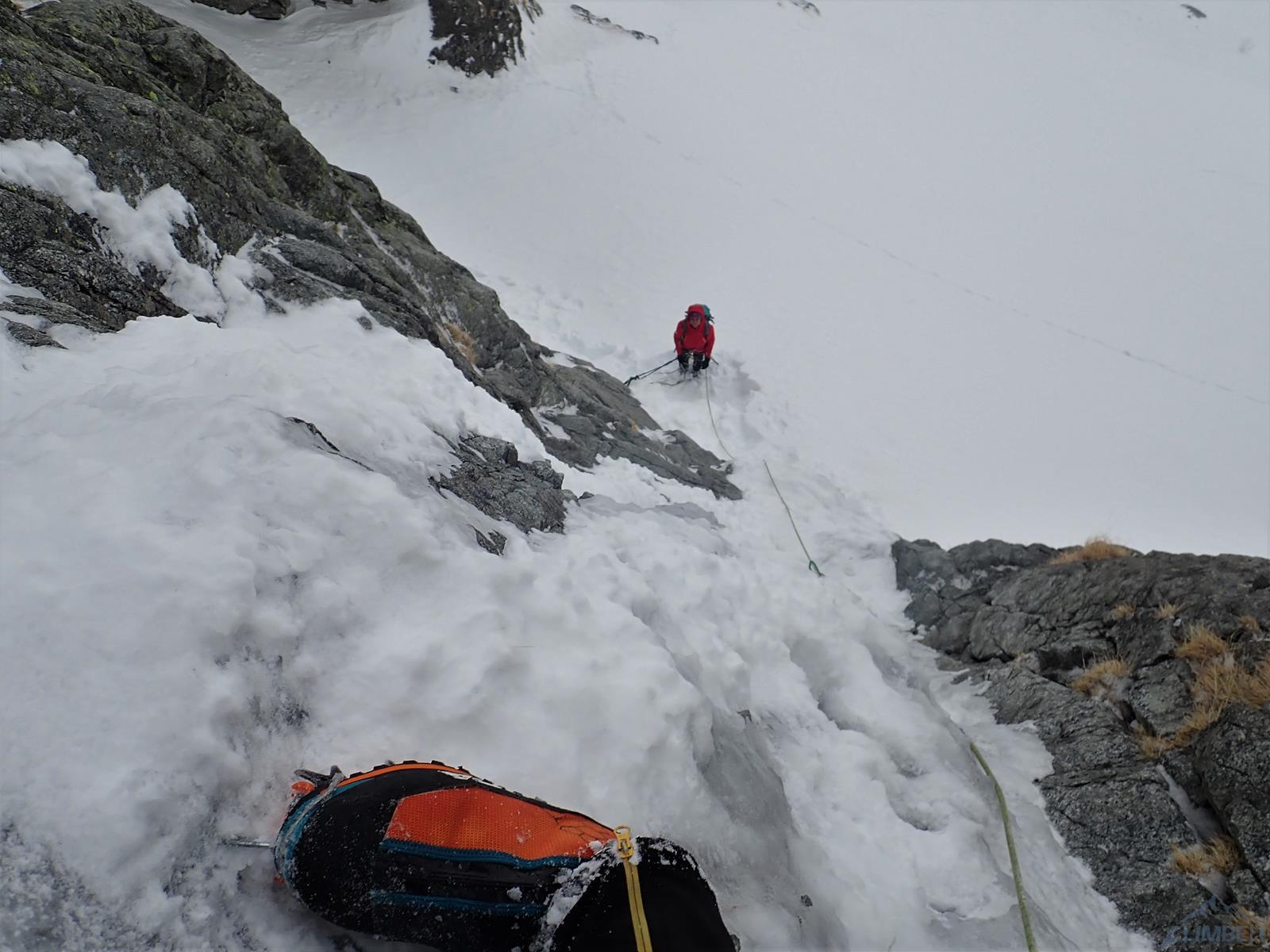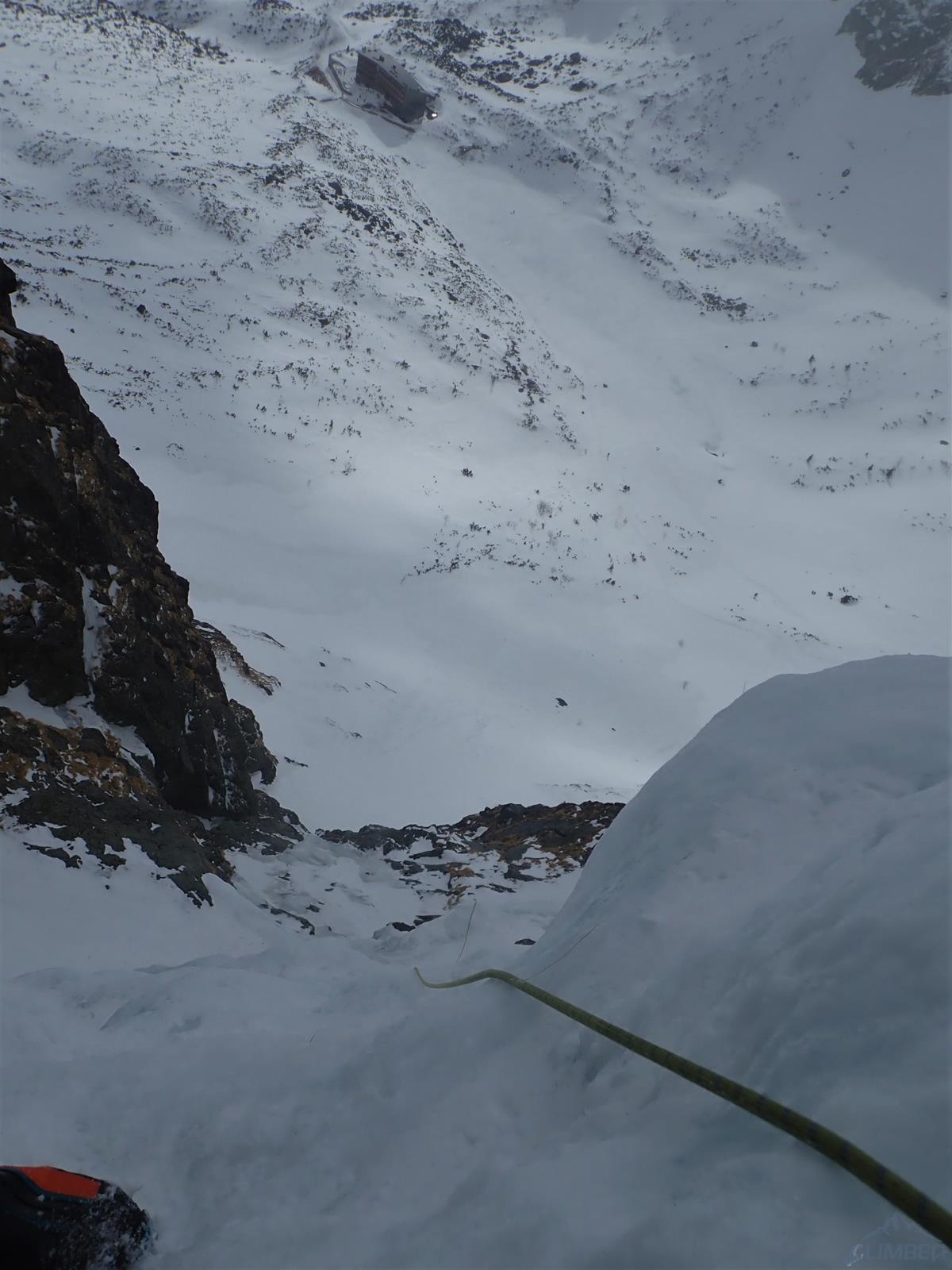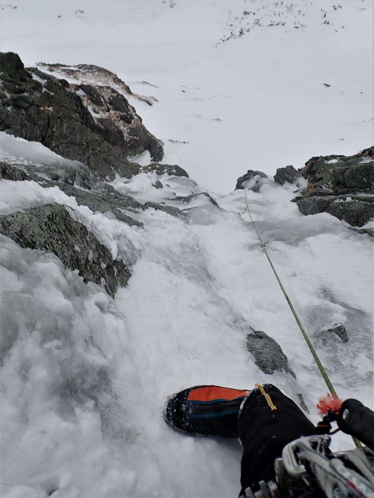 Pokonujemy jeszcze jeden łatwiejszy odcinek lodowy i wchodzimy do kotła pod spiętrzeniem szczytowym Wielickiej Baszty. Kusi nitka lodowa biegnąca ścianą w kierunku szczytu, nie ma jednak ani czasu ani warunków by wybrać tą opcję. Kontynuujemy więc naszą linią i z kotła wchodzimy w śnieżny żleb, którym żmudnie pniemy się w górę. Trudności nie ma prawie żadnych, poza ostatnim progiem gdzie czeka nas trochę skały, lodu i trawy. Do przełączki kończącej drogę dochodzimy po 4 godzinach. Podchodzimy wyżej na Dwoisty Przechód i dalej na szczyt, niestety za dużo jednak nie widać bo chmury mocno gęstnieją. Asekurujemy się na lotnej, w kilku miejscach śnieg nie wzbudza zaufania, a nas czeka trawersowanie kotłów aż do Małej Wielickiej Strażnicy. Po 16-tej docieramy do Domu Śląskiego, jemy szybki obiad i łapiemy ostatni transport w dół na parking.
