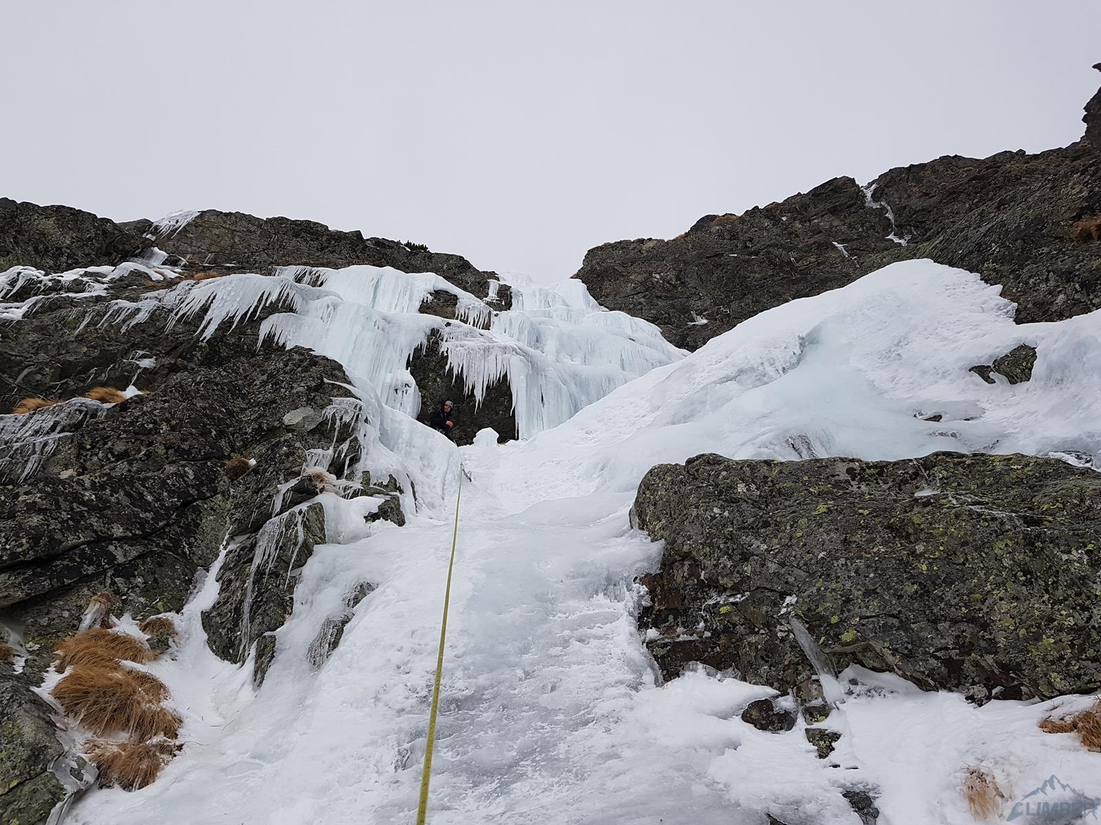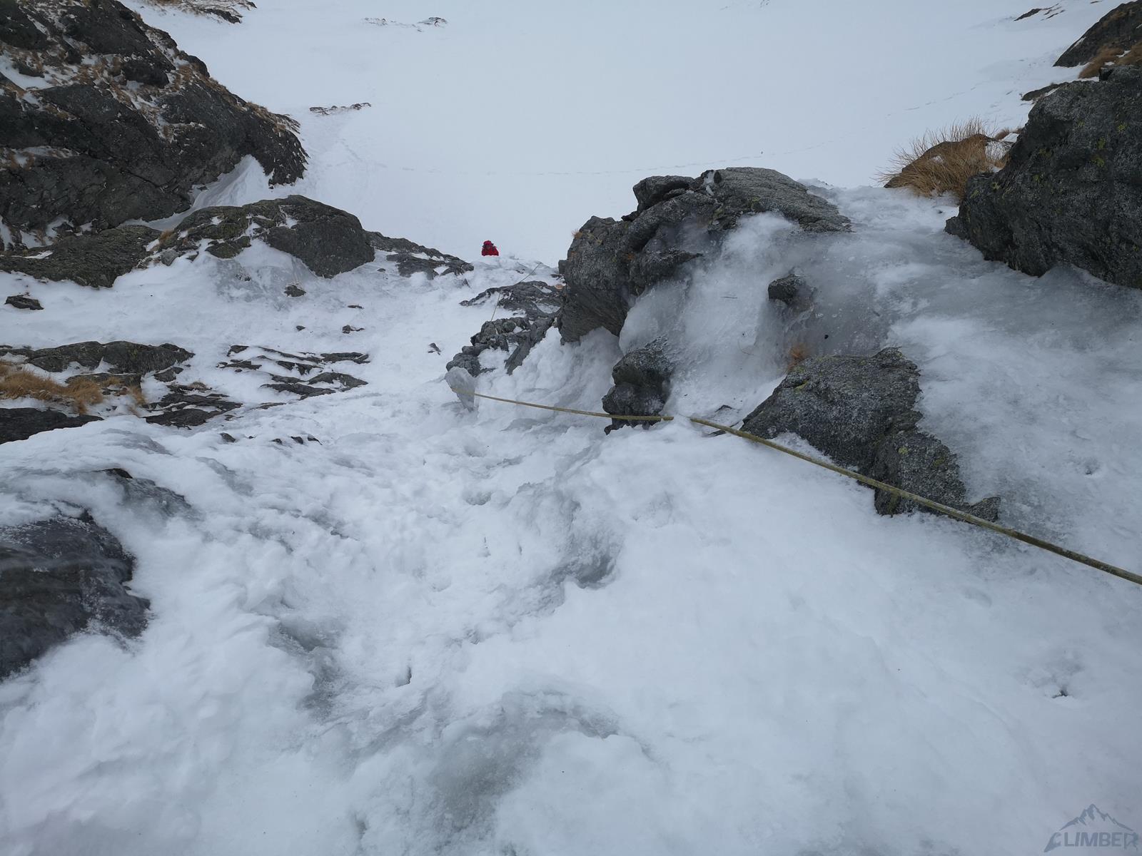 Na pierwszym wyciągu napotykamy miękki lód, miejscami trzeba wspinać się mikstowo, asekurując się również w skale. Idę prawie na całą długość liny i dochodzę do stanowiska ze spitów pod kolumną lodową. Ściągam Anię i proponuję wspinanie trudniejszym wariantem, wprost do góry – łatwiej byłoby bowiem obejść próg po lewej stronie. Po przejściu kolumny, wspinam się kolejnymi progami aż do kolejnego gotowego stanowiska (znowu prawie 60 metrów), zlokalizowanego pomiędzy lodowymi kurtynami.