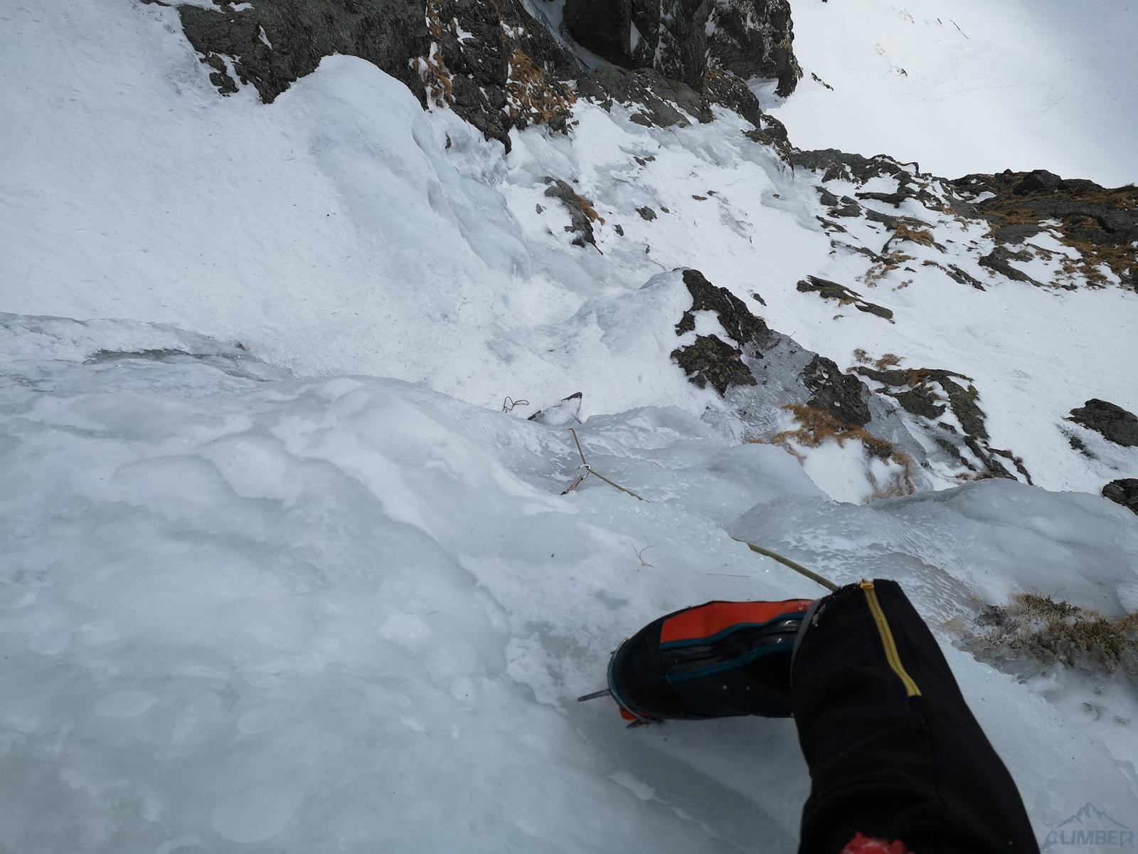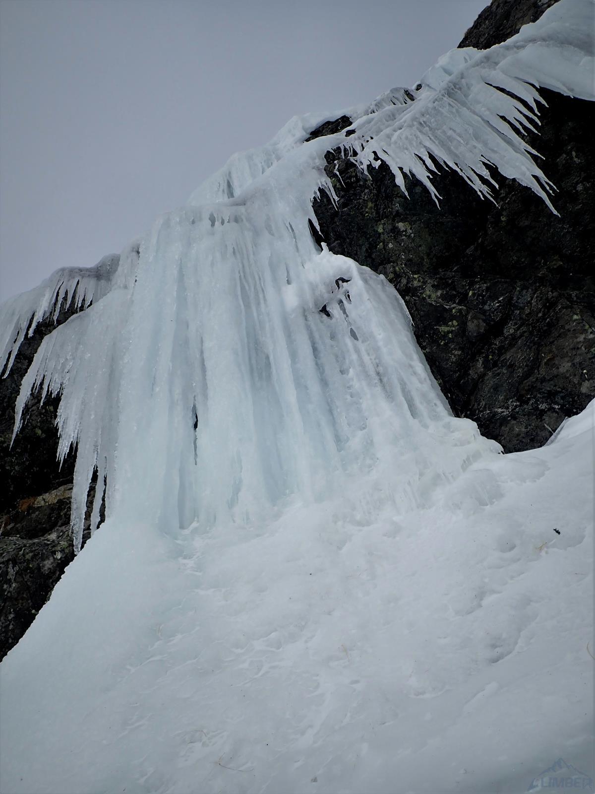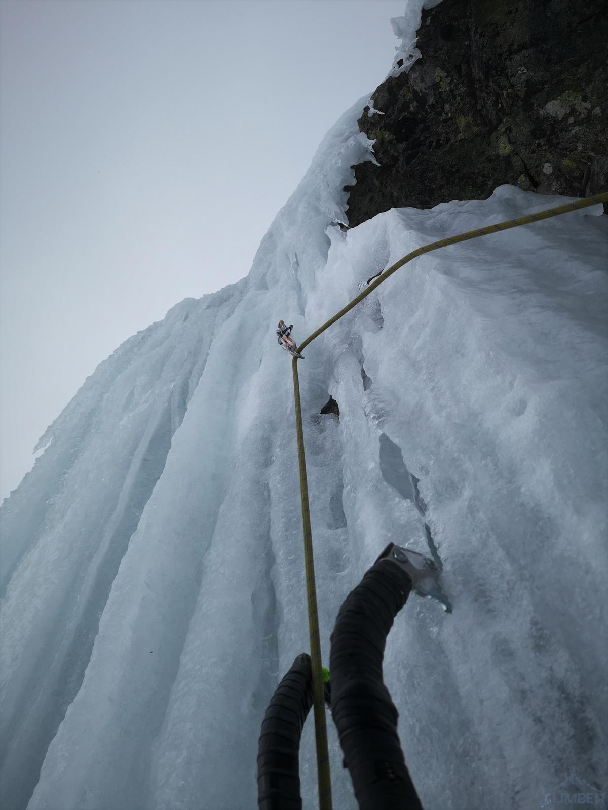 Tutaj ponownie wybieramy trudniejszy wariant (ok. WI4), kolumna okazuje się jednak bardzo nieprzyjemna, kształt kaloryfera oferuje dobre chwyty ale słabe stopnie – ciężko gdziekolwiek zabić raki. Na dodatek mam ostrza mikstowe, grube i mocno stępione po tygodniu wspinania… Robię kilka ruchów i w najsłabszym miejscu jedna dziaba wyrywa lód, druga wyskakuje, a skoro nogi nie mają dobrego podparcia oznacza to szybki powrót w okolice stanowiska 😊. Asekurantka jest jednak dobra, a ekspres wysyłowy wpięty jest do spita stanowiskowego, nie ma więc żadnych konsekwencji tego nieplanowanego wylotu. Za drugim podejściem wspinam się dużo ostrożniej i bardzo mocno zabijam dziaby, a po chwili jestem po trudnościach. Łatwe pole lodowe doprowadza pod piękny lodowy welon, nad którym znajduję kolejne stanowisko.
